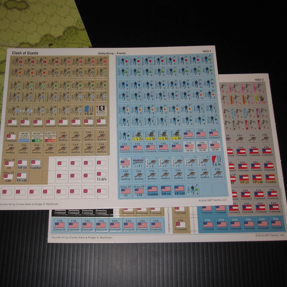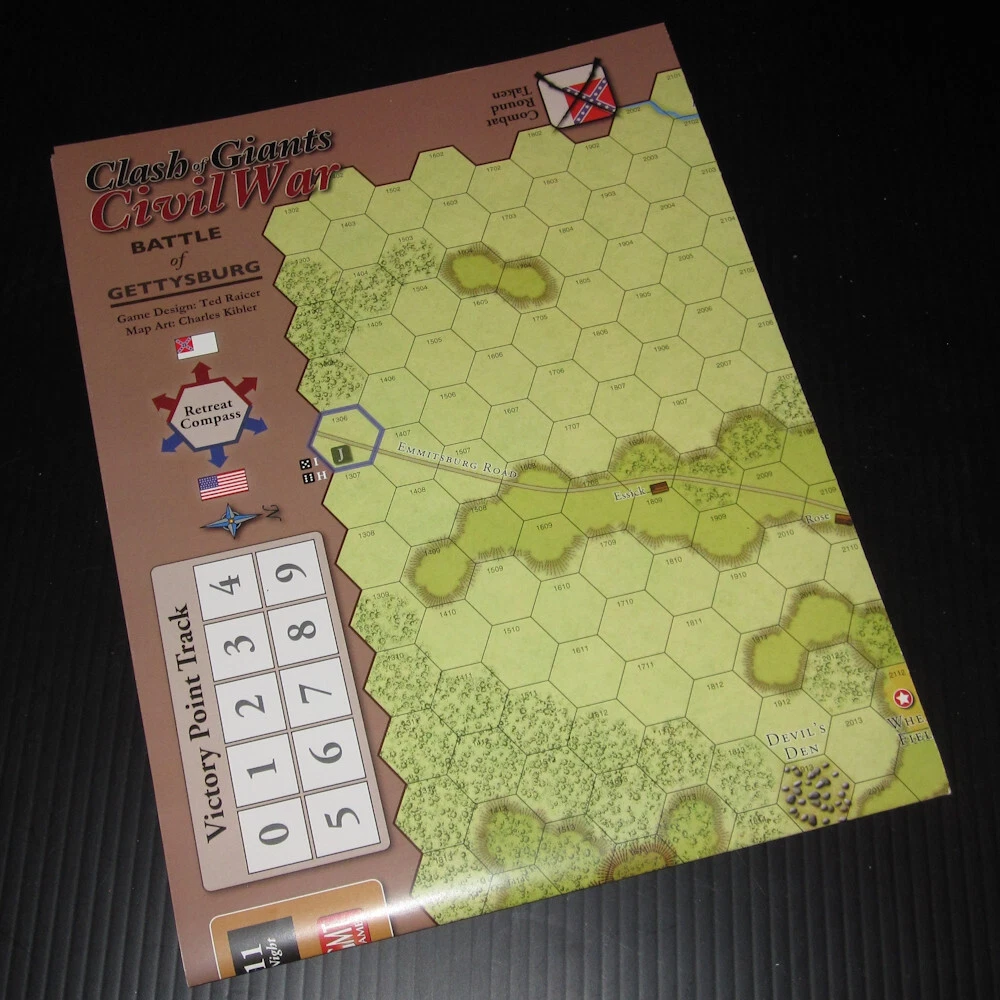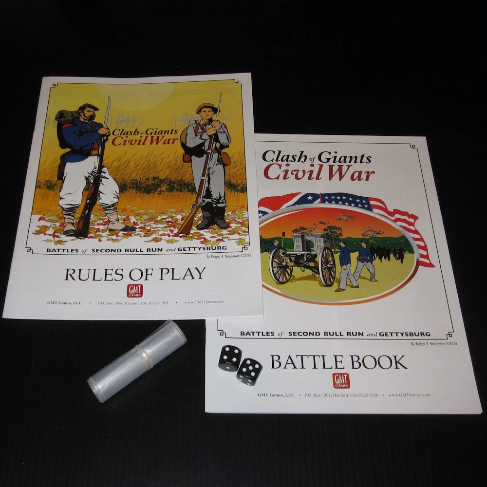 Unpunched GMT Games ***CLASH OF GIANTS: CIVIL WAR*** 2016 Battle of Gettysburg Second Bull Run Wargame 1603 Complete with all game components in excellent (near mint) condition. Box is in excellent condition. Includes: box double sided game map 4x charts/player aid cards 2x unpunched counter sheets 2x d6 dice storage bags 2x rules booklets Free USPS ground advantage shipping in the USA; thanks for looking!