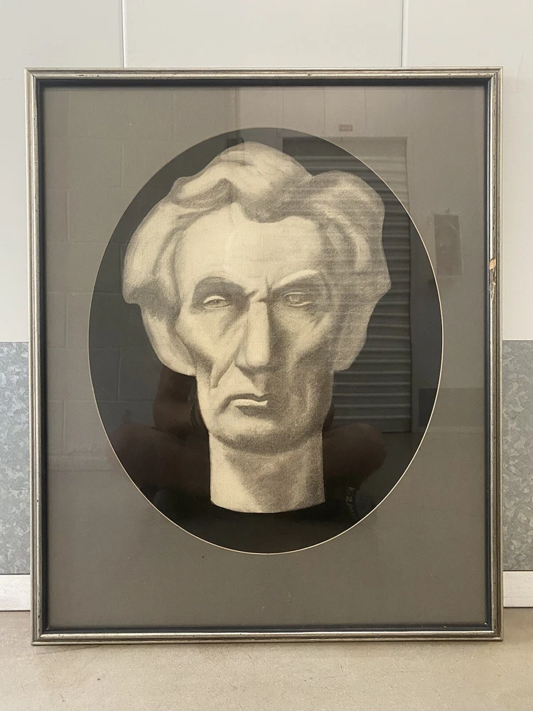 This is an expressive and Unusual Antique American Civil War Abraham LINCOLN Portrait Drawing Painting, likely dating to the 1940's - 1950's. This piece depicts a very stoic bust-like portrait of a young Abraham Lincoln (1809 - 1865) in stark black, gray, and white, rendered in charcoal on thick woven paper. This portrait is portrayed against a stark black background, with an ovoid dark gray matting and silvered vintage wood frame. The overall appearance of these elements creates a very captivating image, which may have been a maquette for a marble bust of this legendary American President. This piece appears to be unsigned, but perhaps you recognize the artist or their work? An old framer's label on the verso reads: "Lincoln Park...Chicago, Illinois." Approximately 20 1/8 x 24 1/4 inches (including frame.) Actual visible artwork is approximately 15 x 18 inches. Very good condition for age, with some moderate scuffing, chipping and edge wear to the vintage frame (please see photos.) Acquired in Los Angeles County, California. If you like what you see, I encourage you to make an Offer. Please check out my other listings for more wonderful and unique artworks! About this Artwork: Abraham Lincoln THE 16TH PRESIDENT OF THE UNITED STATES The biography for President Lincoln and past presidents is courtesy of the White House Historical Association. Abraham Lincoln became the United States’ 16th President in 1861, issuing the Emancipation Proclamation that declared forever free those slaves within the Confederacy in 1863. Lincoln warned the South in his Inaugural Address: “In your hands, my dissatisfied fellow countrymen, and not in mine, is the momentous issue of civil war. The government will not assail you…. You have no oath registered in Heaven to destroy the government, while I shall have the most solemn one to preserve, protect and defend it.” Lincoln thought secession illegal, and was willing to use force to defend Federal law and the Union. When Confederate batteries fired on Fort Sumter and forced its surrender, he called on the states for 75,000 volunteers. Four more slave states joined the Confederacy but four remained within the Union. The Civil War had begun. The son of a Kentucky frontiersman, Lincoln had to struggle for a living and for learning. Five months before receiving his party’s nomination for President, he sketched his life: “I was born Feb. 12, 1809, in Hardin County, Kentucky. My parents were both born in Virginia, of undistinguished families–second families, perhaps I should say. My mother, who died in my tenth year, was of a family of the name of Hanks…. My father … removed from Kentucky to … Indiana, in my eighth year…. It was a wild region, with many bears and other wild animals still in the woods. There I grew up…. Of course when I came of age I did not know much. Still somehow, I could read, write, and cipher … but that was all.” Lincoln made extraordinary efforts to attain knowledge while working on a farm, splitting rails for fences, and keeping store at New Salem, Illinois. He was a captain in the Black Hawk War, spent eight years in the Illinois legislature, and rode the circuit of courts for many years. His law partner said of him, “His ambition was a little engine that knew no rest.” He married Mary Todd, and they had four boys, only one of whom lived to maturity. In 1858 Lincoln ran against Stephen A. Douglas for Senator. He lost the election, but in debating with Douglas he gained a national reputation that won him the Republican nomination for President in 1860. As President, he built the Republican Party into a strong national organization. Further, he rallied most of the northern Democrats to the Union cause. On January 1, 1863, he issued the Emancipation Proclamation that declared forever free those slaves within the Confederacy. Lincoln never let the world forget that the Civil War involved an even larger issue. This he stated most movingly in dedicating the military cemetery at Gettysburg: “that we here highly resolve that these dead shall not have died in vain–that this nation, under God, shall have a new birth of freedom–and that government of the people, by the people, for the people, shall not perish from the earth.” Lincoln won re-election in 1864, as Union military triumphs heralded an end to the war. In his planning for peace, the President was flexible and generous, encouraging Southerners to lay down their arms and join speedily in reunion. The spirit that guided him was clearly that of his Second Inaugural Address, now inscribed on one wall of the Lincoln Memorial in Washington, D. C.: “With malice toward none; with charity for all; with firmness in the right, as God gives us to see the right, let us strive on to finish the work we are in; to bind up the nation’s wounds…. ” On Good Friday, April 14, 1865, Lincoln was assassinated at Ford’s Theatre in Washington by John Wilkes Booth, an actor, who somehow thought he was helping the South. The opposite was the result, for with Lincoln’s death, the possibility of peace with magnanimity died.
