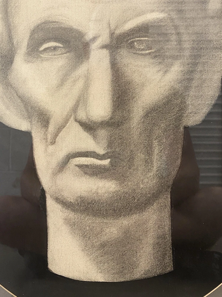 This is an expressive and Unusual Antique American Civil War Abraham LINCOLN Portrait Drawing Painting, likely dating to the 1940's - 1950's. This piece depicts a very stoic bust-like portrait of a young Abraham Lincoln (1809 - 1865) in stark black, gray, and white, rendered in charcoal on thick woven paper. This portrait is portrayed against a stark black background, with an ovoid dark gray matting and silvered vintage wood frame. The overall appearance of these elements creates a very captivating image, which may have been a maquette for a marble bust of this legendary American President. This piece appears to be unsigned, but perhaps you recognize the artist or their work? An old framer's label on the verso reads: "Lincoln Park...Chicago, Illinois." Approximately 20 1/8 x 24 1/4 inches (including frame.) Actual visible artwork is approximately 15 x 18 inches. Very good condition for age, with some moderate scuffing, chipping and edge wear to the vintage frame (please see photos.) Acquired in Los Angeles County, California. If you like what you see, I encourage you to make an Offer. Please check out my other listings for more wonderful and unique artworks! About this Artwork: Abraham Lincoln THE 16TH PRESIDENT OF THE UNITED STATES The biography for President Lincoln and past presidents is courtesy of the White House Historical Association. Abraham Lincoln became the United States’ 16th President in 1861, issuing the Emancipation Proclamation that declared forever free those slaves within the Confederacy in 1863. Lincoln warned the South in his Inaugural Address: “In your hands, my dissatisfied fellow countrymen, and not in mine, is the momentous issue of civil war. The government will not assail you…. You have no oath registered in Heaven to destroy the government, while I shall have the most solemn one to preserve, protect and defend it.” Lincoln thought secession illegal, and was willing to use force to defend Federal law and the Union. When Confederate batteries fired on Fort Sumter and forced its surrender, he called on the states for 75,000 volunteers. Four more slave states joined the Confederacy but four remained within the Union. The Civil War had begun. The son of a Kentucky frontiersman, Lincoln had to struggle for a living and for learning. Five months before receiving his party’s nomination for President, he sketched his life: “I was born Feb. 12, 1809, in Hardin County, Kentucky. My parents were both born in Virginia, of undistinguished families–second families, perhaps I should say. My mother, who died in my tenth year, was of a family of the name of Hanks…. My father … removed from Kentucky to … Indiana, in my eighth year…. It was a wild region, with many bears and other wild animals still in the woods. There I grew up…. Of course when I came of age I did not know much. Still somehow, I could read, write, and cipher … but that was all.” Lincoln made extraordinary efforts to attain knowledge while working on a farm, splitting rails for fences, and keeping store at New Salem, Illinois. He was a captain in the Black Hawk War, spent eight years in the Illinois legislature, and rode the circuit of courts for many years. His law partner said of him, “His ambition was a little engine that knew no rest.” He married Mary Todd, and they had four boys, only one of whom lived to maturity. In 1858 Lincoln ran against Stephen A. Douglas for Senator. He lost the election, but in debating with Douglas he gained a national reputation that won him the Republican nomination for President in 1860. As President, he built the Republican Party into a strong national organization. Further, he rallied most of the northern Democrats to the Union cause. On January 1, 1863, he issued the Emancipation Proclamation that declared forever free those slaves within the Confederacy. Lincoln never let the world forget that the Civil War involved an even larger issue. This he stated most movingly in dedicating the military cemetery at Gettysburg: “that we here highly resolve that these dead shall not have died in vain–that this nation, under God, shall have a new birth of freedom–and that government of the people, by the people, for the people, shall not perish from the earth.” Lincoln won re-election in 1864, as Union military triumphs heralded an end to the war. In his planning for peace, the President was flexible and generous, encouraging Southerners to lay down their arms and join speedily in reunion. The spirit that guided him was clearly that of his Second Inaugural Address, now inscribed on one wall of the Lincoln Memorial in Washington, D. C.: “With malice toward none; with charity for all; with firmness in the right, as God gives us to see the right, let us strive on to finish the work we are in; to bind up the nation’s wounds…. ” On Good Friday, April 14, 1865, Lincoln was assassinated at Ford’s Theatre in Washington by John Wilkes Booth, an actor, who somehow thought he was helping the South. The opposite was the result, for with Lincoln’s death, the possibility of peace with magnanimity died.