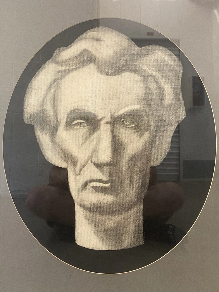 This is an expressive and Unusual Antique American Civil War Abraham LINCOLN Portrait Drawing Painting, likely dating to the 1940's - 1950's. This piece depicts a very stoic bust-like portrait of a young Abraham Lincoln (1809 - 1865) in stark black, gray, and white, rendered in charcoal on thick woven paper. This portrait is portrayed against a stark black background, with an ovoid dark gray matting and silvered vintage wood frame. The overall appearance of these elements creates a very captivating image, which may have been a maquette for a marble bust of this legendary American President. This piece appears to be unsigned, but perhaps you recognize the artist or their work? An old framer's label on the verso reads: "Lincoln Park...Chicago, Illinois." Approximately 20 1/8 x 24 1/4 inches (including frame.) Actual visible artwork is approximately 15 x 18 inches. Very good condition for age, with some moderate scuffing, chipping and edge wear to the vintage frame (please see photos.) Acquired in Los Angeles County, California. If you like what you see, I encourage you to make an Offer. Please check out my other listings for more wonderful and unique artworks! About this Artwork: Abraham Lincoln THE 16TH PRESIDENT OF THE UNITED STATES The biography for President Lincoln and past presidents is courtesy of the White House Historical Association. Abraham Lincoln became the United States’ 16th President in 1861, issuing the Emancipation Proclamation that declared forever free those slaves within the Confederacy in 1863. Lincoln warned the South in his Inaugural Address: “In your hands, my dissatisfied fellow countrymen, and not in mine, is the momentous issue of civil war. The government will not assail you…. You have no oath registered in Heaven to destroy the government, while I shall have the most solemn one to preserve, protect and defend it.” Lincoln thought secession illegal, and was willing to use force to defend Federal law and the Union. When Confederate batteries fired on Fort Sumter and forced its surrender, he called on the states for 75,000 volunteers. Four more slave states joined the Confederacy but four remained within the Union. The Civil War had begun. The son of a Kentucky frontiersman, Lincoln had to struggle for a living and for learning. Five months before receiving his party’s nomination for President, he sketched his life: “I was born Feb. 12, 1809, in Hardin County, Kentucky. My parents were both born in Virginia, of undistinguished families–second families, perhaps I should say. My mother, who died in my tenth year, was of a family of the name of Hanks…. My father … removed from Kentucky to … Indiana, in my eighth year…. It was a wild region, with many bears and other wild animals still in the woods. There I grew up…. Of course when I came of age I did not know much. Still somehow, I could read, write, and cipher … but that was all.” Lincoln made extraordinary efforts to attain knowledge while working on a farm, splitting rails for fences, and keeping store at New Salem, Illinois. He was a captain in the Black Hawk War, spent eight years in the Illinois legislature, and rode the circuit of courts for many years. His law partner said of him, “His ambition was a little engine that knew no rest.” He married Mary Todd, and they had four boys, only one of whom lived to maturity. In 1858 Lincoln ran against Stephen A. Douglas for Senator. He lost the election, but in debating with Douglas he gained a national reputation that won him the Republican nomination for President in 1860. As President, he built the Republican Party into a strong national organization. Further, he rallied most of the northern Democrats to the Union cause. On January 1, 1863, he issued the Emancipation Proclamation that declared forever free those slaves within the Confederacy. Lincoln never let the world forget that the Civil War involved an even larger issue. This he stated most movingly in dedicating the military cemetery at Gettysburg: “that we here highly resolve that these dead shall not have died in vain–that this nation, under God, shall have a new birth of freedom–and that government of the people, by the people, for the people, shall not perish from the earth.” Lincoln won re-election in 1864, as Union military triumphs heralded an end to the war. In his planning for peace, the President was flexible and generous, encouraging Southerners to lay down their arms and join speedily in reunion. The spirit that guided him was clearly that of his Second Inaugural Address, now inscribed on one wall of the Lincoln Memorial in Washington, D. C.: “With malice toward none; with charity for all; with firmness in the right, as God gives us to see the right, let us strive on to finish the work we are in; to bind up the nation’s wounds…. ” On Good Friday, April 14, 1865, Lincoln was assassinated at Ford’s Theatre in Washington by John Wilkes Booth, an actor, who somehow thought he was helping the South. The opposite was the result, for with Lincoln’s death, the possibility of peace with magnanimity died.