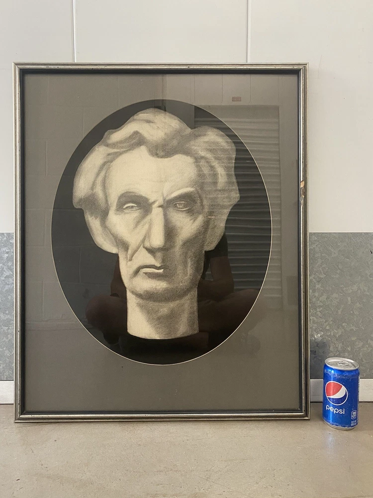 This is an expressive and Unusual Antique American Civil War Abraham LINCOLN Portrait Drawing Painting, likely dating to the 1940's - 1950's. This piece depicts a very stoic bust-like portrait of a young Abraham Lincoln (1809 - 1865) in stark black, gray, and white, rendered in charcoal on thick woven paper. This portrait is portrayed against a stark black background, with an ovoid dark gray matting and silvered vintage wood frame. The overall appearance of these elements creates a very captivating image, which may have been a maquette for a marble bust of this legendary American President. This piece appears to be unsigned, but perhaps you recognize the artist or their work? An old framer's label on the verso reads: "Lincoln Park...Chicago, Illinois." Approximately 20 1/8 x 24 1/4 inches (including frame.) Actual visible artwork is approximately 15 x 18 inches. Very good condition for age, with some moderate scuffing, chipping and edge wear to the vintage frame (please see photos.) Acquired in Los Angeles County, California. If you like what you see, I encourage you to make an Offer. Please check out my other listings for more wonderful and unique artworks! About this Artwork: Abraham Lincoln THE 16TH PRESIDENT OF THE UNITED STATES The biography for President Lincoln and past presidents is courtesy of the White House Historical Association. Abraham Lincoln became the United States’ 16th President in 1861, issuing the Emancipation Proclamation that declared forever free those slaves within the Confederacy in 1863. Lincoln warned the South in his Inaugural Address: “In your hands, my dissatisfied fellow countrymen, and not in mine, is the momentous issue of civil war. The government will not assail you…. You have no oath registered in Heaven to destroy the government, while I shall have the most solemn one to preserve, protect and defend it.” Lincoln thought secession illegal, and was willing to use force to defend Federal law and the Union. When Confederate batteries fired on Fort Sumter and forced its surrender, he called on the states for 75,000 volunteers. Four more slave states joined the Confederacy but four remained within the Union. The Civil War had begun. The son of a Kentucky frontiersman, Lincoln had to struggle for a living and for learning. Five months before receiving his party’s nomination for President, he sketched his life: “I was born Feb. 12, 1809, in Hardin County, Kentucky. My parents were both born in Virginia, of undistinguished families–second families, perhaps I should say. My mother, who died in my tenth year, was of a family of the name of Hanks…. My father … removed from Kentucky to … Indiana, in my eighth year…. It was a wild region, with many bears and other wild animals still in the woods. There I grew up…. Of course when I came of age I did not know much. Still somehow, I could read, write, and cipher … but that was all.” Lincoln made extraordinary efforts to attain knowledge while working on a farm, splitting rails for fences, and keeping store at New Salem, Illinois. He was a captain in the Black Hawk War, spent eight years in the Illinois legislature, and rode the circuit of courts for many years. His law partner said of him, “His ambition was a little engine that knew no rest.” He married Mary Todd, and they had four boys, only one of whom lived to maturity. In 1858 Lincoln ran against Stephen A. Douglas for Senator. He lost the election, but in debating with Douglas he gained a national reputation that won him the Republican nomination for President in 1860. As President, he built the Republican Party into a strong national organization. Further, he rallied most of the northern Democrats to the Union cause. On January 1, 1863, he issued the Emancipation Proclamation that declared forever free those slaves within the Confederacy. Lincoln never let the world forget that the Civil War involved an even larger issue. This he stated most movingly in dedicating the military cemetery at Gettysburg: “that we here highly resolve that these dead shall not have died in vain–that this nation, under God, shall have a new birth of freedom–and that government of the people, by the people, for the people, shall not perish from the earth.” Lincoln won re-election in 1864, as Union military triumphs heralded an end to the war. In his planning for peace, the President was flexible and generous, encouraging Southerners to lay down their arms and join speedily in reunion. The spirit that guided him was clearly that of his Second Inaugural Address, now inscribed on one wall of the Lincoln Memorial in Washington, D. C.: “With malice toward none; with charity for all; with firmness in the right, as God gives us to see the right, let us strive on to finish the work we are in; to bind up the nation’s wounds…. ” On Good Friday, April 14, 1865, Lincoln was assassinated at Ford’s Theatre in Washington by John Wilkes Booth, an actor, who somehow thought he was helping the South. The opposite was the result, for with Lincoln’s death, the possibility of peace with magnanimity died.