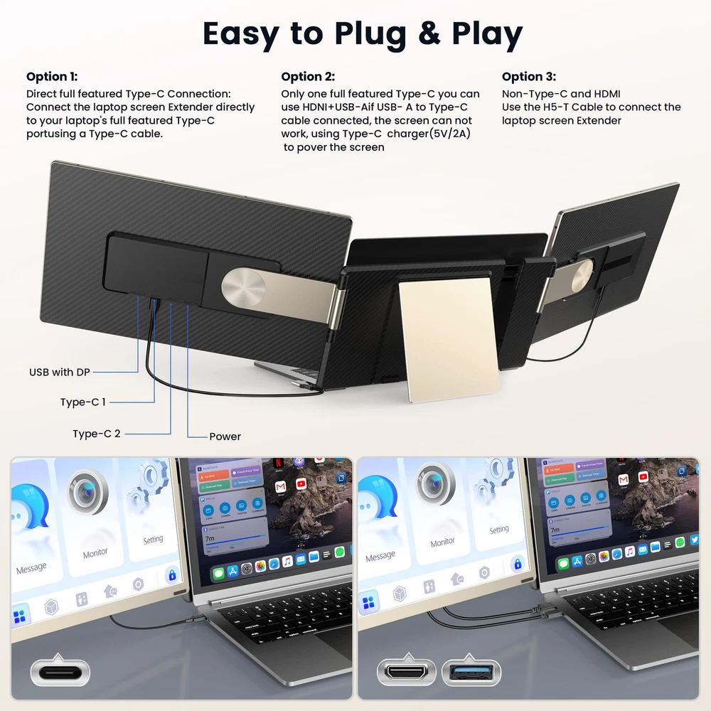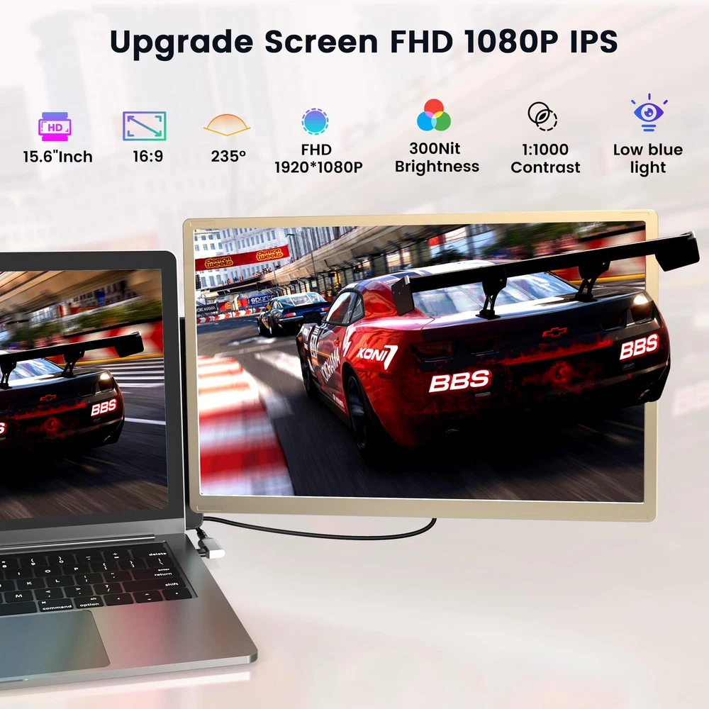 New upgraded laptop monitor extender:Made of aluminum alloy and PC material, this new generation laptop screen extender is durable and drop-proof; and the upgraded magnetic structure makes it more stable. A variety of screen combinations and its detachable screens can meet all your needs, allowing you to entertain easily and work conveniently. Perfect for mobile office, remote workers, IT, gamers, stock traders, programmers and more 1080P IPS FHD quality:The triple portable monitor laptop uses 15.6-inch FHD 1080P IPS screen, providing you higher image quality, brighter screen and more vivid colors. With the built in speakers, you can enjoy a better viewing experience. At the same time, the low-blue light design portable display has anti-glare and flicker-free functions, which provides eye protection 300% Improve work efficiency:15.6" Portable laptop screen triple monitor with 2 additional detachable screens, supports 235° horizontal rotation and 90° vertical rotation, horizontal mode, portrait mode, dual screen display and other combinations to provide you a variety of viewing angles, enables you to open multiple windows at the same time. Working on different screens, video conferencing, watching movies, etc. No need to switch back and forth on one screen, improve productivity and save your time Plug and Play, no driver required:This is a laptop triple screen extender for 13.3"-17.3" laptops, whether you choose a USB-C, USB-A or HDMI connection, simply plug in the laptop screen extender and start your daily use without drivers. (Please note: When using the HDMI cable, connect an additional USB-A to USB-C cable on the same screen extender for power supply) Broad compatibility and Christmas gift: Laptop screen extender supports a variety of devices and operating systems, and this triple screen laptop monitor extender is compatible with Windows, Mac (does not support M1/M2/M3 chip), Chrome, Android, Linux, Dex other devices, please read the instructions carefully before use. If you have any questions, feel free to contact us and we will get back to you within 24 hours