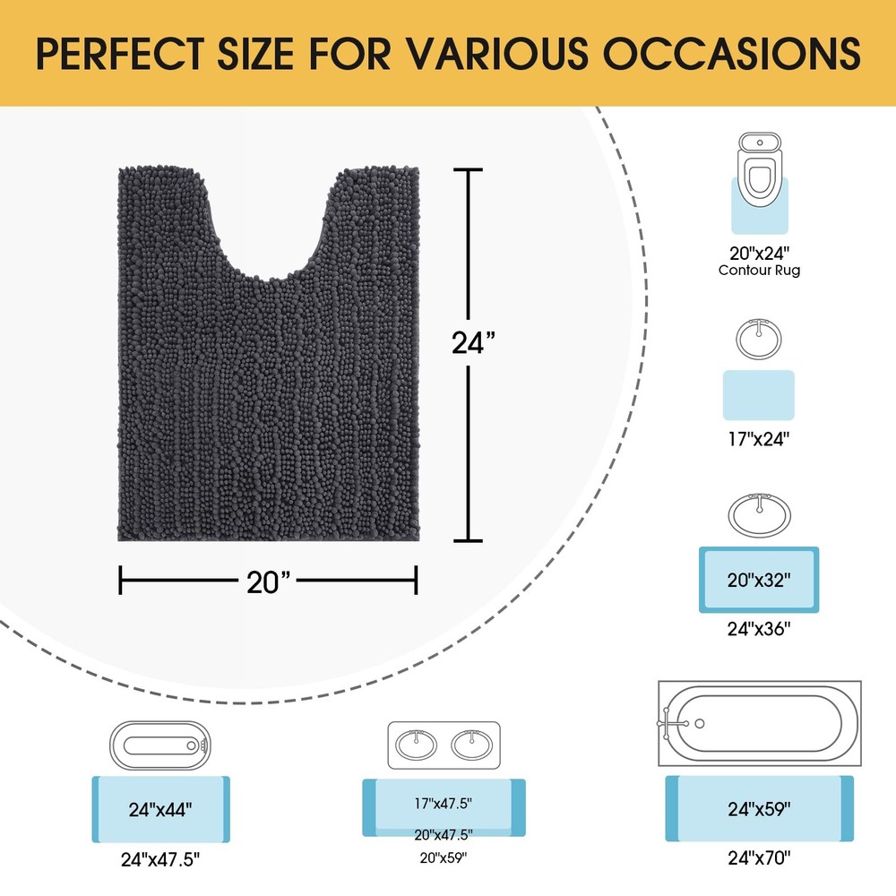Extra Soft Chenille Bathroom Rugs Mat help you Enjoy Bath or Shower Time! ❤About Brand is created for offering high quality Bathroom Rugs for customers. Our store is a professional manufacturer, who owns more than 20 years qualification of bathroom mats's designed and produce. Our aim is to provide reliable products and good customer serivce to our customer. ❤Why Choose Chenille Bathroom Rugs? Newly Style This newly designed Chenille bath rug are created with bold pop stripes pattern lends, which makes it different from the ordinary style's. A bath mat not only work for you, but also decorate your bathroom with more fresh feeling for your home. Amazing Water Absorption This Luxurious Chenille Shaggy Rug Collections is crafted from 100% soft chenille, super comforable to massage your feet. More improtantly, the most prominent advantage of chenille mat is that it have amazing water absorption. Your wet feet, which are out from shower, will dry at once just after on this amazing chenille mat. Never need to bend to use paper or towl to dry your feet again! Silky and Soft Crafted from exceptionally silky, soft, velvety chenille, perfect for bathroom, bedroom, living room kitchen using. Your families, or even your pets will like it! Non Slip Non-skid backing SBE/Hot melt spray, keep mats firmly in place. Machine Washable This material is both flexible and strong and can withstand multiple machine washes. ❤Extra Soft Chenille Bathroom Rugs Mat will be a great gift idea for all occasions, Christmas, Wedding, Fathers Day, Mothers Day, Valentines, Birth Day & Etc. LUXURY BATHROOM RUG MAT: Including 1 contour rug 20" x 24". Made of 100% luxurious chenille fabric microfiber with higher pile than others. The thick and soft chenille helps soothe tired feet and keep your toes warm on the cold floor. The high density and plushness of the chenille offers exceptional comfort and support for your feet. You will feel like steppingon a cozy cloud to enjoy the ultimate luxury. PREMIUM PURE CHENILLE: Crafted from upgraded shaggy chenille material, the surface of bathroom mat owns extra high density and plushness. With unique fiber-locking technique, our toilet rugs set are thicker and better constructed than most other bath mats, totally say goodbye to horrible fiber-dropping! SUPERIOR ABSORBENCY: The bold pile chenille on the top surface of the luxurious toilet mat soak up a lot of water and keep your floor dry when you're stepping out of the bath, Bathtub, shower, or getting ready by the sink, moisture is trapped in the bathroom rug’s deep pile, to avoid the dripping water disturbing your bathroom's serenity and tidy. UPDATED NON SLIP BACKING: The backside of bathroom carpet is covered in a high-quality natural PVC that keeps the bath rugs firmly in place. Heavy-duty PVC construction makes the mat under strong grip which will prevent your families from slipping and sliding. The thick fabric and bottom makes it more bushy and durable than others. Provide the maximum safety and warmth to you! EASY CARE: Simply machine wash on cold with mild detergent and tumble dry low. Air dry fully before use. Do not iron or bleach. We can sure you can find the best price from here because we are the manufacturer with a good product quality and after-sales service. If you think this floor mat does not satisfy you, just email us to get the solution.