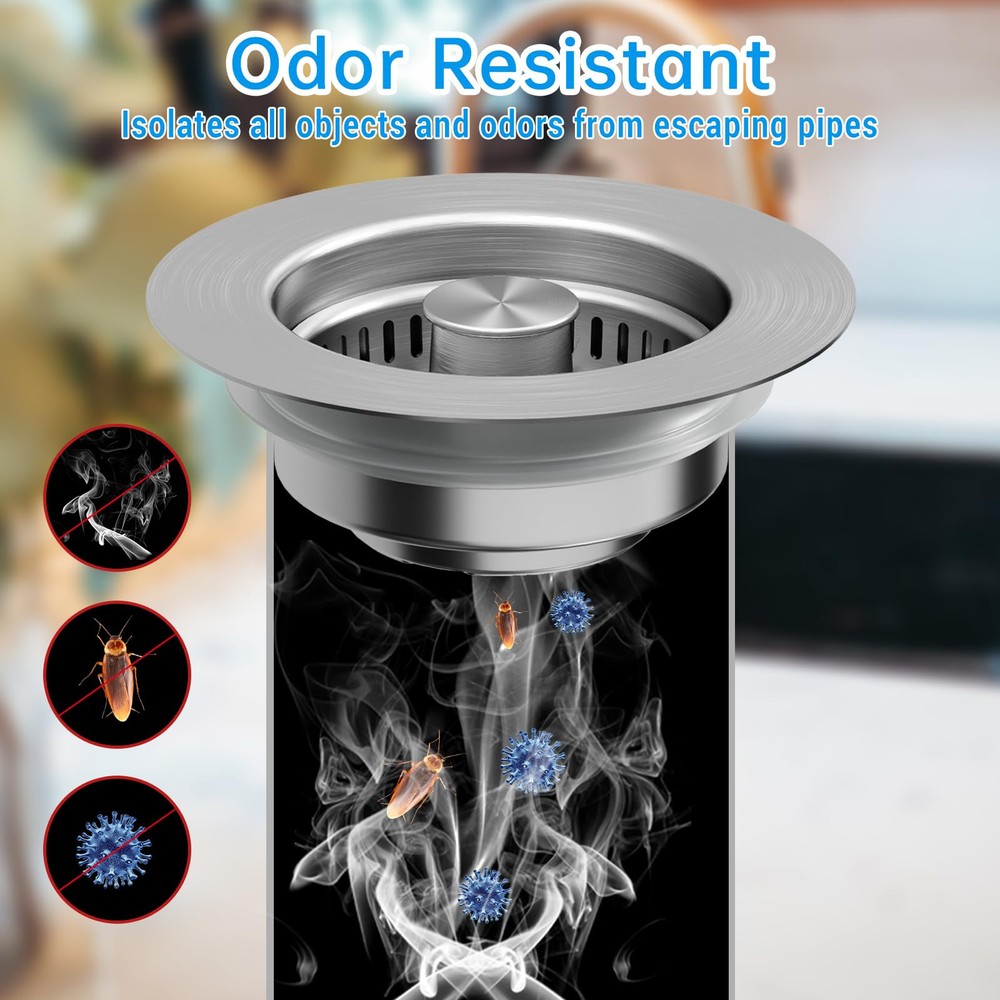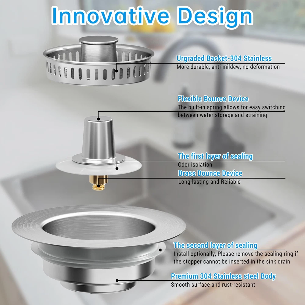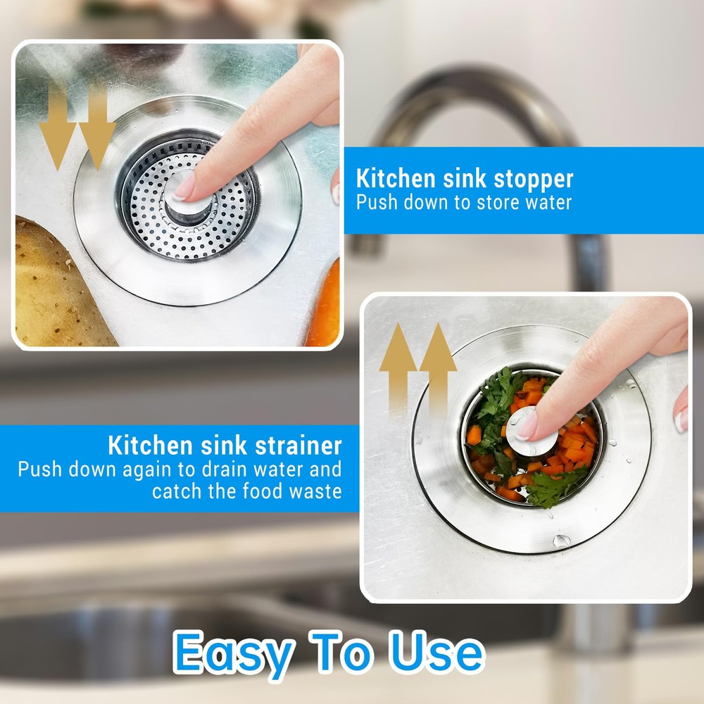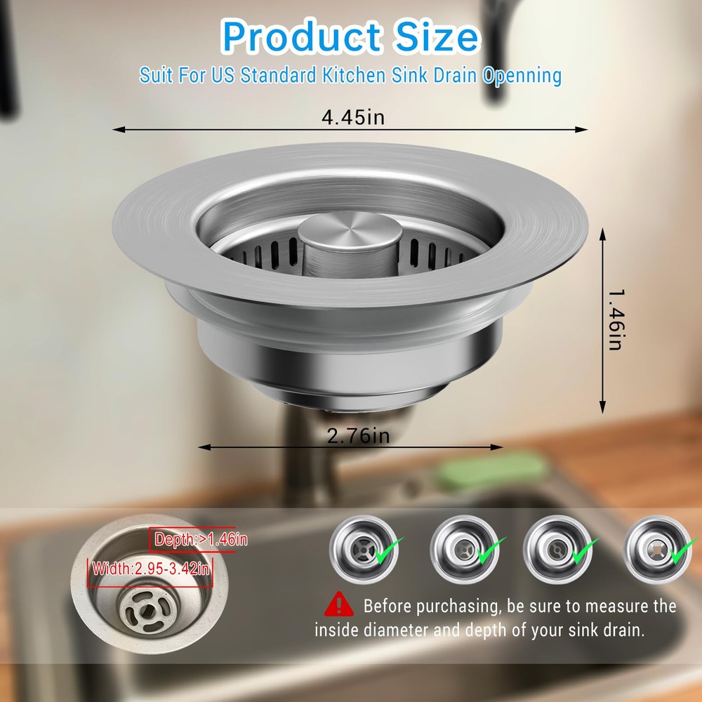 【3-in-1 Functionality】 Elevate your kitchen experience with our new innovative 3-in-1 All Metal 304 Stainless Steel kitchen sink drain strainer. With a pop-up device, this kitchen sink drain strainer combines 3 in 1 functions, as kichen sink stopper to store water, as kichen sink strainer to drain water and catch food waste, as sink plug to isolate ordors and insects to streamline your daily tasks with unmatched efficiency and durability. Bid farewell to clogged drains as the efficient food catcher ensures smooth drainage for a hassle-free experience. 【Upgraded All metal Structure】Crafted with premium 304 stainless steel, our kitchen sink stopper is long-lasting and rust-proof with stainless steel body, food catcher basket and built-in brass bounce core device. The new generation sink strainer basket is upgraded to SUS304 material, ensuring long-lasting performance and saving you money on replacements and reducing plastic waste. 【Stylish Pop-Up Design】Featuring an upgraded one-piece spring-loaded design, our pop-up kitchen sink drain stopper allows for effortless switching between sink drain strainer and sink stopper with just one press, adding a touch of modern style to your kitchen sink. And the upgraded brass bounce core device offers exceptional resistance to corrosion, scratches, and high temperatures. 【Universal US Standard Sink Size】This sink stopper kitchen drain is universal use for US 3-1/2 inch kitchen drain holes, suitable for the width 2.95"-3.42", depth>>1.46" of the sink drain opening. Before purchasing, be sure to measure the inside diameter and depth of your sink drain for a perfect fit. 【Easy to Install and Clean】The sink strainer kitchen drain is easy to install without any tools. The upgraded removal stainless steel kitchen sink strainer basket that filters kitchen food leftovers without clogging is easy to clean, and saving you time and effort, ensuring a fresh and clean kitchen environment.
