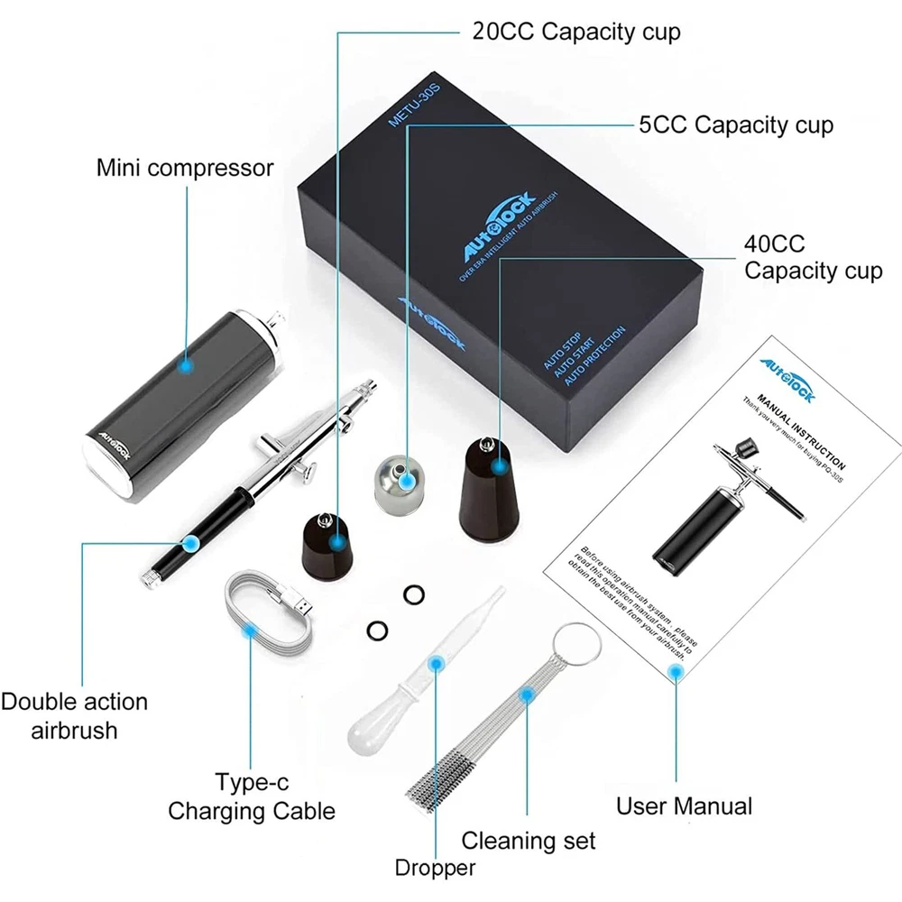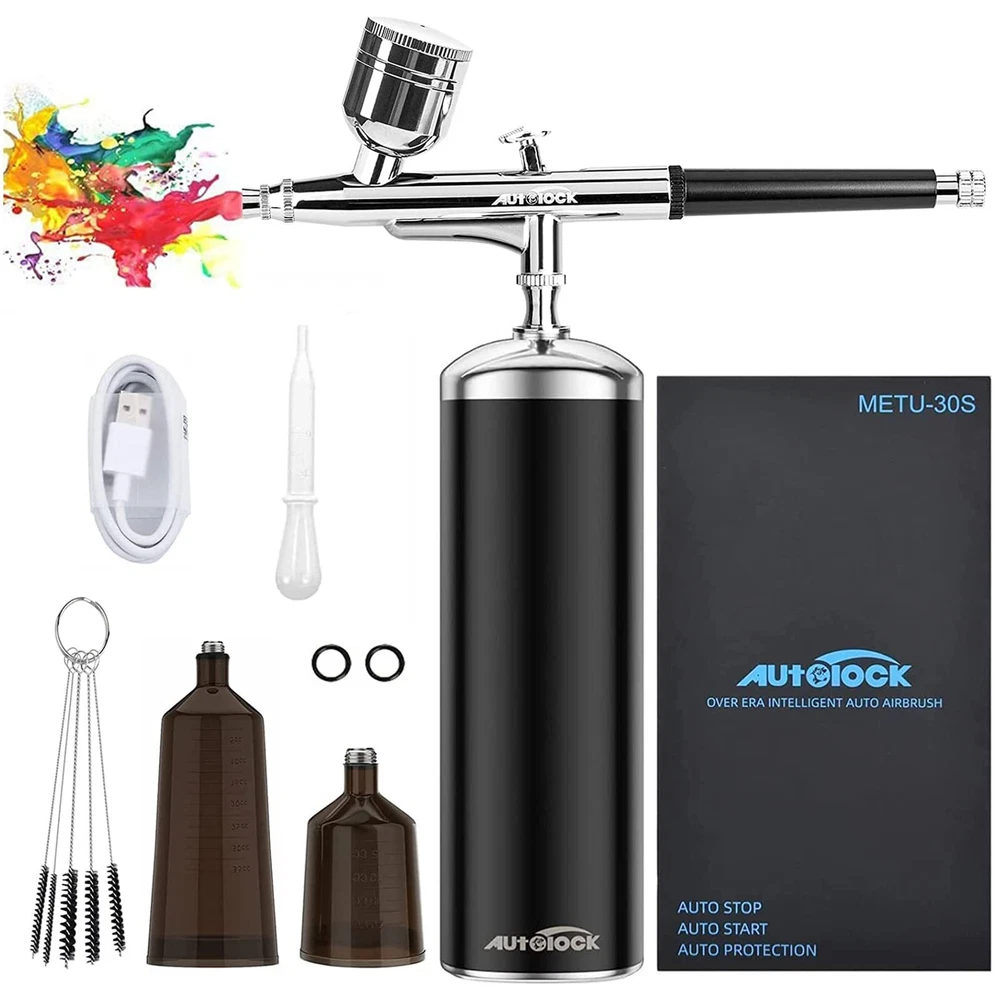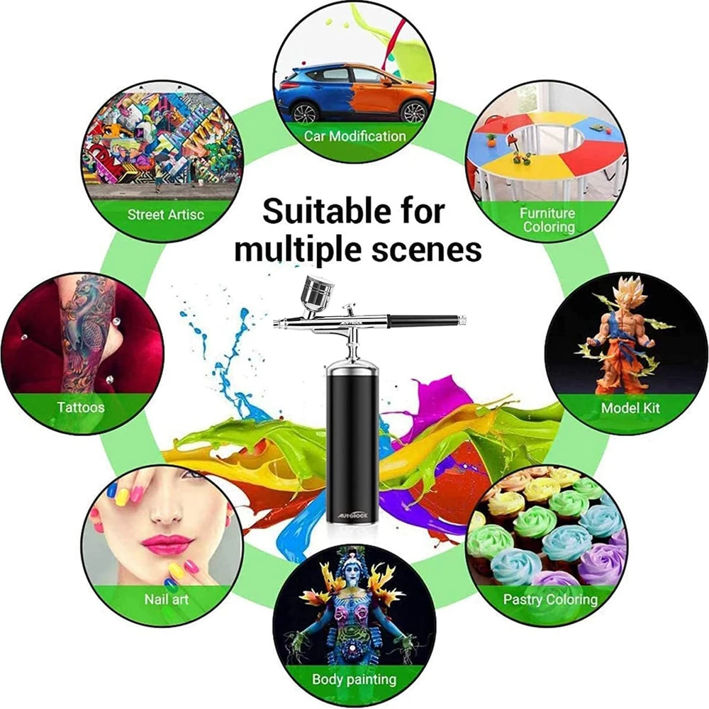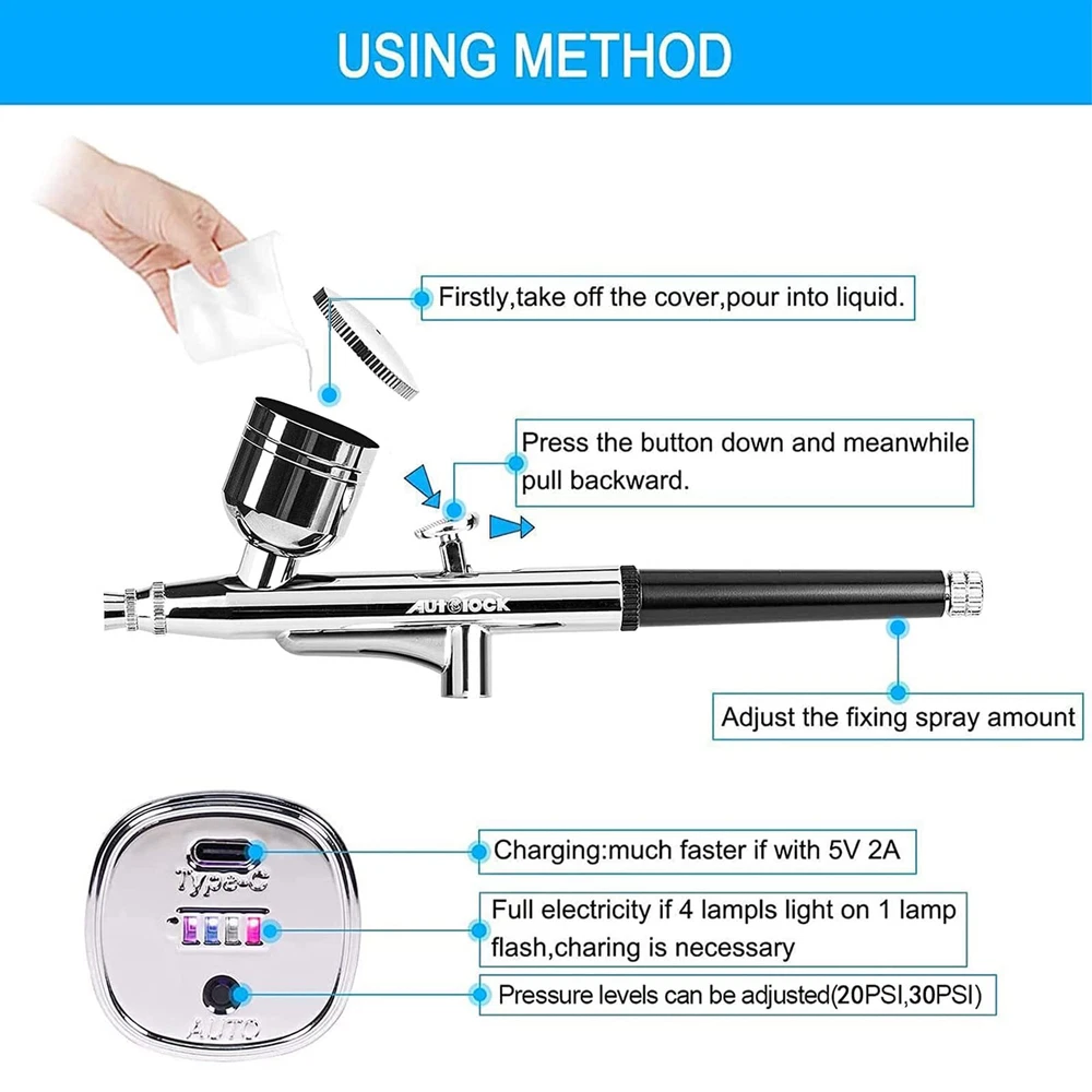 This dual action airbrush does not need a switch,just press the trigger to work, air will be sprayed, move the trigger back, the liquid will be sprayed, you can control the liquid output The amount of paint will automatically,stop working after releasing the trigger. In addition, there are 4 indicator lights at the bottom of the air compressor to display battery power. Before using the spray gun, please fully charge it. The air pressure has increased by 50% compared with similar airbrushes on the market, it is higher up to 20-30psi and the air flow reaches 6-8L, others are only 12-15psi, 6L. The nozzle of this airbrush is only 0.4mm, so it can only spray watercolor pigments, inks and dyes, as well as properly diluted paint, NOTE:Please dilute acrylic paint with distilled water or or with good quality commercial thinners specifically made for acrylic paints. FASTER CHARGING TECHNOLOGY AND LONGER WORKING TIME: The gun comes with a type-c charging cable, and due to circuitry and battery upgrades, it supports 2A fast charging technology, and it is recommended to charge it with a DC 5V-2A charger for faster speed. After fully charged, the working time can reach 1 hour, while other products can only reach 30-50 minutes. It is not recommended to use the airbrush kit while charging, nor is it recommended to use a charger smaller than 1A or larger than 2A. New Structure & Use Widely: Stylish appearance, no apertures on body. Portable and Compact Size, easy to carry anywhere. lower pressure rating is 20PSI, which is very suitable for airbrush gun makeup. The higher 30PSI is designed for the field of airbrush painting: art painting, cake decoration, nail art, handicrafts, model coloring, illustrations, temporary tattoos, hobbies, etc. You can press the “Auto” button at the bottom of the air compressor to adjust the air volume. Better after-sales service: After-sales service is very important for both small shops and large companies. We are willing to provide 1 year service for all customers' spray gun kits. If there are quality problems caused by non-human factors, or if you encounter any problems in the use of the goods, you can directly contact our customer service specialists via email.