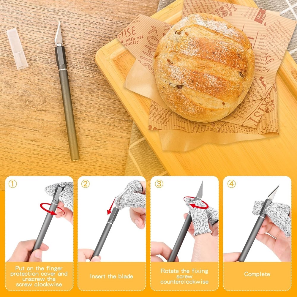 Free eBay listing template designed by dewiso.com Upgraded Bread Lame with 10 Blades - Professional sourdough Scoring Tool for bread scoring tool, Safety Cover & Ergonomic Handle - Premium Bread Scoring Knife for Artisan Bread Making FREE AND FAST SHIPPING! About this item Pro-Grade Precision Bread Lame. Engineered for perfection, our stainless steel bread scoring tool delivers ideal weight distribution for flawless control. Experience professional bread lame dough scoring with surgical precision, whether creating ear patterns or decorative designs, every slash lands exactly where intended Complete Sourdough Scoring Kit. The ultimate sourdough tools collection, featuring an adjustable-angle lame, 11 surgical-grade blades, scoring templates, and silicone finger shields. Master advanced techniques like wheat stalks or geometric patterns with this artisan's toolkit Safety-First Scoring Knife. Our lame bread tool knives where the blade is held by a chuck-type clamp that you turn to close or open. This makes it much easier to install or change blades. The included magnetic docking station ensures safe storage and instant access - no more fumbling with exposed blades Effortless Professional Results. The revolutionary scoring knife for bread baking features a gyroscopic balanced handle that naturally aligns to your cutting motion.The blade size of the bread scorer is just right, making it easy to control the cutting depth and achieve good baking results Usage scenarios and storage: bread cutting patterns, baking carving, vegetable and fruit carving, plate decoration, cheese cutting, and other food processing. Handmade creations: soap/clay carving, Halloween pumpkin lantern. Please dry the bread knife apply cooking oil and store it in a dry place. Product We offer a 30-Day Return Policy on items which you are not completely satisfied with. You have the option for a full-refund or an exchange of the item. No returns are available on items shipped outside of the US . Shipping We offer Free Shipping to the US and ship within 2 business days of payment, usually sooner. We use UPS express shipping. That's why your products are usually delivered within 3 days . Contact We try our very best to make sure every customer is completely satisfied. If there's a problem , message us! We're happy to help. 24/7 live chat available.