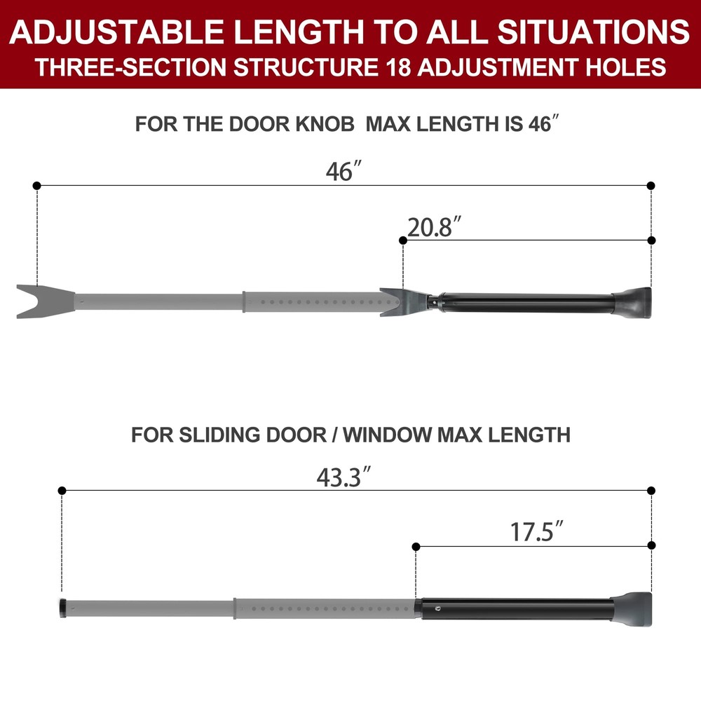 Bar for Security: If you are concerned that your windows and doors aren't sturdy enough or you feel it is unsafe when travelling alone, 's door stick security will offer you a complete sense of security with only one easy-to-use but distinctive lever which is also easy to install 2-in-1 Door and Sliding Door Security Bar: Use our adjustable security door bar to deter burglars from breaking into your house, apartment, or even hotel room; The length of the door barricade security bar can be adjusted from 21 to 46inch, and the full product weighs only 2.2 pounds, making it easy to carry during travel or store at home Easy to Use: According to our product manual or the installation instructions on the detail page, the door brace security bar is very simple to use, has a three-stage structure, and can be quickly deployed; This allows you to quickly strengthen your defense; However, while using it, you must be careful to ensure that there are no gaps between the rubber head and the ground Versatile and Enhanced Design: The bar is equipped with enhanced high-strength alloy connections to extend the service life; It also features thickened 1.57inch pipe diameter design, high-quality material upgrades and plastic components made of high-strength fiberglass material making it stable and sturdy; Since the security bar on an door stopper can endure 350 pounds of force, an invader would have to be as strong as a heavy weight boxer to open the door Customer Service: provides 20 months customer services; If you run across any issues or face any problem with the security bar for front door, please get in touch with us; Bring extra security for your loved one’s home without delay