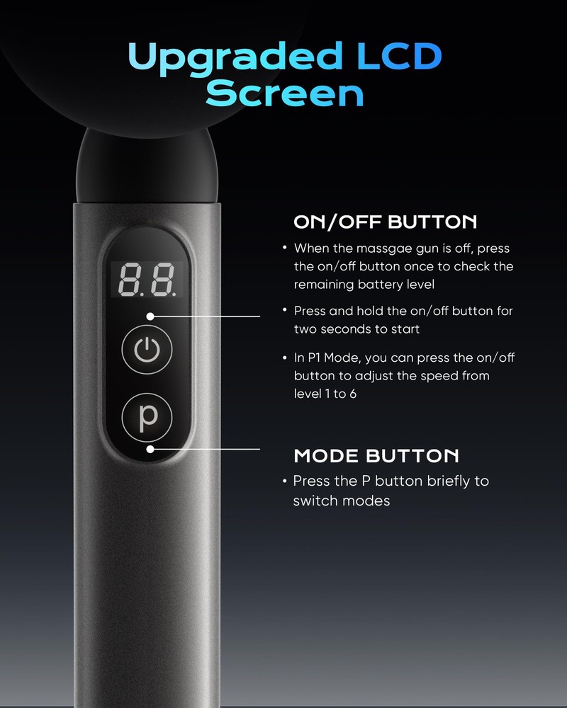 【Upgraded Extended Handle & Quick Pain Relieve】Our massage deep tissue is designed with an easy-to-grip extended handle and an ergonomic 120° curve that perfectly aligns with the natural curvature of your spine. Unlike regular massage , our massage deep tissue allows you to effortlessly reach and relax your back, neck, shoulders, arms, legs, and other hard-to-reach areas. Suitable for pain and speeding up recovery from sports injuries, it is a must-have for anyone seeking effective muscle relaxation and rejuvenation 【Smart LCD Screen & 4 Massage Heads】Our massage features an intuitive LCD screen that shows mode, speed level, and battery life. It comes with 4 massage heads to meet your various needs. When the massage is powered off, press the On/Off Switch once to check the battery level. Press and hold the On/Off Switch for 2 seconds to turn on the massage 【3 Modes & 6 Levels】Customize the massage with 3 modes and 6 speed levels. P1 Mode features 6 adjustable speed levels (1000-3000 RPM). P2 Mode (3200 RPM) and P3 Mode (3500 RPM) have a fixed speed setting. In P1 Mode, press the on/off Switch to adjust the speed from level 1 to 6. You can switch between modes by pressing the P key 【Long Battery Life】Recharge quickly in just 90 minutes with a USB-C cable. Enjoy a 15-minute massage session daily, and our massage will keep you relaxed for up to 15 days on a single charge. When the battery level shows 99, it indicates a full charge. Do not use the massage while it is charging 【Lightweight Holiday Gift Idea】Our massage is ergonomically designed for ease of use and portability. It's lightweight and comes with a user manual, this massage offers the best massage experience at home, in the gym, or at the office. This makes it the perfect present for Mother's Day, Father's Day, or any special occasion for your family, loved ones, and friends