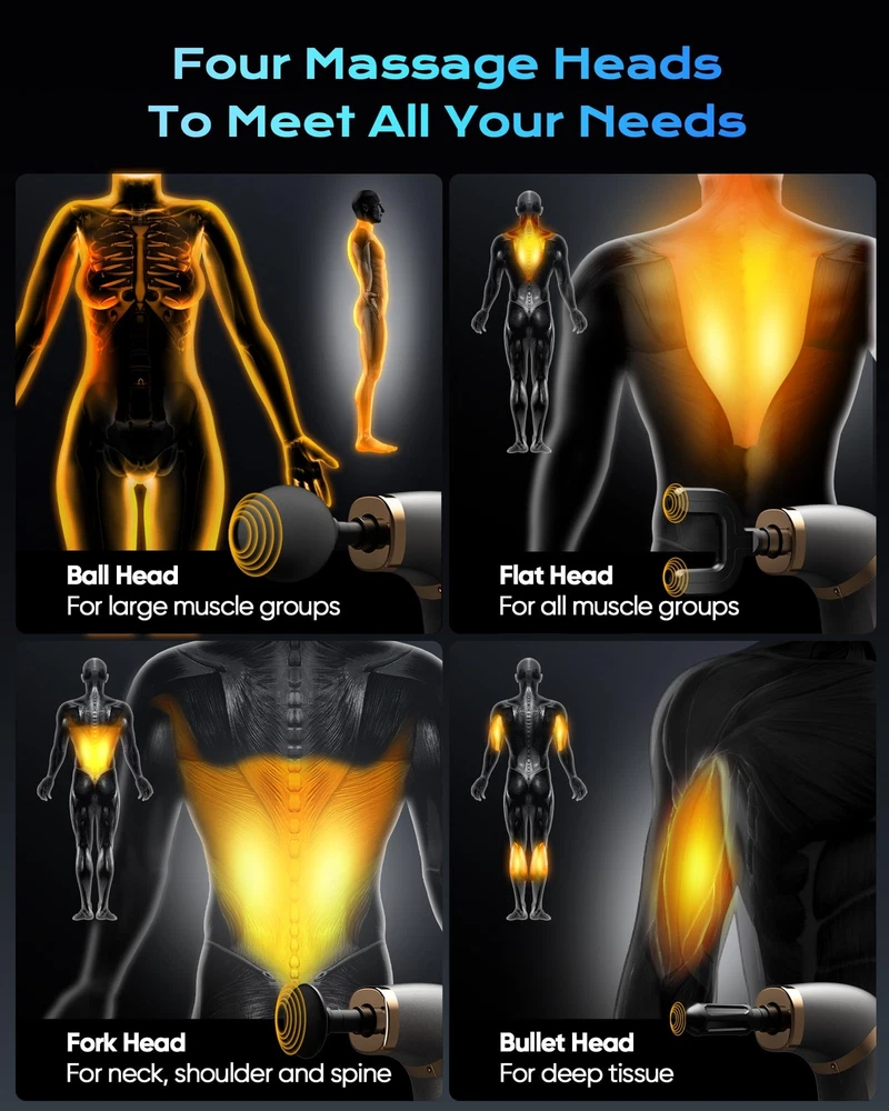 【Upgraded Extended Handle & Quick Pain Relieve】Our massage deep tissue is designed with an easy-to-grip extended handle and an ergonomic 120° curve that perfectly aligns with the natural curvature of your spine. Unlike regular massage , our massage deep tissue allows you to effortlessly reach and relax your back, neck, shoulders, arms, legs, and other hard-to-reach areas. Suitable for pain and speeding up recovery from sports injuries, it is a must-have for anyone seeking effective muscle relaxation and rejuvenation 【Smart LCD Screen & 4 Massage Heads】Our massage features an intuitive LCD screen that shows mode, speed level, and battery life. It comes with 4 massage heads to meet your various needs. When the massage is powered off, press the On/Off Switch once to check the battery level. Press and hold the On/Off Switch for 2 seconds to turn on the massage 【3 Modes & 6 Levels】Customize the massage with 3 modes and 6 speed levels. P1 Mode features 6 adjustable speed levels (1000-3000 RPM). P2 Mode (3200 RPM) and P3 Mode (3500 RPM) have a fixed speed setting. In P1 Mode, press the on/off Switch to adjust the speed from level 1 to 6. You can switch between modes by pressing the P key 【Long Battery Life】Recharge quickly in just 90 minutes with a USB-C cable. Enjoy a 15-minute massage session daily, and our massage will keep you relaxed for up to 15 days on a single charge. When the battery level shows 99, it indicates a full charge. Do not use the massage while it is charging 【Lightweight Holiday Gift Idea】Our massage is ergonomically designed for ease of use and portability. It's lightweight and comes with a user manual, this massage offers the best massage experience at home, in the gym, or at the office. This makes it the perfect present for Mother's Day, Father's Day, or any special occasion for your family, loved ones, and friends