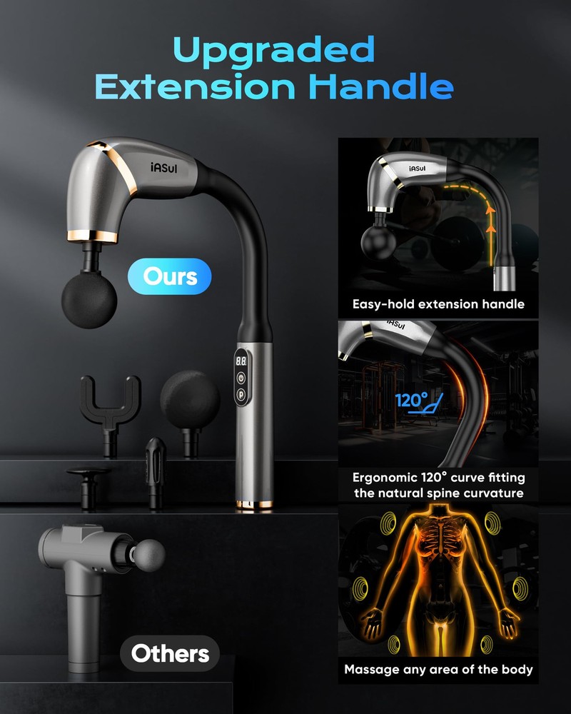 【Upgraded Extended Handle & Quick Pain Relieve】Our massage gun deep tissue is designed with an easy-to-grip extended handle and an ergonomic 120° curve that perfectly aligns with the natural curvature of your spine. Unlike regular massage guns, our massage gun deep tissue allows you to effortlessly reach and relax your back, neck, shoulders, arms, legs, and other hard-to-reach areas. Suitable for pain relief and speeding up recovery from sports injuries, it is a must-have for anyone seeking effective muscle relaxation and rejuvenation 【Smart LCD Screen & 4 Massage Heads】Our massage gun features an intuitive LCD screen that shows mode, speed level, and battery life. It comes with 4 massage heads to meet your various needs. When the massage gun is powered off, press the On/Off Switch once to check the battery level. Press and hold the On/Off Switch for 2 seconds to turn on the massage gun 【3 Modes & 6 Levels】Customize the massage gun with 3 modes and 6 speed levels. P1 Mode features 6 adjustable speed levels (1000-3000 RPM). P2 Mode (3200 RPM) and P3 Mode (3500 RPM) have a fixed speed setting. In P1 Mode, press the on/off Switch to adjust the speed from level 1 to 6. You can switch between modes by pressing the P key 【Long Battery Life】Recharge quickly in just 90 minutes with a USB-C cable. Enjoy a 15-minute massage session daily, and our massage gun will keep you relaxed for up to 15 days on a single charge. When the battery level shows 99, it indicates a full charge. Do not use the massage gun while it is charging 【Lightweight Holiday Gift Idea】Our massage gun is ergonomically designed for ease of use and portability. It's lightweight and comes with a user manual, this massage gun offers the best massage experience at home, in the gym, or at the office. This makes it the perfect present for Mother's Day, Father's Day, or any special occasion for your family, loved ones, and friends