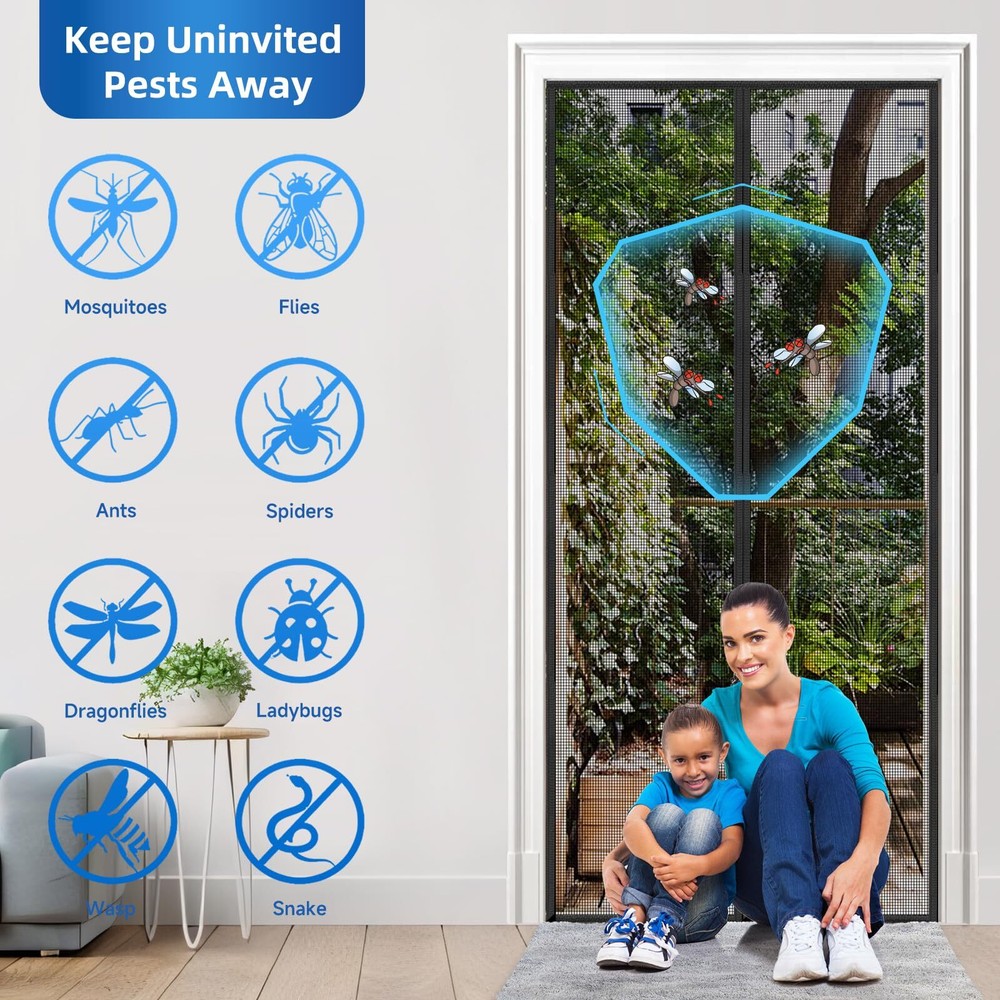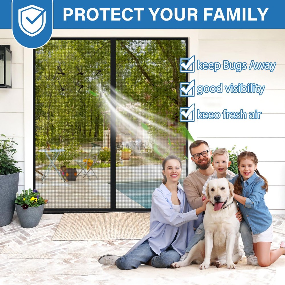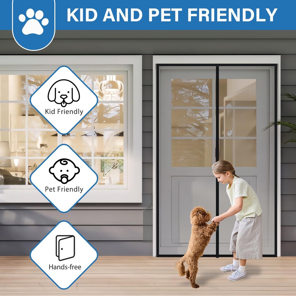 LONGEAS Upgraded PET Mesh Magnetic Screen Door Stronger Than Fiberglass and Polyestera FREE SHIP Upgraded PET Material: This PET magnetic screen door is specially designed for pets, stronger than polyester and fiberglass mesh, can resist any pet's scratching and biting, will not break, and has denser mesh to prevent any insects from entering Kid & Pet Friendly: The screen door mesh is kid & pet friendly. The bottom weighted gravity rod is combined with a strong magnet to ensure kids & pets can easily and freely enter and exit the house without the help of their hands. The magnet screen door will automatically close to prevent insects from entering Effective Insect Prevention: The strong magnets on the retractable screen door can maintain the best seal, 1.6in widened Velcro is safe and firm and will not fall off, the dense mesh can prevent any tiny insects from entering and bring fresh air into your home, enjoy a happy life Quick Installation: The magnetic door screen size is 75.5*82, fit door size is 72*80. You only need to follow the steps in the instructions to quickly install it. Tips: Please measure your door twice before installation to find the most suitable installation position. You can remove it and store it when not in use Exclusive Service: LONGEAS will provide you with the best service, your satisfaction is our greatest reward. If accessories are lost or any problem occurs with the screen door, we can repair or replace it for free. Looking forward to your personal experience Shipping We offer FREE shipping on all orders! We ship within Three business days of payment, usually sooner. We use a selection of shipping services such as UPS, FedEx, USPS etc. We only ship to the lower 48 states, no APO/FPO addresses or PO Boxes allowed. Local pickups and combined shipping options are not provided at this time. Return You can return a product for up to 30 days from the date you purchased it. Any product you return must be in the same condition you received it and in the original packaging. Please keep the receipt. Payment We accept payment by any of the following methods: PayPal Please pay as soon as possible after winning an auction, as that will allow us to post your item to you sooner! Feedback Customer satisfaction is very important to us. If you have any problem with your order, please contact us and we will do our best to make you satisfied. Contact Us If you have any queries, please contact us via ebay. We usually respond within 24 hours on weekdays. Please visit our eBay store to check out other items for sale! Thank you for shopping at our store.