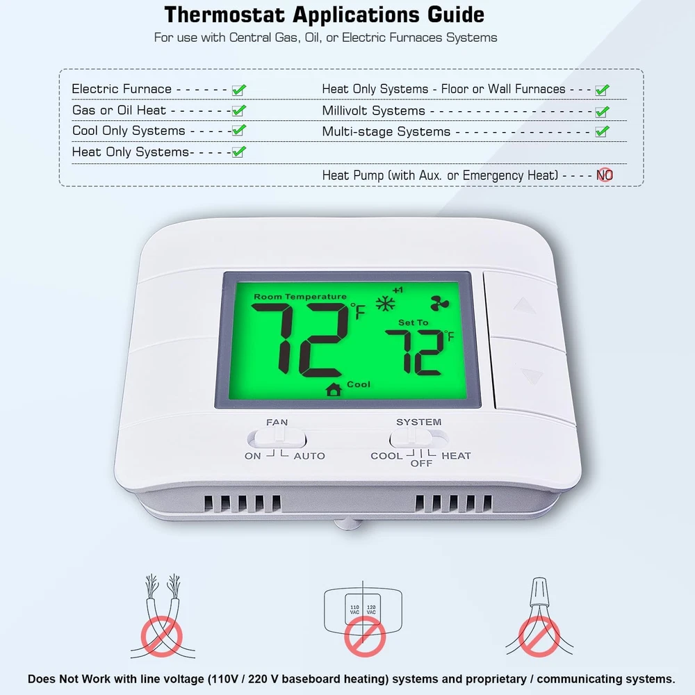 Non programmable thermostat, multi-stage, 2 heating and 2 cooling, electric or gas/oil configurable. (TIPS: before purchasing, check to see if this thermostat is compatible with your old thermostat) Compatible with the following systems: gas, oil or electric furnaces, millivolt system, central heating and cooling system. NOT COMPATIBLE with the following systems: RV thermostats, Heat pump systems, Aux heating, Emergency heating, 120/240v electric baseboard and line voltage systems. Easy to read and use: Large digital display with large characters and green backlight. separate buttons for easy setpoint temperature, very suitable for middle-aged and elderly people to use. Upgrade function: The thermostat with humidity and temperature monitor to ensure you’re always aware of changes in your home environment. It gives precise temperature control with +/- 1 degree in Fahrenheit and Celsius for ultimate consistent control to keep you comfortable. Easy installation and the battery is easy to replace, with dual powered by 24VAC power or 2*AAA batteries, C-wire is not required. built-in low battery reminder, compressor delay protection and more. Please contact us at once if any quality problem, come with 2-years warranty and 24h customer service. Product Description Garystat G711 multi-stage thermostat has a large, easy to read backlight display, that allows you to clearly see what you’re doing for easier operation. Plus, this upgraded thermostat features a real-time temperature and humidity cycle display. We specializes in the design and manufacturing of professional grade products that improve the comfort of a home and simplify the installation. Compatible With: gas, oil or electric furnaces, millivolt system, central heating and cooling system. Warnings: (Not following these instructions could cause serious material damage.) - Not compatible with 110-240V HVAC systems (like electric baseboard heat / line volt systems) - Not compatible with Heat pump systems, Aux heating, Emergency heating. - Not compatible with RV thermostat systems. Specifications: - Non-programmable - Multi stage - 2 Heat, 2 Cool - Large LCD display with green backlight - Room temperature & humidity monitor - Fan switch with ON and AUTO functions - Easy access battery compartment - Low battery indicator - Electric or Gas configurable (When Heating, if the FAN cannot be turned on in AUTO mode, please turn the back switch to ELEC position) - Separate B & O terminals - Separate heating and cooling swing (cycle rate) adjustments - Room temperature calibration adjustment - 3 minute compressor delay protection (selectable on or off) - Display options: Fahrenheit or Celsius temperature display - Easy wire coded terminal blocks - Terminal Designations RH, RC, G, Y, Y2, C, O, B, W, W2 - Universal sub-base - Mounts on wall or junction box - Dual powered by 24VAC power or 2 AAA batteries Package Include: 1 x G711 Thermostat, 1 x Installation Manual, 1 x Cable Label, 2 x Screws and Anchors