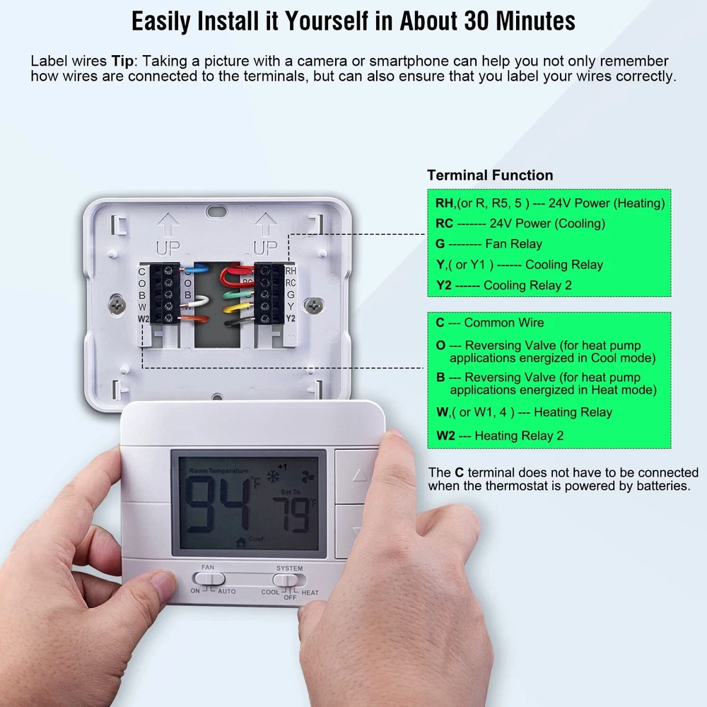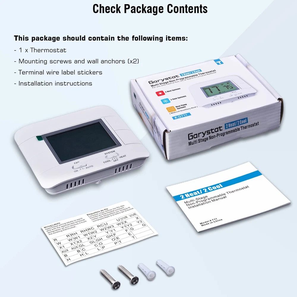 Non programmable thermostat, multi-stage, 2 heating and 2 cooling, electric or gas/oil configurable. (TIPS: before purchasing, check to see if this thermostat is compatible with your old thermostat) Compatible with the following systems: gas, oil or electric furnaces, millivolt system, central heating and cooling system. NOT COMPATIBLE with the following systems: RV thermostats, Heat pump systems, Aux heating, Emergency heating, 120/240v electric baseboard and line voltage systems. Easy to read and use: Large digital display with large characters and green backlight. separate buttons for easy setpoint temperature, very suitable for middle-aged and elderly people to use. Upgrade function: The thermostat with humidity and temperature monitor to ensure you’re always aware of changes in your home environment. It gives precise temperature control with +/- 1 degree in Fahrenheit and Celsius for ultimate consistent control to keep you comfortable. Easy installation and the battery is easy to replace, with dual powered by 24VAC power or 2*AAA batteries, C-wire is not required. built-in low battery reminder, compressor delay protection and more. Please contact us at once if any quality problem, come with 2-years warranty and 24h customer service.