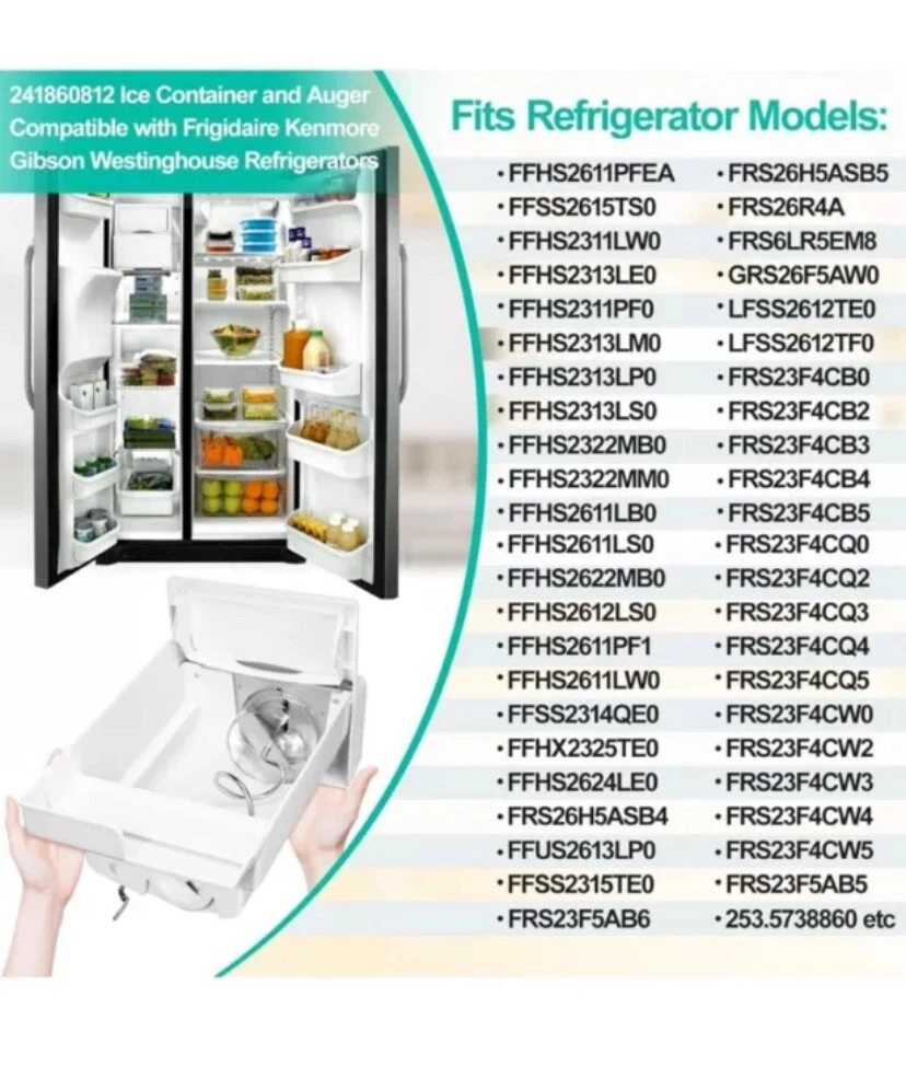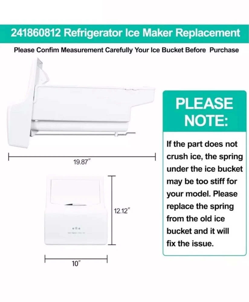 Product Dimensions 19.87"D x 10"W x 12.12"H Capacity 2.4 Gallons Manufacturer Luckman Compatible Refrigerator Models Frigidaire FGUS2647LF0, Frigidaire FGHS2655KE0, Frigidaire FGUS2635LE0, Frigidaire FGUS2637LP0, Frigidaire FGUS2666LE0, Frigidaire FGHS2355KP1, Frigidaire LGHS2655KE0Frigidaire FGUS2647LF0, Frigidaire FGHS2655KE0, Frigidaire FGUS2635LE0, Frigidaire FGUS2637LP0, Fr… See more Material UPGRADED Food Grade Material 【241860812 Ice Maker for Frigidaire Refrigerator】 Upgraded frigidaire ice bucket assembly 241860812 ice container fixes symptoms: A: Ice maker not making ice; B: Ice maker dispenses too little ice C: No ice at all; D: ice buckets are cracks; E: Auger break; F: Ice Makers Freezing up .Note: If the part does not crush ice, the spring under the ice bucket may be too stiff for your model. Please replace the spring from the old ice bucket and it will fix the issue. Size: 19.87"L X 10"W X 12.12"H. 【UPGRADED Food Grade Material-More Strengthen】Upgraded 241860812 Ice Bucket Refrigerator for Frigidaire ice make parts made of environmentally friendly premium thickened food grade materials which is durability, strengthen, pollution-free, safe and exact fit. Our ice maker for frigidaire refrigerator meet OEM standard,high quality Replacement for frigidaire ice maker assembly have good stronger and tougher, let your ice bin bucket works better,each of them has been strictly tested. 【Ice Container And Auger Assembly Easy to Install】241860812 frigidaire ice bin replacement is easy to remove and replace,search for "241860812" on the YouTube to get the installation video and it shows you exactly how to installation. frigidaire ice container and auger assembly. It is located in the ice maker's freezer,The auger arm is made of heavy-duty Stainless steel that rotates