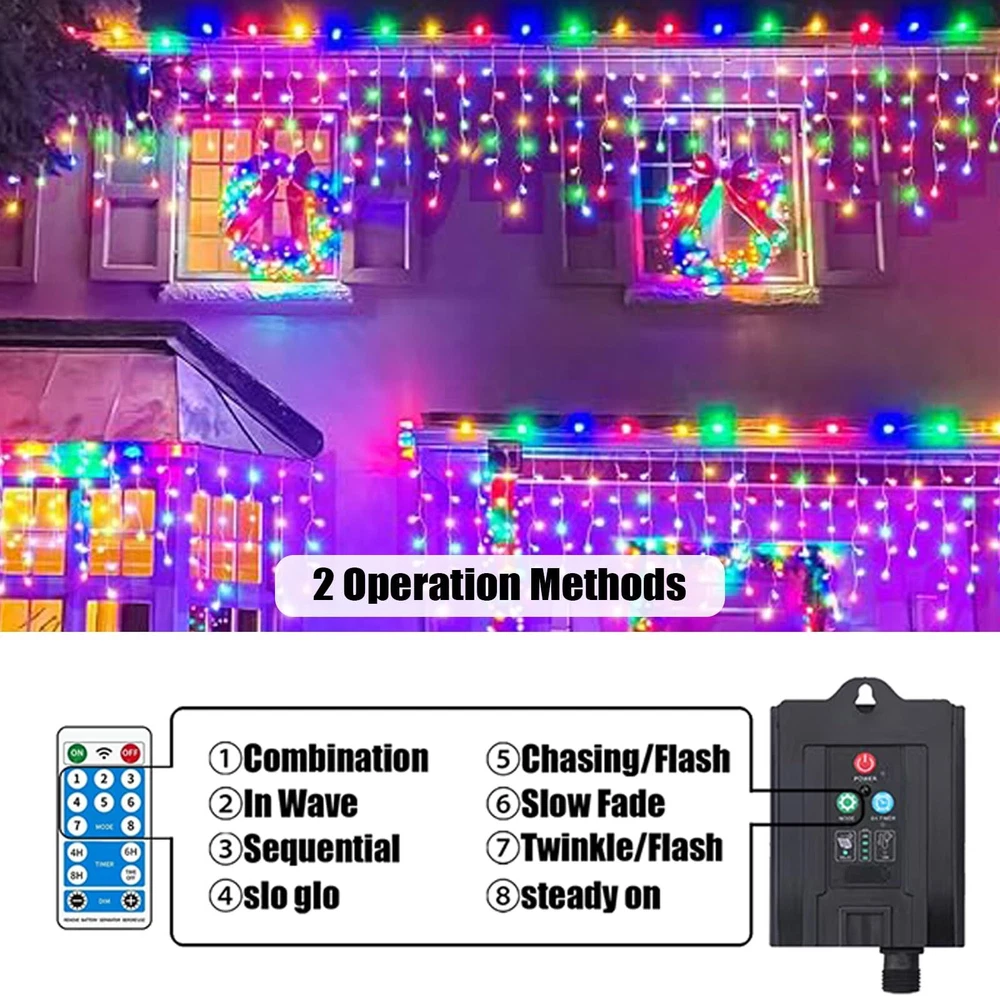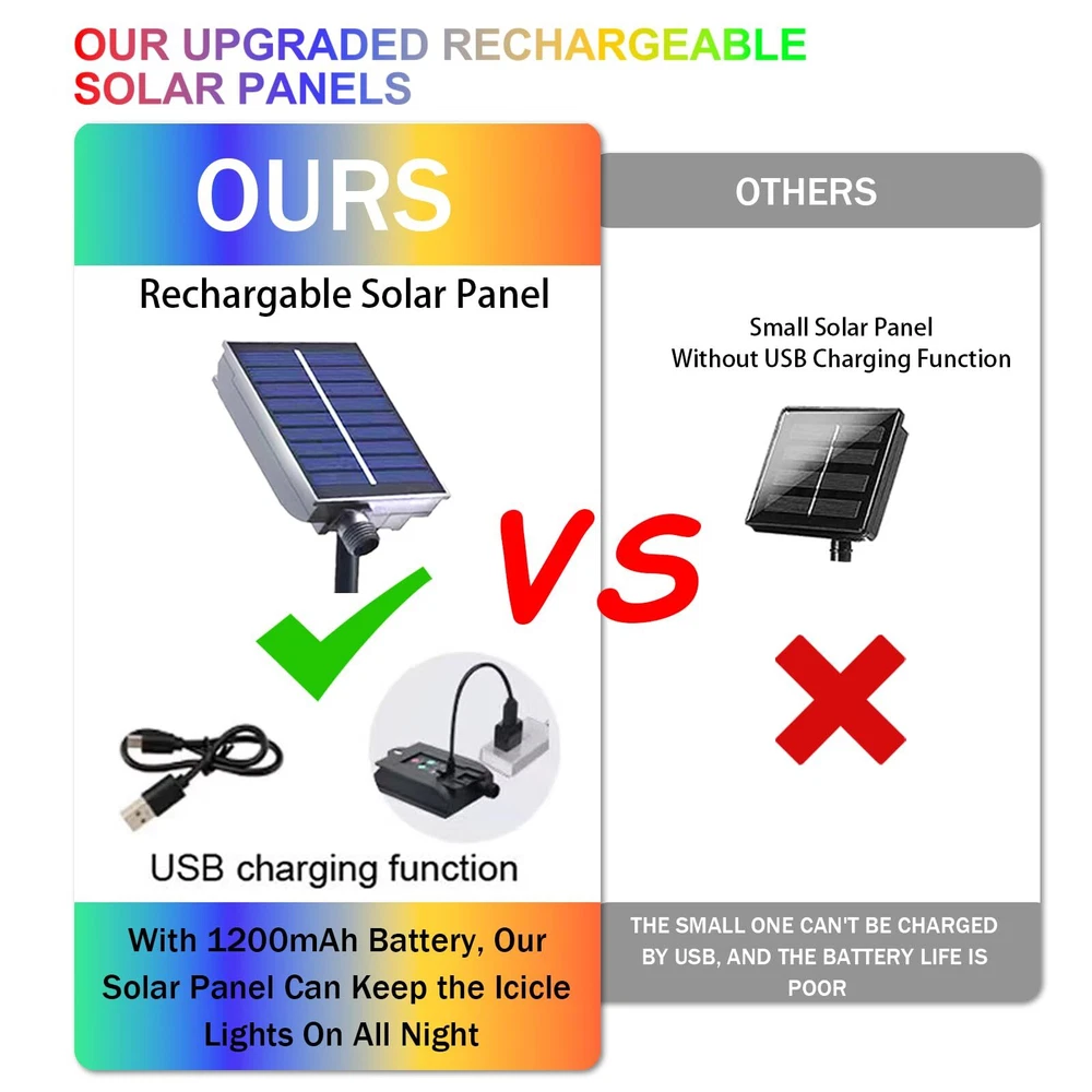 Solar Christmas Lights 【Upgraded Solar Panel】Our upgraded solar panel added power indicate light,this light can display the percentage of power, each cell represents 25% of the power.A USB charging port (5v input) added in the solar panel,you can charge it when cloudy or rainy day.New designed solar panel comes with a clip which allows the solar panel to be clamped to the fence and branches.It's ideal decoration lights for Christmas,Halloween,Thanksgiving,party,garden,patio decor. 【High Quality Christmas Lights】Our 304 Led Iciclelights' leading wire is 16.4ft long, light length is 23ft long with 57 drops.The spacing between drops is 4.7 inch/ 12cm, drop lengths 16 inch- 20 inch- 28 inch, number of light bulbs is 4, 5, and 7 respectively. Classic and beautiful, iciclelights are a popular choice for Christmas and holiday lighting. Roof awnings, overhangs, peaks and windows are popular locations for hanging iciclelights. 【8 Modes & Remote Functions】Not only a functional controller on the solar panel, we also provide a remote controller, which can provide 8 lighting modes,set a 6-hour timer and adjust the brightness using your remote.When you set one of the modes, you don't need to operate any more. When it gets dark, the solar Christmas lights string will automatically work and close according to the previously setting. 【Easy to Use & Energy Saving】best benefit is that it’s all solar powered no electricity and cost bills.without worrying how to plug in lights. Easy to put on, good length to cover the patio, tree branches, Roof, house, porch, yard, balcony, window, Holiday,Christmas Party Decorations. The drops of solar christmas lights lay naturally, they create a professional quality display either hanging on angles or across straight lines. 【IP65 Waterproof & Worry-free Warranty】solar powered is absolutely safe for Children. This Christmas lights are suitable for outdoor & indoor to withstand light rain or water spills.No need to worry of moisture or weather damage or short circuit by heat. If you have any question about product and service, please feel free to contact us, we will do our best to help you in 24 hours.