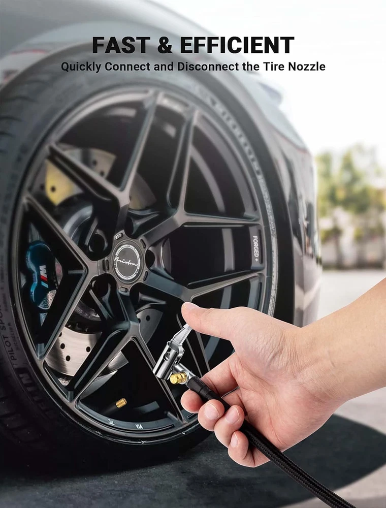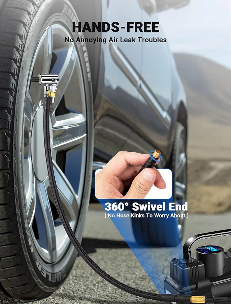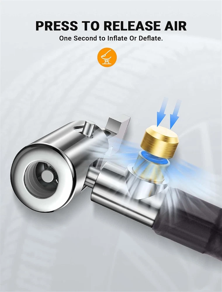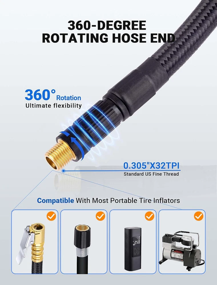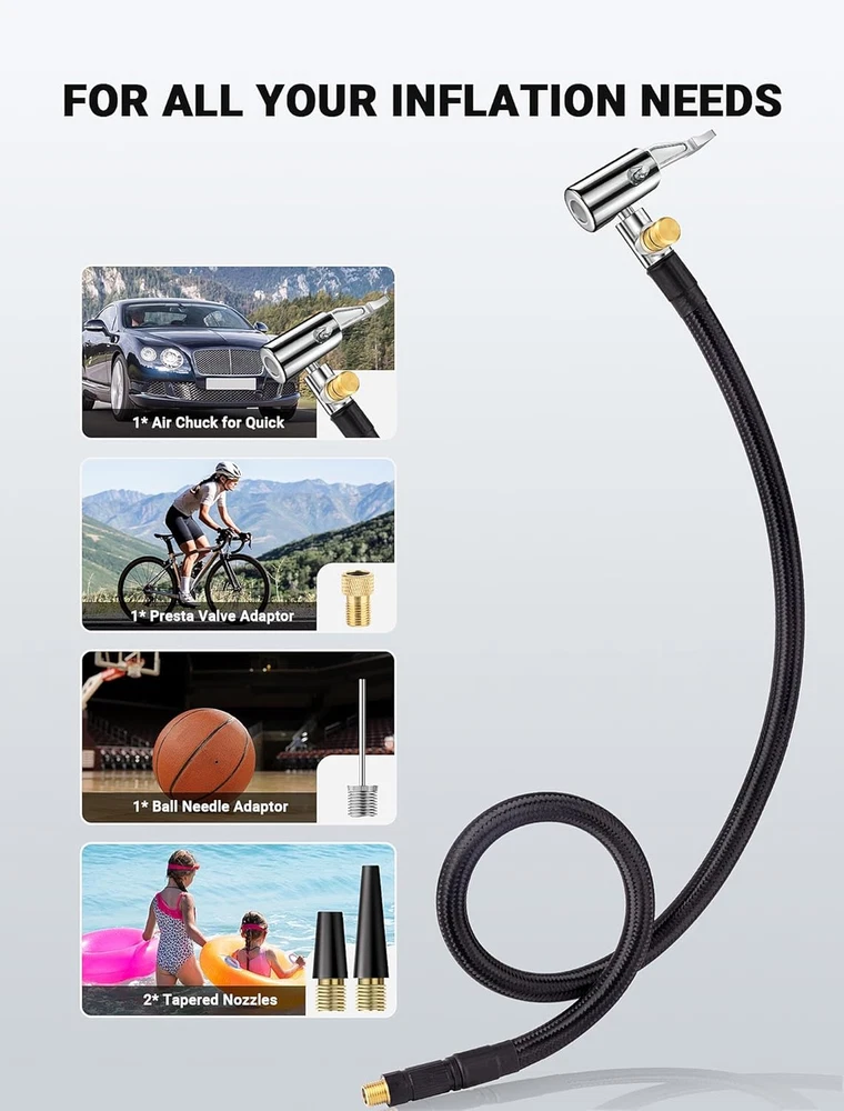 【360-DEGREE ROTATING HOSE END】LUMITECO tire inflator extension hose with swivel hose end designed for ultimate flexibility, ensuring you can inflate with ease from any angle. No more struggling to position your portable air compressor, simply rotate the end of the hose to adjust it to the proper position for inflation. 【UNIVERSAL CONNECTION THREAD】Standard schrader valve fine thread for cars (0.305"x32TPI) Compatible with most portable tire inflators. A schrader to presta valve adapter for bike, motorcycle, car air fill. Also comes with universal needle inflator tools, making them useful attachments for compressors, electric air pumps, also ideal for inflatable toys, sports balls, balloon, swim ring,etc. 【QUICK AIR BLEEDER VALVE】This lock on air chuck hose adapter allows for quick air deflation with a simple and smooth press, designed to be a handy addition when needing to release air from over-inflation without having to remove the pump each time. Thumb press to lock and one second to inflate or deflate. 【SOLID CONSTRUCTION & SECURE LOCKING】High quality strengthened nylon-wrapped rubber hose, sturdy air pump adapter head and quick release locking function make it easy to connect quickly to those space constrained valves and lock tightly onto valve stems in the process of air inflation. This tire pump replacement hose offers strength and durability to withstand frequent use. 【WHAT YOU WILL GET】You will receive 1x 21''/55cm Quick Air Release Hose, 1x Presta Valve Adaptor(American type to French type), 1x Ball Needle Adaptor, 2x Tapered Nozzles. Your essential tire inflation tool in emergency and daily use for quick hands-free inflation. Just buy with confidence, we always stand behind all of our items! Product Description