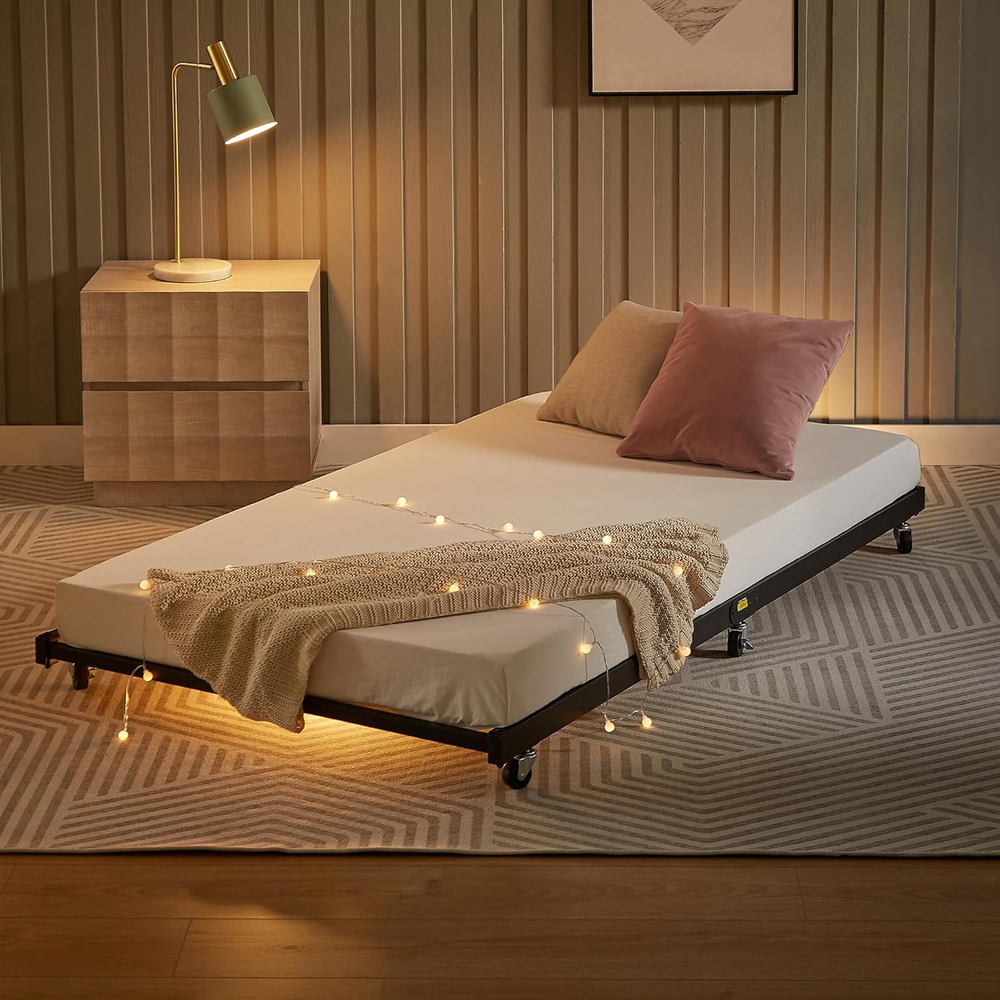 Store New Arrivals Add to Favorite View Feedback Contact Twin Trundle Bed Frame Only/Roll Out/Enhanced & Up-Graded Metal Slats Support with Lockable Casters, Black Description Item model number KHD-LT-Q07-VC021 Style Trundle Bed Material Metal Style Trundle Bed Country of Origin China Compatible With Mattress Size Twin Assembly Required Yes Batteries required No Product Dimensions 70.9"L x 39.2"W x 4.9"H Finish Type Powder Coated Included Components Installation Manual, 1* Trundle, Guardrails Fabric Type Metal Item Weight 23 pounds Ground To Item Distance 4.9 Inches Special Feature No Box Spring Needed, Multi-functional Daybed Frame, Sturdy, Durability, Squeak Resistant Maximum Weight Recommendation 300 Pounds Item Weight 23 Pounds Form Factor Trundle Bed Furniture Finish Alloy Steel Color Black Finish types Powder Coated Product Care Instructions Wipe with Dry Cloth, Wipe with Damp Cloth Size Twin Metal Trundle bed frame: The twin trundle bed Frame is ideal for accommodating family and friends for sleepovers. Also fit for Bedroom; guest room. No quaking & scratching: This trundle bed includes 6 easy-glide casters – two locking and four non-locking. Premium Steel slat support, no shaking, Weight capacity up to 300 lbs. Twin size trundle bed dimensions: 70.9"L x 39.2"W x 4. 9"H (L x W x H). Designed to fit one twin size trundle bed frame mattress (Sold separately). Space saving: This trundle is easy to keep, you could put it under your daybed frame or other places, the surface of the twin trundle bed frame is smooth, and this trundle bed just needs a simple wiping for cleaning. Easy assembly: This trundle bed comes with all accessories, tools, and instruction manual included, no additional tools required. if you need any help. VECELO Twin Size Trundle Bed frame, You Definitely Deserved It! What are our advantages? NO Box Spring Needed NO Squeak & Scratching Space Saving Enhanced Metal Legs Excellent Customer-Service Cost Effective (Price Advantage) Specifications:VELELO Twin Trundle Bed Bed Frame Color: Black/White Style: Trundle Max Load: 400 lb(Twin) Package Includes: 1 x Trundle Bed 1 x Instruction 1 x Assembly Kit Tips: Do not tighten screws until fully assembled. Make sure the legs remain in contact with the ground. Mattress is not included Check all screws or bolts are tightened and inspected regularly. ABOUT US We offer the best prices around on high quality products. Our E-store includes media such as books, movies, music and games while offering electronics, toys, sporting apparel, clothing, tools, general home, garden items and more. SHIPPING We are always working hard to ensure your package arrives as soon as possible. Please understand that some factors like weather, high postal traffic, and the performance of shipping companies are outside of our control. We offer free shipping to the lower 48 states and ship within 2 business days of payment, usually sooner. We do not accept P.O. Boxes. Please provide a physical address. For shipping outside of the continental USA, we only use eBay's Global Shipping Program.The item is shipped to KY and then sent to the rest of the world. International customers are responsible for all duties and taxes. Continue to check out in order to calculate costs for shipping the item to your country. Messages regarding eBay's Global Shipping Program MUST be directed at eBay EXCLUSIVELY. RETURNS We offer a 30-Day Return Policy on items which you are not completely satisfied with. You have the option for a full-refund or an exchange of the item. No returns are available on items shipped outside of the USA. PAYMENT We accept PayPal. CONTACT US This page content is yet to come Please ad us to your favorite seller and visit again later Thank You CUSTOMER SATISFACTION We try our very best to make sure every customer is completely satisfied. If there's a problem, message us! We're happy to help. WE ACCEPT Copyright © 2021 AutoDS. | All Rights Reserved