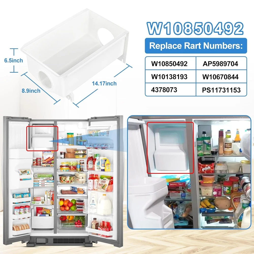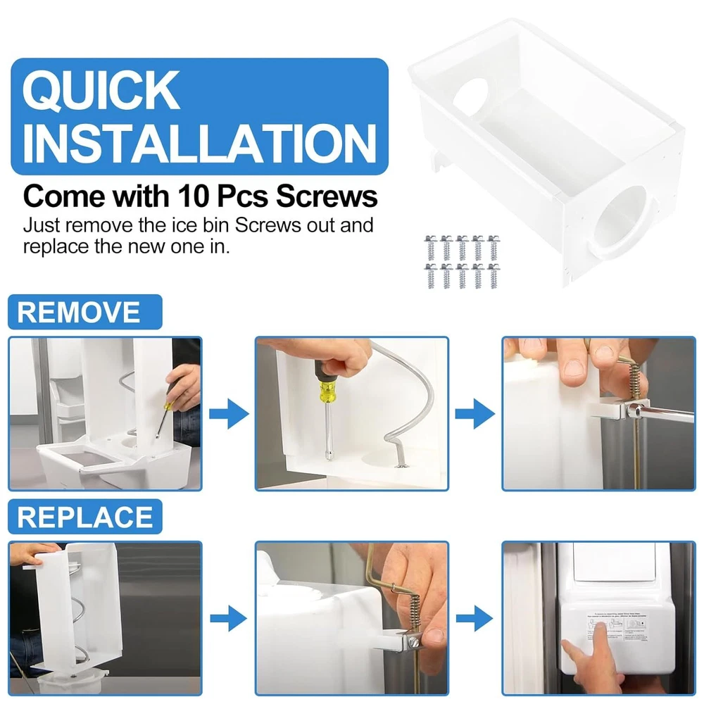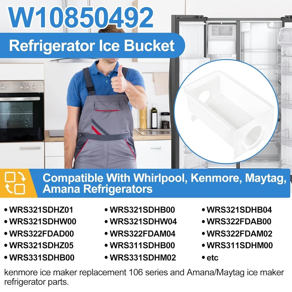 Upgraded W10850492 Refrigerator Ice Bucket Compatible with Whirlpool Kenmore Maytag Amana Ice Maker Replacement Parts W10670844 Ice Container Bin WRS321SDHB00 WRS322FDAM04 WRS321SDHZ05 WRS321SDHZ08 Product Details Brand: ALVAR Product Dimensions: 6"D x 4"W x 2"H Capacity: 13488 Cubic Centimeters Voltage: 115 Volts 【W10850492 Refrigerator Ice Container for Whirlpool Ice Maker Parts】W10850492 ice bucket Compatible with Whirlpool, Kenmore, Maytag, Amana refrigerators Parts ,fit Whirlpool refrigerator parts models: WRS321SDHZ01, WRS321SDHB00, WRS321SDHB04, WRS321SDHW00, WRS321SDHW04, WRS322FDAB00, WRS322FDAD00 , WRS322FDAM04, WRS322FDAM02, WRS321SDHZ05, WRS321SDHW05, WRS321SDHZ08, WRS311SDHB00, WRS311SDHM00, WRS331SDHB00 etc; kenmore ice maker replacement 106 series ice bucket and Amana ice maker refrigerator parts. 【UPGRADED Premium Food Grade Material】W10850492 refrigerator ice bucket for whirlpool ice bin replacement made of environmentally friendly premium thickened food grade materials,durable and strengthen. Our whirlpool ice maker parts meet OEM standard. Please note, this is the container only and does not include any auger parts. 【Refrigerator Ice Bucket Easy To Install-Come with 10 Pcs Screws】Ice Bucket assembly W10850492 whirlpool ice tray part /kenmore ice bucket was easy to install. Just remove the ice bin Screws out and replace the new one in. W10850492 whirlpool refrigerator ice bucket come with 10 Pcs Screws and one pack Refrigerator Ice Bucket parts. 【Warm Note】To avoid damaging the ice container, please needs to check the ice Bucket from time to time to make sure there are no hardened large blocks of ice that can crack the container when the mechanism is activated. Please check your refrigerator model before order.