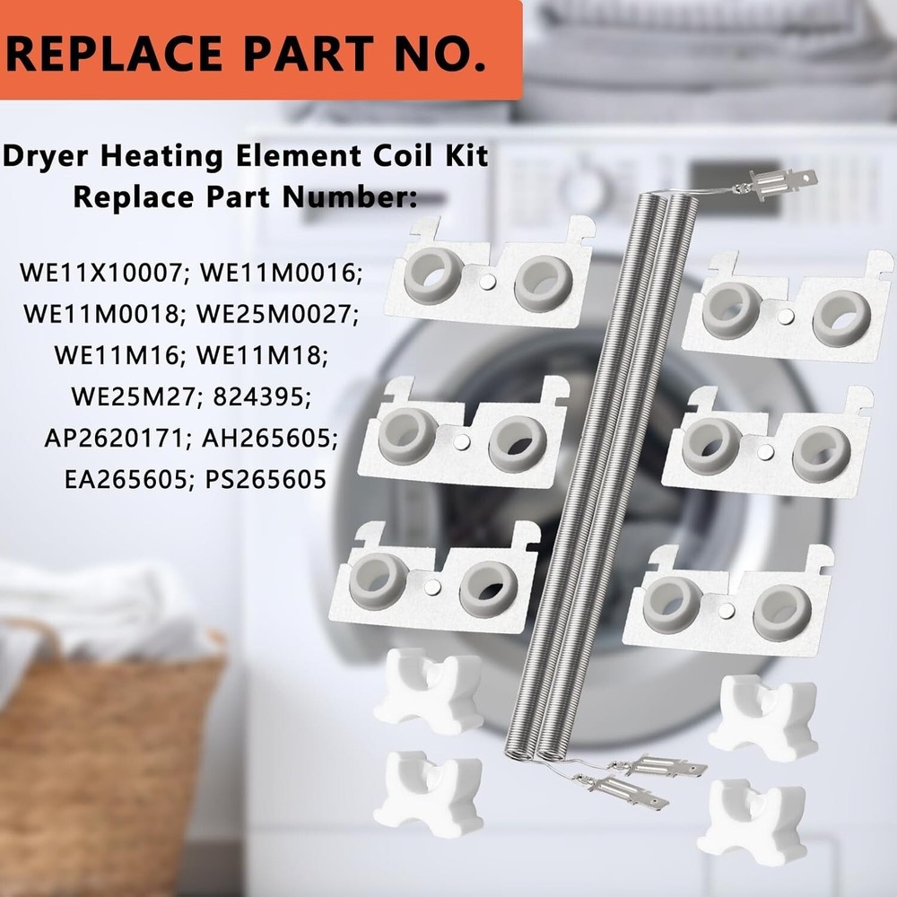 Upgraded Dryer Heating Element Coils Kit WE11X10007 WE11M23 with 6 Ceramics Insu PACKAGE INCLUDE-- 2*Dryer heating element restring coil; 6*Ceramic insulators; 4*Insulator blocks and 1*Installation instruction QUALITY GUARANTEED-- WE11X10007 Dryer restring heating element coil kit is made from high quality material and well-tested by the manufacturer, ensuring heat resistance as well as long-term use SAVE TIME AND MONEY-- This WE11X10007 heater coil kit saves you the service fee of the appliance maintenance personnel. Inexpensive way to fix or repair a dryer WIDE COMPATIBILITY-- Dryer restring heating element kit is compatible with GE, Hotpoint and Ken-more dryer. Replace part numbers: AP2620171, 824395, AH265605, EA265605, PS265605, WE11M16, WE11M0016, WE11M18, WE11M0018, WE25M27,WE25M0027 FIX SYMPTOMS-- ❶Dryer making grinding noises ❷Dryer squeaked when running ❸Dryer making a loud noise ❹No heat or Not enough heat ❺Takes too long to dry Return Policy: We offer a 30 day return policy from the receiving date. Please contact us for a Free Return Label. Please use our return label so it will go back to our supplier and we can do a refund or replacement afterwards. Feedback: Your satisfaction is very important to us! If you have any problem with your order, please contact us and we will do our very best to make you satisfied. As long as you are happy with your purchase, please leave a positive feedback for us. We will always leave you a positive feedback in return. If you have any problem with your purchase, please do not leave a negative feedback. Please Contact us ... and your issue will be solved quickly and positively We are a small family-owned business trying to make a living, not a huge company that does not care ... We will ALWAYS do our best for you!