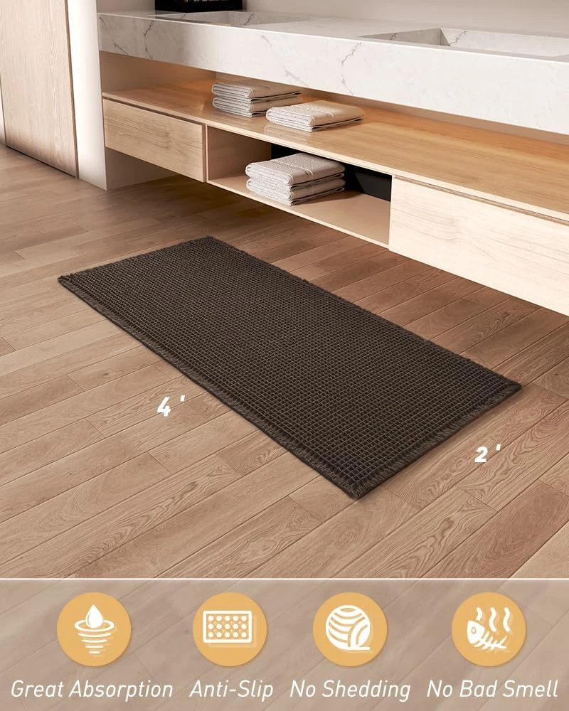 Upgraded Waffle Desgin: This boho bath mat is power-loomed with upgraded yarns-Integrating decoration and durability. The heavier and thicker threads are applied to make sure the pattern will be more solid and compact- NEVER OUT OF SHAPE! Great Water Absorption: Double layer of deep waffle texture absorbs water instantly and more breathable. In addition, the yarns we use is inherently absorbent-it absorb water like crazy. This absorbent bath mat can soak up the water and keep your floor dry like a giant sponge, and protect your feet from the cold floor. Clear Rubber Backing: This non slip bath mat is designed with clear rubber backing(HMA-Hot Melt Adhesive, invisible but touchable). This bathmat firmly grips the ground to prevent you and your families from falling. Comfortable and Soft: Three-dimensional waffle design combined with flexible yarns make the bathroom floor mat softer and cozier. Bring you a comfortable underfoot feeling. Enjoy a comfort space when you finishing shower. Easy to Maintain: Machine washable bathroom rugs provide convenience in your daily life. Recommend gentle mode,cold water. Or just shake the dust off from the bath rugs for simple cleaning. Product Description