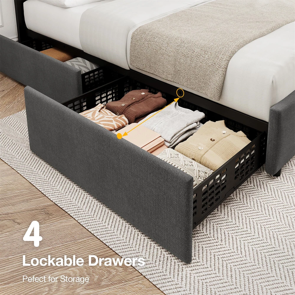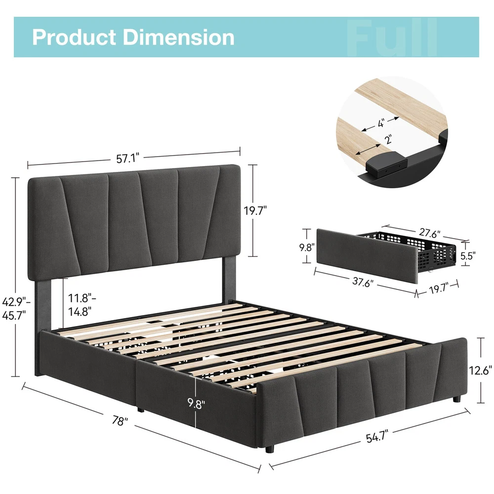 🔥Upholstered Full Size Bed Frame with 4 Storage Drawers Headboard Platform Bed