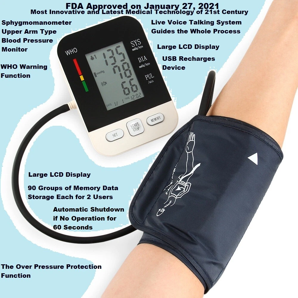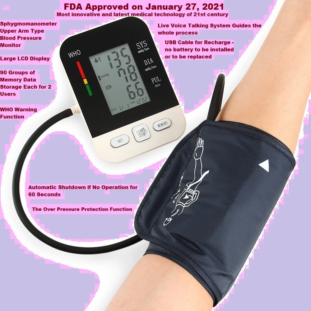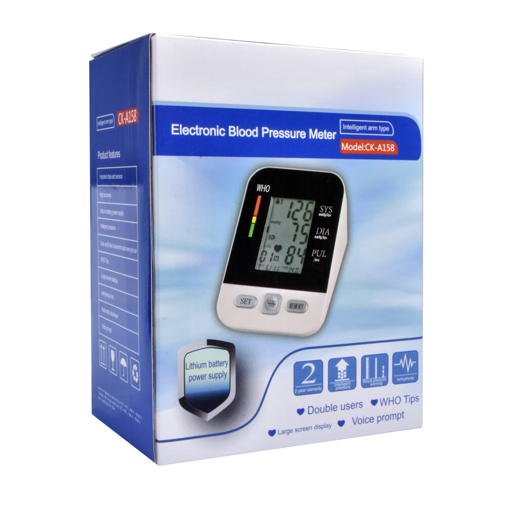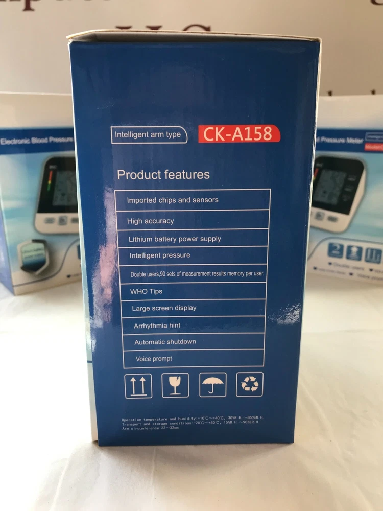 Quick Details: Upper Arm Blood Pressure Monitor Digital, Automatic, Electronic Sphygmo manometer USB recharge Digital Electronic Model CK-A158 Full Automatic Upper Arm Type Live Voice Talking System Blood Pressure Monitor Sphygmomanometer No hassle of buying or replacing dry battery !! FDA Approved January 27 2021 FDA CE ISO13485\ certification Power Supply Mode: USB recharge Material: Plastic Quality Certification: CE/ FDA/ ISO13485 Instrument classification: Class II Safety standard: GB/T18830-2009 Name: Digital Arm Blood Pressure Monitor Function: Blood Pressure Checking Response Time: About 60 seconds Memory: 2*90 Groups Memory Pressure Range: 0 to 280 mmHg(2.7 to 40 KPa ) Pulse Range: 40 to 200 beats/minute Working voltage: DC 5V 0.5A type B Display: Digital LCD Display Power source: Lithium battery Certificate: CE/ FDA/ ISO13485\ Product Description Product Name Arm Type Blood Pressure Monitor Response Time About 60 seconds Memory 90 memory in 2 groups Display Model Digital liquid crystal display LCD Size 45*65mm Measurement Range Pressure Range?0 to 260 mmHg? Pulse Range?40 to 199 beats/minute? Accuracy Pressure ?± 3mmHg (± 0.4KPa )? Pulse?± 5%? Cuff size 22cm-32cm Package Size 138*98*178mm(L x W x H) Gross weight 502g Battery Lithium battery 3.7V B type Features 1. Lithium battery fuselage integrator; 2 . live voice Talking system guides the whole process and reports the result; 3. 90 sets of double data memory function; 4. WHO blood pressure health status warning strip; 5. Clear large screen LCD digital display; 6. Cycle charging, no pollution, environmental protection and quick? Model Number: CK-A158