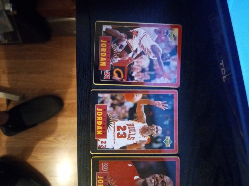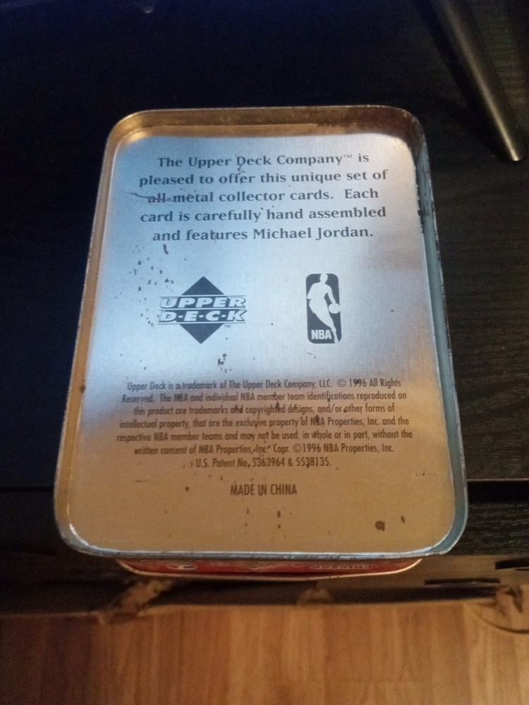 The Upper Deck Michael Jordan 5 All-Metal Collector Cards NBA Tin 1996 is a highly sought-after vintage sports trading card set featuring basketball legend Michael Jordan. This limited edition set includes 5 standard-sized cards made of metal, with each card showcasing a different aspect of Jordan's career with the Chicago Bulls. As an original licensed reprint by Upper Deck, these collector cards are a valuable addition to any basketball card collection, especially for fans of Michael Jordan and the NBA.
