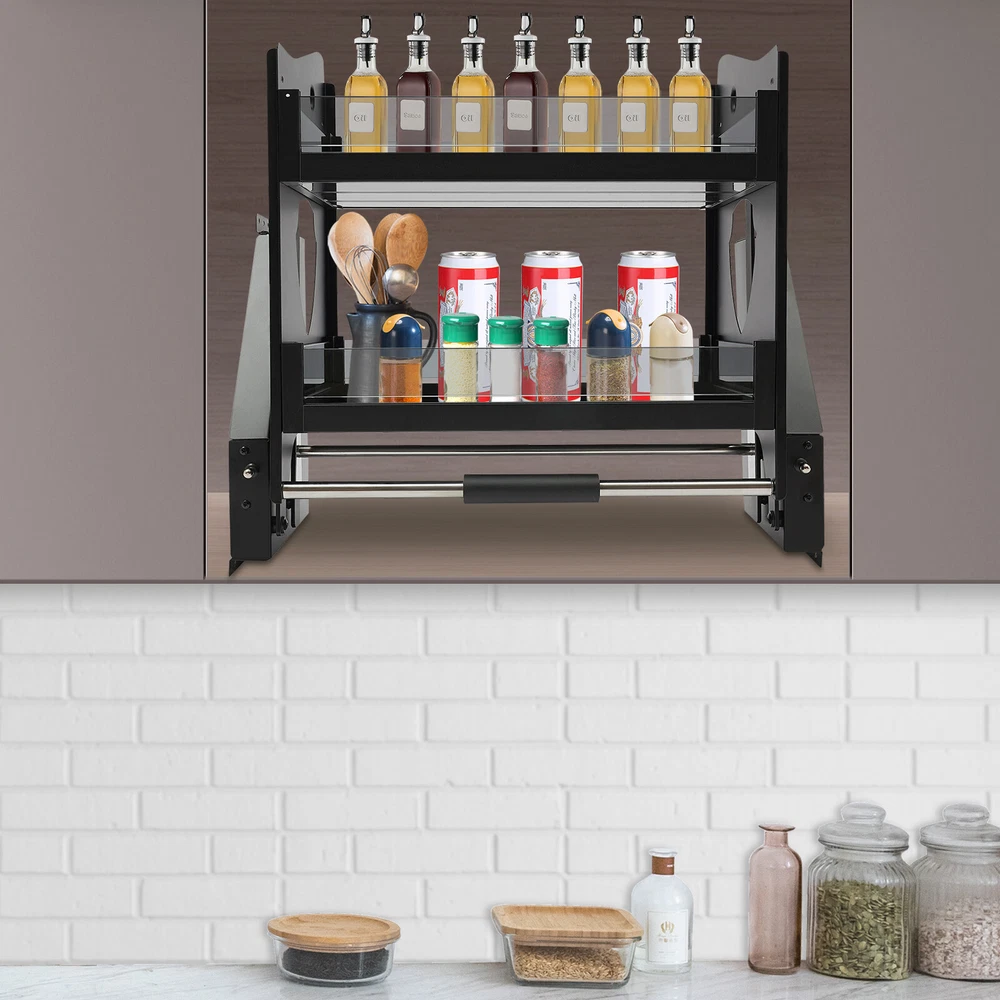 Pull Down Shelf Upper Kitchen Wall Cabinet Storage Organizer (24inch Cabinet) Description Say goodbye to the inconvenience of traditional kitchen cabinets with fixed heights, our pull-down cabinet organizer can be easily lowered to the most suitable working height for you, making the cooking process more energy-saving and comfortable. It's a scientific and reasonable layout to meet your needs for a variety of storage of kitchen utensils so that you can enjoy convenience at the same time, but also keep the kitchen clean and orderly, showing the aesthetics of modern life. Key Features Sturdy and Durable: The product is made of high-quality carbon steel, space aluminum, and tempered glass, using baked paint technology, with high strength, wear resistance , and long service life. Storage Assistant: The 2 tiers of open shelves provide you with plenty of space for spices and other kitchen tools, which are reasonably partitioned to keep your kitchen organized. Excellent Load-bearing Capacity: The thickened double rod rocker arm, high-quality material, 5mm thick toughened glass, and strong screw fixation make it more stable, and the weight capacity of the product can reach up to 66.14 lbs, which allows you to place various items with confidence. Smooth Push-pull: The advanced two-way hydraulic damping cushioning system and powerful coiled spring windings ensure easy pull-down and stable push-back while keeping items free from impact and people from having to shift and exert themselves. Thoughtful Design: Through the left and right side adjustment buttons, the product can provide three levels of assistance( 2.2-11.02 lbs , 11.02-15.4 lbs , 13.22-26.4 lbs ), so that you can adjust the rebound strength and balance strength according to the weight of the items you put in it, effectively preventing it from going down too fast. Adjustable Width: The width of the product can be adjusted by 0.59 inches on the left and 0.59 inches on the right, meeting your installation needs in the cabinet. Convenient to Use: This product can be pulled down about 11.81 in ches from a high cupboard, allowing you to easily remove items from the cupboard, making it very friendly for older people and teenagers. Space-saving: It makes the most of unreachable high cupboard space while increasing worktop space, improving space utilization without taking up space for everyday activities, and making the room more spacious. Easy to Clean: The smooth surface and angular structure design allow you to easily remove dust from the surface of the product with a towel. Customer Service: We aim to provide high-quality products and services. If you have any questions, please feel free to contact us. We will reply as soon as possible and solve the problem for you. Details Practical Handle: The foam grip is non-slip and easy to grip. Extended Rocker Arms: They make the product drop quickly in one step. Raised Fence: It prevents the accidental dropping of placed objects. Pre-drilled Holes: They enable you to mount and fix this product directly into the cabinet. Application This product is suitable for dish racks, spice racks, and food storage racks in upper cabinets in kitchens, bars, coffee cabinets, pantries, wardrobes, wardrobes, etc. for storing snacks, bowls, plates, spices, condiments, spice bottles, other kitchen items. Specifications Style: Modern Shape: Rectangular Color: Black Material: Carbon Steel, Space Aluminium, Tempered Glass Surface Treatment: Baked Paint Shelf Type: Sliding Shelf Mount Type: Inside the Cabinet Assembly Required: Yes Indoor/Outdoor Usage: Indoor Number of Tiers: 2 Max. Load-bearing Capacity: 30kg/ 66.14 lbs Drop-down Depth: About 30cm/ 11.81 in Right Switch Loaded: 5kg/ 11.02 lbs Left Switch Loaded: 5kg/ 11.02 lbs Applicable Cabinet: Width: 56-59cm/22.05-23.23 in; Depth: >28cm/11.02 in; Height: >56cm/ 22.05 in Three-gear Adjustment: 1-5kg/2.2-11.02 lbs, 5-7kg/11.02-15.4 lbs, 6-12kg/13.22-26.4 lbs Tier Height: 25cm/ 9.84 in Each Basket Height: 7cm/ 2.76 in Each Basket Width: 24.5cm/ 9.65 in Each Outer Basket Width: 26cm/ 10.24 in Overall Product Size: 56*28*53cm/ 22.05*11.02*20.87 in Package Size: 65*34*34cm/ 25.59*13.38*13.38 in Gross Weight: 12kg/ 26.45 lbs Net Weight: 10kg/ 22.05 lbs Package Included 1* Pull-down Cabinet Organizer 1* Chinese Installation Diagram Other Accessories Required for Installation Notes Please note that when this product is running, it is strictly prohibited to operate the booster button, and it can be operated after it is pushed into the cabinet. Please do not use hard tools to clean the shelf. Please allow the slight color difference caused by the shooting light and 1-3cm error due to manual measurement, and make sure you do not mind before you order. Payment Delivery details Terms of sales About us Contact us Payment We accept ebay payment 。 Fees such as import duties, taxes are not included in the item price or shipping costs. These charges are the buyer's responsibility. Delivery details Shipping: 2-9 working days to: USA Terms of sales We maintain high standards of excellence and strive for hundred percent customer satisfaction. Feedback is very important to us. We hope that you contact us immediately before you give neutral or negative feedback, so that we can address your concerns. It is impossible to address issues if we do not know about them! About us Your satis faction is our ultimate goal. We work hard to earn your trust and future business. Our certified technicians have tested each item before shipping. The unit comes with 1 year limited warranty on all manufacturing defects. a) If you receive a defective item, you may return it or ask for a discount. Please contact us within 14 days after you receive the package. b) What you returned must be intact and in its original packaging as re? u. Customer is responsible for shipping costs of the returned item. c) We will cover the cost of shipping back t with the shipping rate indicated in the registration page. We will se