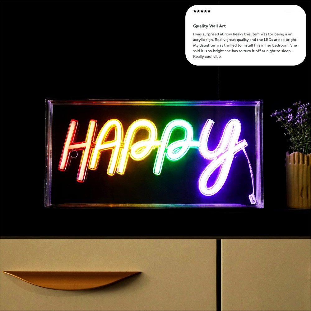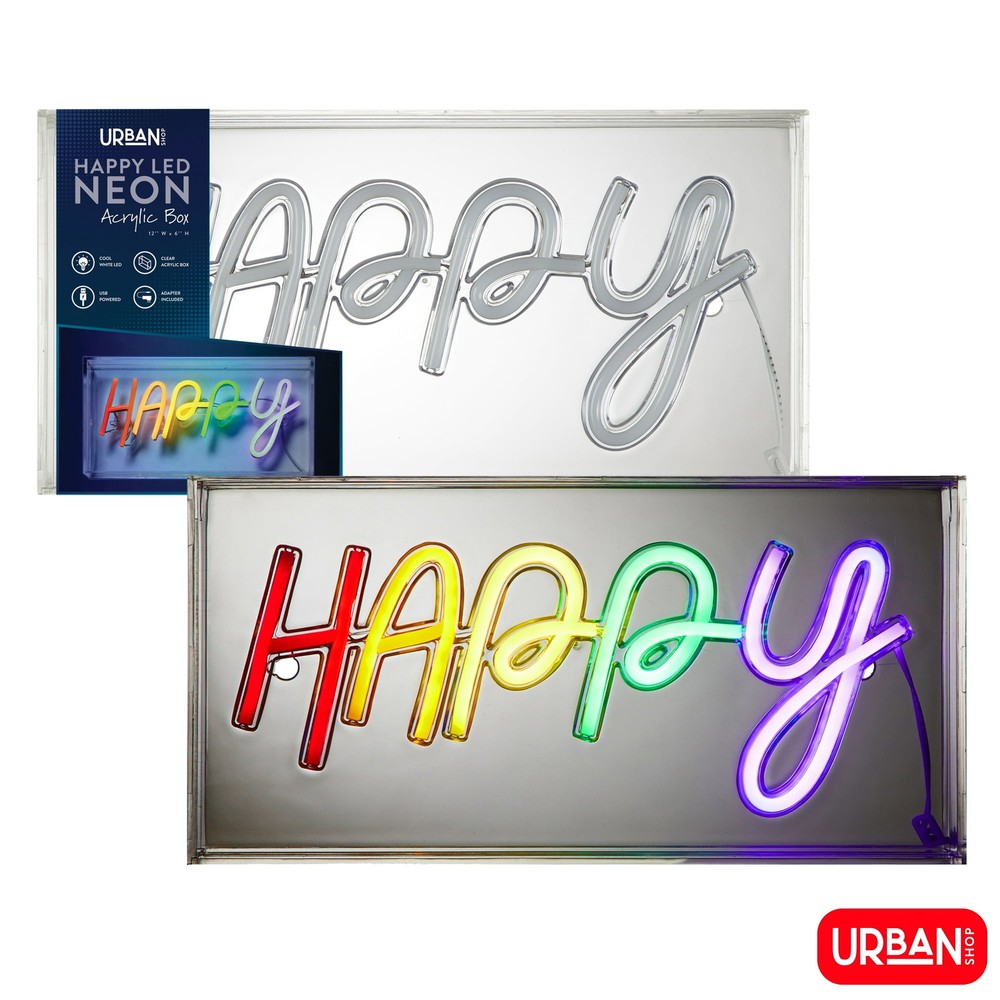 Brighten up your shop or home decor with this colorful LED neon light box from Urban Shop. Measuring 5.90 inches in height, 11.81 inches in length, and 1.85 inches in width, this clear acrylic box is the perfect size for any room. The box features a rainbow design that emits energy-efficient and eco-friendly LED lights, making it a great addition to any space. With its unique happy theme, this light box is perfect for those who want to add a touch of whimsy to their decor. The item weighs only 1.5 lbs and is easy to hang in any room. Whether you're looking to brighten up your shop or add some color to your home, this Urban Shop LED neon light box is the perfect choice.