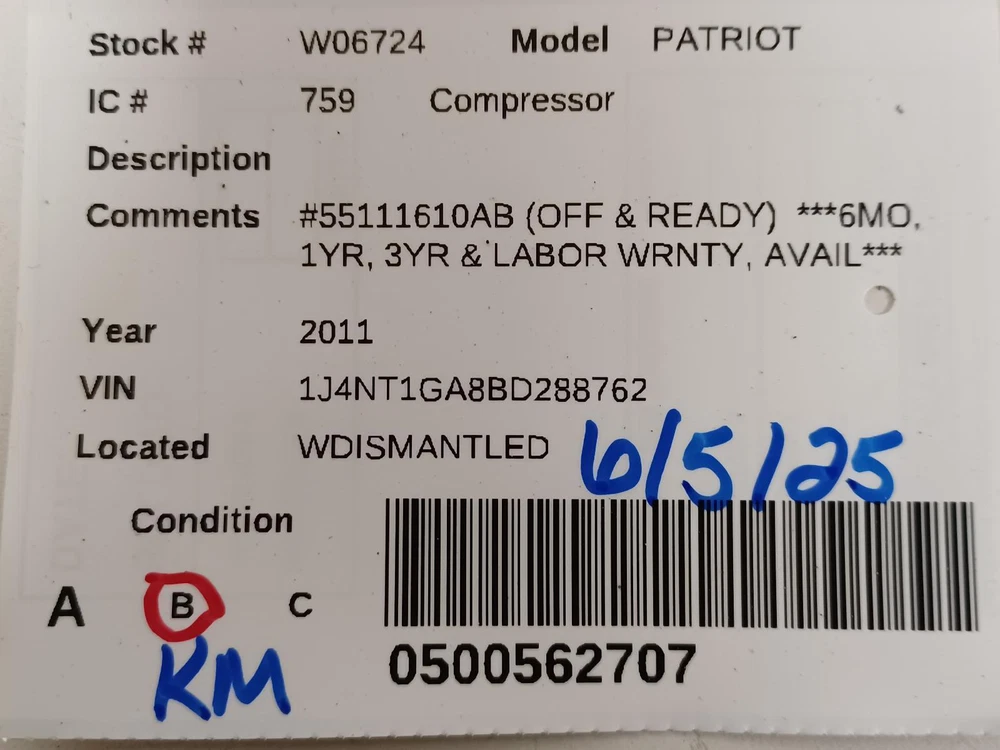 eBay WHI Template Used A/C Compressor fits: 2011 Jeep Patriot Grade A **90 Day Warranty** **Free Shipping** SELLER & PAYMENT INFORMATION Seller name westwood_auto_parts See our other listings CUSTOMER SUPPORT If you have questions about the product or your order please contact us via eBay Messages for assistance. Thank you. Business Hours 9 am to 5 p.m. PST, MON to FRI. SHIPPING & HANDLING Shipping Service Please refer to shipping section Shipping Cost Please refer to shipping section Order Processing Time 1 business day PART DETAILS Brand UNITED RECYCLERS GROUP Part Number 409088 Item Description A/C Compressor Quantity Needed 1 ITEM SPECIFICS Description Why Buy Recycled? Save money and time in the repair shop. Original parts mean a perfect fit. Every part is cleaned, tested and inspected by experts. All parts are covered by warranty. Parts go back into cars rather than landfill. Type A/C Compressor See Item Specifics section for additional specifications about this part. Additional Information We distribute A/C Compressor's. This is a recycled product. URG is a group of certified recyclers of quality replacement parts. Unless specified as Universal this is a direct fit A/C Compressor. A reminder that this listing is for a single A/C Compressor which may be less than you need for your application. Check the fitment information for the qty your vehicle requires.. Last Updated: 03/15/2025 12:39:17 PM Vehicle Fitment Summary To confirm that this part fits your vehicle, enter your vehicle's Year, Make, Model, Trim and Engine in the Compatibility Table . Also review the notes section in the compatibility chart for additional specifications about this part. This part generally fits Dodge,Jeep vehicles and includes models such as Caliber,Compass,Patriot with the trims of 75th Anniversar y Sport Utility 4-Door,Altitude Sport Utility 4-Door,Base Sport Utility 4-Door,Express Hatchback 4-Door,Heat Hatchback 4-Door,High Altitude Sport Utility 4-Door,Latitude Sport Utility 4-Door,Latitude X Sport Utility 4-Door,Limited Sport Utility 4-Door,Mainstre et Hatchback 4-Door,R/T Hatchback 4-Door,Rush Hatchback 4-Door,SE Hatchback 4-Door,Sport Sport Utility 4-Door,SRT-4 Hatchback 4-Do or,SXT Hatchback 4-Door,SXT Plus Hatchback 4-Door,Uptown Hatchback 4-Door. The engine types may include 1.8L 1798CC 110Cu. In. l4 GAS DOHC Naturally Aspirated,2.0L 1998CC 122Cu. In. l4 GAS DOHC Naturally Aspirated,2.4L 2360CC 144Cu. In. l4 GAS DOHC Naturally A spirated,2.4L 2360CC 144Cu. In. l4 GAS DOHC Turbocharged,2.4L 2360CC 144Cu. In. l4 GAS SOHC Naturally Aspirated. This part fits ve hicles made in the following years 2008,2009,2010,2011,2012,2013,2014,2015,2016,2017. To confirm that this part fits your vehicle, enter your vehicle's Year, Make, Model, Trim and Engine in the Compatibility Table . Also review the notes section in the compatibility chart for additional specifications about this part. Interchange Part Numbers This item may interchange to the following part numbers from other brands. This is provided for reference only and does not guarantee that the part your are buying is identical to the part numbers from the brands listed below. To confirm that this part fits your vehicle, enter your vehicle's Year, Make, Model, Trim and Engine in the Compatibility Table . Brand UNITED RECYCLERS GROUP Part Numbers 55111610AA, 55111610AC ABOUT THE SELLER Westwood Auto Parts is located in Toledo, OH and we offer over 30 years in the salvage yard industry. Our auto parts store specializes in providing excellent quality used car parts at insanely low prices. We carry a terrific selection of fine quality used auto components to make your repairs or replacements easy and fast. Better yet! All of Westwood Auto parts come with a standard 90-day warranty and at incredibly low prices. You can find a variety of options for purchasing parts with us, including visiting our store and through our online search feature. We relish the opportunity to have you as a loyal customer of Westwood Auto Parts. WARRANTY Warranty Duration 90 Day Warranty Type Dealer Warranty Portions of the part information on this page have been provided by WHI Solutions, Inc. All rights reserved.