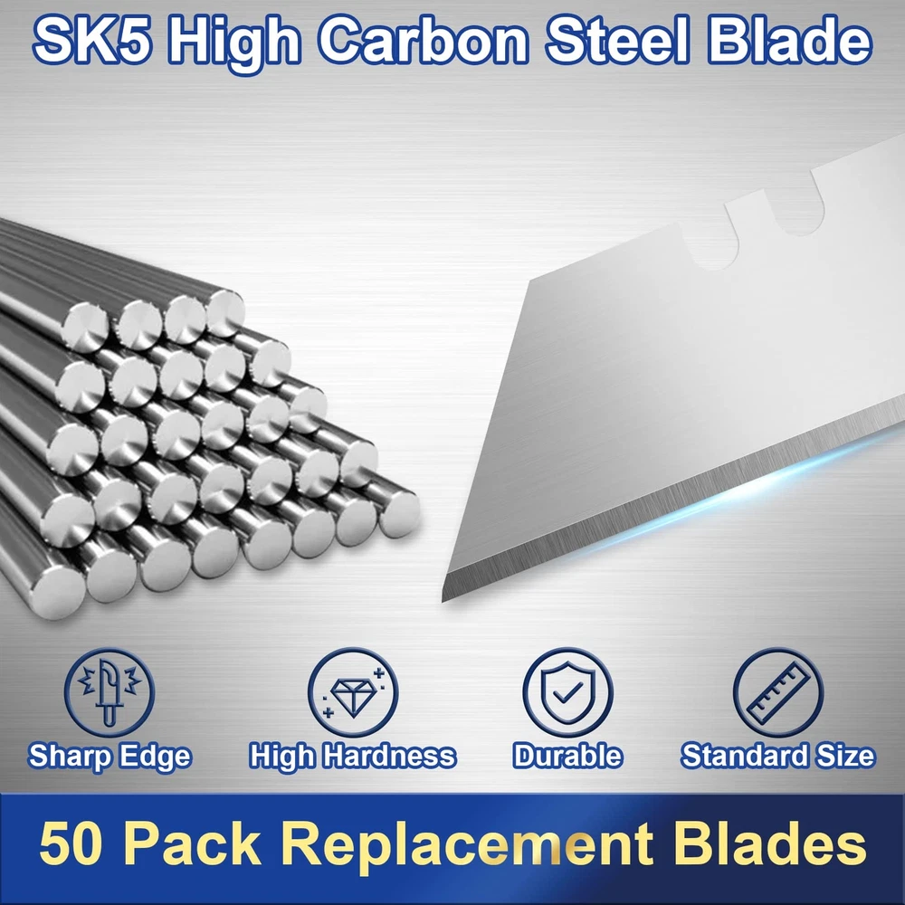 Utility Knife Blades, 50 Pack Box Cutter Blades, SK5 High Carbon Steel Utility Blades, Standard Size Blades for Box Cutter, Sharp Box Cutter Blades Refills, Razor Knife Blades for Cutting 【High Quality SK5 High Carbon Steel】This utility knife blade is made of high quality SK5 high carbon steel. The blade made of this material is not easy to rust. It is specially designed for heavy utility knife. The solid steel makes the blade have a longer service life. 【Sharp & Durable】The edge of the box cutter blade has been precisely honed. The blade is extremely sharp, which can easily complete your cutting work and maximize efficiency. The blade is not easy to bend or break. Please be careful when using it to avoid cutting fingers. 【Handheld Dispenser】These knife blades are packed in a box carefully designed by us, which is safe and convenient for storage. The blade box is 9.7CM/3.8 Inch long and 7CM/2.8 Inch wide, with three holes on the top. You can hang it anywhere. You can safely take out one blade each time. The number of remaining blades can be seen on the transparent side. 【Widely Used】Standard size utility knife blade, 3.2CM/1.26 Inch in upper width, 6CM/2.37 Inch in lower width, 18.6CM/0.73 Inch in height, is perfect for both retractable box cutter and folding utility knife. You can cut cardboard, leather, rope, rubber or PVC after installation. 【After Sales】If you encounter any problems in using the blade, please contact us immediately. We are happy to help you solve any problems you encounter in a timely manner. Each blade has been strictly tested. aims to provide people with more professional and high-quality knife tools. Shipping We offer FREE shipping on all orders! We ship within Three business days of payment, usually sooner. We use a selection of shipping services such as UPS, FedEx, USPS etc. We only ship to the lower 48 states, no APO/FPO addresses or PO Boxes allowed. Local pickups and combined shipping options are not provided at this time. Return You can return a product for up to 30 days from the date you purchased it. Any product you return must be in the same condition you received it and in the original packaging. Please keep the receipt. Payment We accept payment by any of the following methods: PayPal Please pay as soon as possible after winning an auction, as that will allow us to post your item to you sooner! Feedback Customer satisfaction is very important to us. If you have any problem with your order, please contact us and we will do our best to make you satisfied. Contact Us If you have any queries, please contact us via ebay. We usually respond within 24 hours on weekdays. Please visit our eBay store to check out other items for sale! Thank you for shopping at our store.
