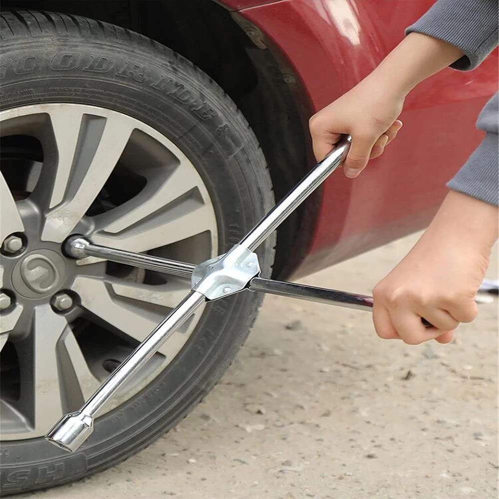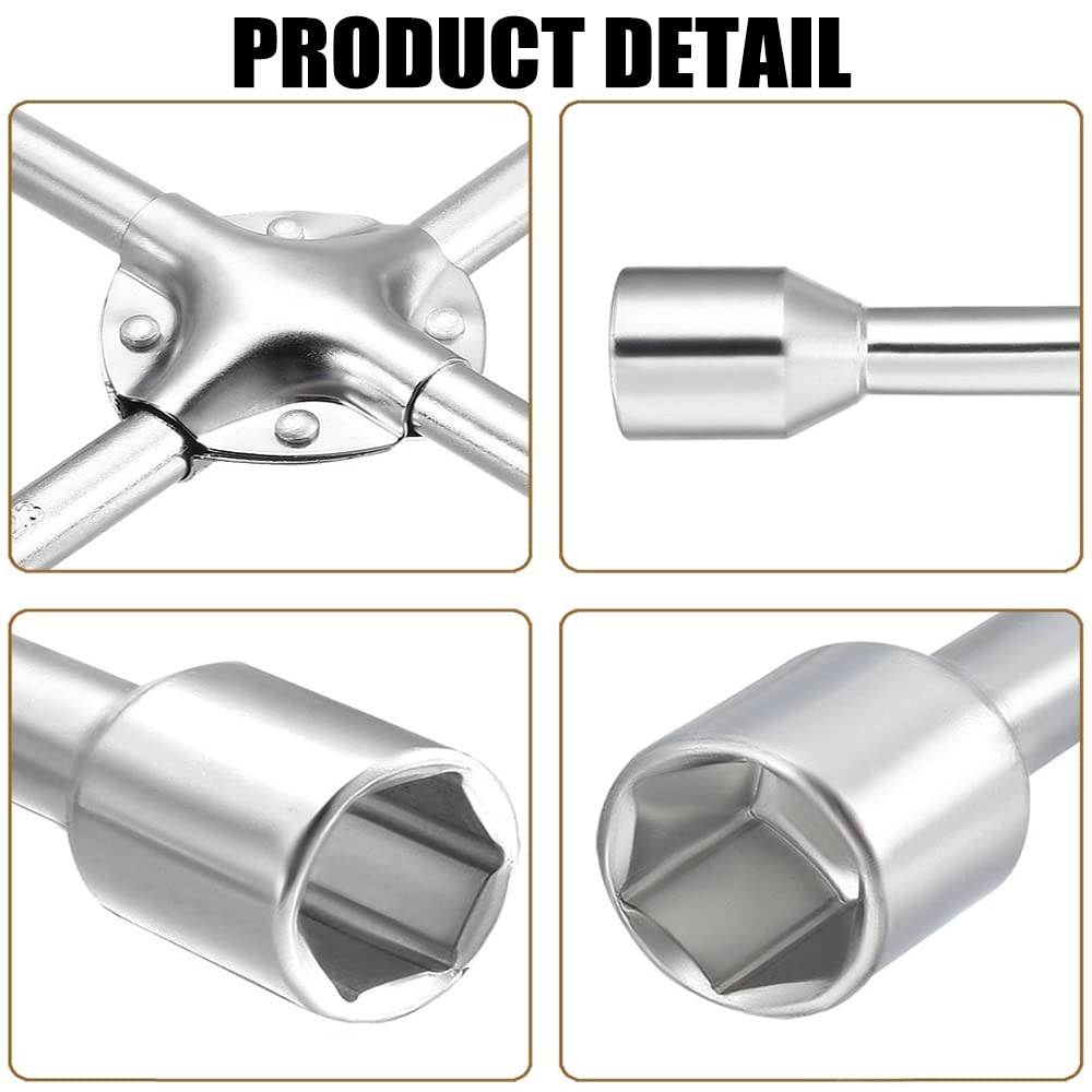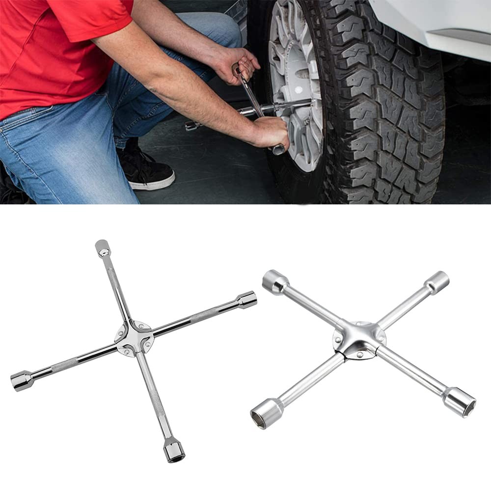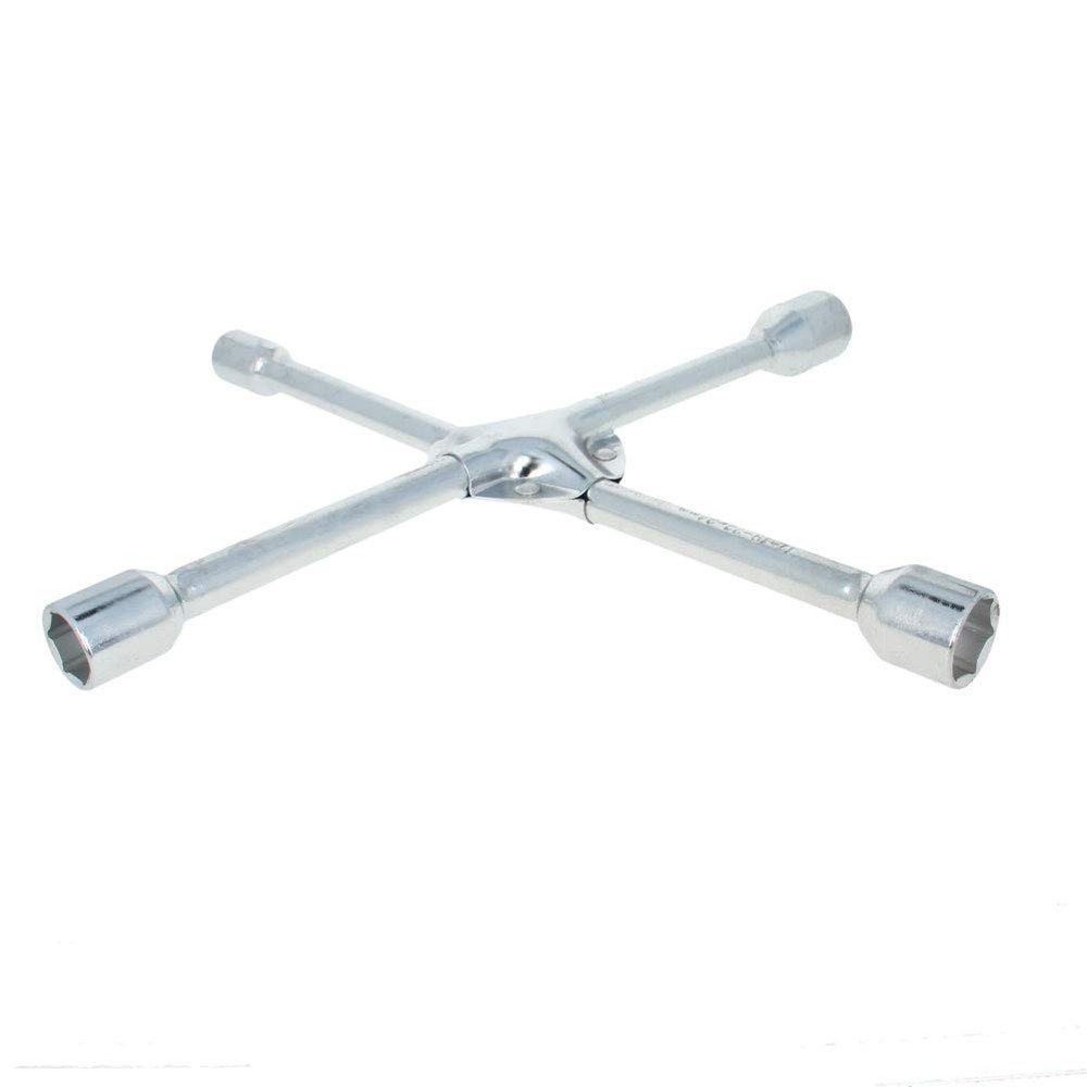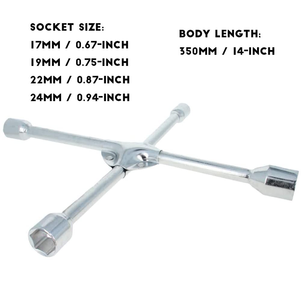 Lug Wrench - 14-inch Universal 4-Way Cross Spanner Detailed Description 1. 4 different socket sizes - 17mm / 0.67-inch, 19mm / 0.75-inch, 22mm / 0.87-inch, 24mm / 0.94-inch. 2. Four socket heads fit most common SAE and metric lug nut sizes. 3. Made of 45# steel, zinc plated surface treatment, strong and durable. 4. Extra protection centers for extra strength to break loose the most stubborn lug nuts. 5. The cross design is also naturally balanced to quickly spin nuts on and off long threaded studs. 6. Making Changing Tires Simple and Quick on the Road. Anti-slip design at handle. Specification Product Name: 4-Way Cross Spanner Material : 45# Steel Size: 17mm / 0.67-inch, 19mm / 0.75-inch, 22mm / 0.87-inch, 24mm / 0.94-inch. Color : Silver Tone Standard: 14-inch(350mm) Finish: Zinc plated Package Content * 1 x 4-Way Cross Spanner 【4 SOCKET SIZE】- 17mm / 0.67-inch, 19mm / 0.75-inch, 22mm / 0.87-inch, 24mm / 0.94-inch. 【DIMENSION】- 14-inch(350mm) body length for easy leverage. 【MATERIAL】- Made of 45# steel, zinc plated surface treatment, rust resistant and strong. 【6-POINT SOCKET】- Snugly fit hex-shaped lug nuts and help prevent slipping, especially when nuts are worn or rusted. 【CROSS DESIGN】- Extra protection centers for extra strength, allows for two-handed leverage to break loose stubborn nuts and the balance to quickly spin them.