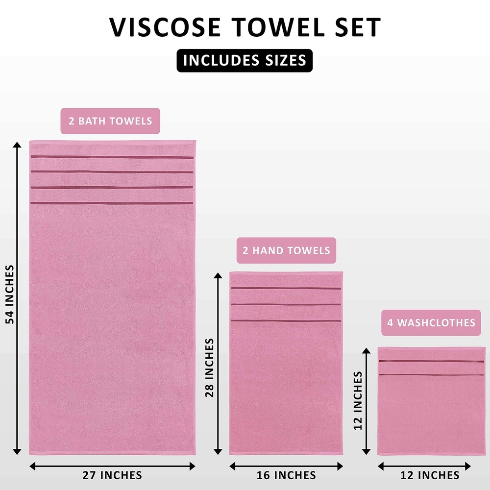 8 Piece Luxury Towel Set, 2 Bath, 2 Hand, and 4 Wash Cloths, 600 GSM Ring Spun Cotton, Highly Absorbent Viscose Stripe Towels, Ideal for Everyday use, Pink Set of 8 Towels - Includes 2 bath towels, each measuring 27 x 54 inch; 2 hand towels, each measuring 16 x 28 inch and 4 washcloths, each measuring 12 x 12 inch Highly Absorbent Towels - Our 600GSM high density towels are ultra-absorbent and fast drying. Gives your skin a soft and delicate touch while absorbing all traces of moisture efficiently 97% Cotton , 3% Viscose - These luxurious towels are made of 97% cotton & 3% Viscose giving you a super soft feel every time you use them. The surface is smooth and not easy to shed, adding to their durability Elegent Stripe Design - Elegantly designed viscose woven stripes have a brilliant shine and add to the luxurious look of the towels. They are sure to give your bathrooms, spas and kitchen a touch of sophistication Care Instruction - Machine wash the towels in cold water using delicate detergent and tumble dry on low setting; recommended to dry immediately. To prevent unforeseen color discoloration, it is advised, to avoid the removal of the application of any form of cosmetics, facial creams, or scrubs directly with the towel. 8-Piece Bath Linen Sets - Viscose Stripe Towels - 600 GSM Ring Spun Cotton - Highly Absorbent Luxury Towels (Pack of 8) Shipping We offer FREE shipping on all orders! We ship within Three business days of payment, usually sooner. We use a selection of shipping services such as UPS, FedEx, USPS etc. We only ship to the lower 48 states, no APO/FPO addresses or PO Boxes allowed. Local pickups and combined shipping options are not provided at this time. Return You can return a product for up to 30 days from the date you purchased it. Any product you return must be in the same condition you received it and in the original packaging. Please keep the receipt. Payment We accept payment by any of the following methods: PayPal Please pay as soon as possible after winning an auction, as that will allow us to post your item to you sooner! Feedback Customer satisfaction is very important to us. If you have any problem with your order, please contact us and we will do our best to make you satisfied. Contact Us If you have any queries, please contact us via ebay. We usually respond within 24 hours on weekdays. Please visit our eBay store to check out other items for sale! Thank you for shopping at our store.