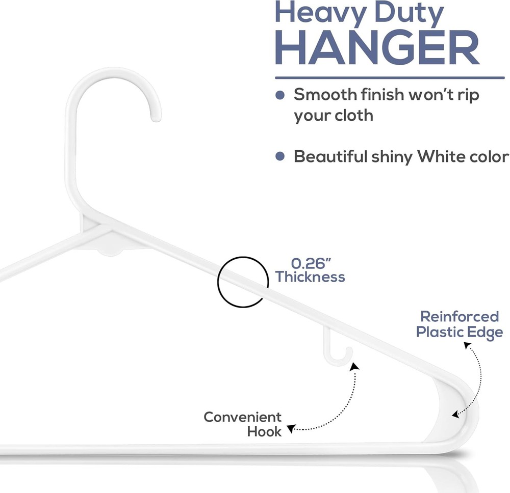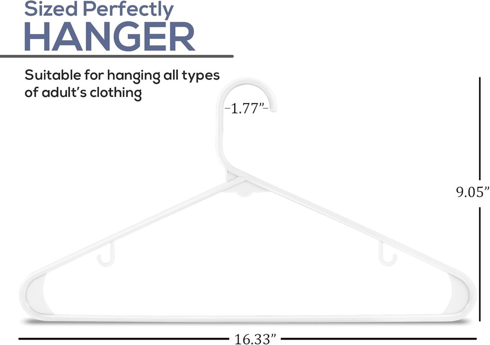 Utopia Home Plastic Hangers 30 Pack - Clothes Hanger with of 30, White Description Features: Plastic Hangers Pack - Pack of plastic hangers with each hanger measuring 16.33 x 0.26 x 9.05 Inches. Durable Coat Hangers - Made of strong and durable plastic that will last for long. Slim & Sleek Clothes Hangers - Slim and sleek design assists in maximizing closet space to hang a good number of clothes at a time while giving a neat and tidy look to it. Built-In Hooks- Each Clothes hanger has two hooks to keep your tops & clothing accessories handy Maximum Usefulness - Great for hanging shirts, t-shirts, blouses, Skirts, Coats and more. Perfect Skirt Hangers. Product Details: Color: White Brand: Utopia Home Material: Plastic Product Dimensions: 16.33"W x 9.05"H Special Feature: Clothes Hanger, Plastic Hangers, Durable, Heavy Duty, Space Saving Hangers Recommended Uses For Product: Clothing Number of Pieces: 30 Number of Items: 30 Shape: Rectangular Size: Pack of 30 Maximum Weight Recommendation: 10 Pounds Item Thickness: 0.26 Inches Manufacturer: Utopia Home Item Weight: 2.77 pounds Item model number: UH0325 Is Discontinued By Manufacturer: No Handling We will ship all orders within 3 business day of payment. Delivery We take pride in offering fast and reliable delivery for your orders! We are committed to getting your products to you as quickly as possible. Generally, we would like to inform you that all orders will be delivered to you within 1-3 business days after processing.However, in some cases, delivery times may vary depending on the buyer's location. Especially in remote or rural areas, the expected delivery time may be extended. In such situations, we do our best to ensure that your order reaches you as quickly as possible.If there are any delays, we will be happy to contact you to explain the situation. Our goal is to enhance your satisfaction with our fast delivery times. We work diligently to ensure that your order arrives safely.Trust us and enjoy our speedy delivery! Return Policy All items qualify for returns within 30 days of receipt. Buyer is responsible for return shipping on any item that is not damaged. Feedback We take our reputation seriously, we buy and sell online, so we understand the value of trust. If you are unsatisfied with your order, please contact us and we will work with you to resolve it to your satisfaction.