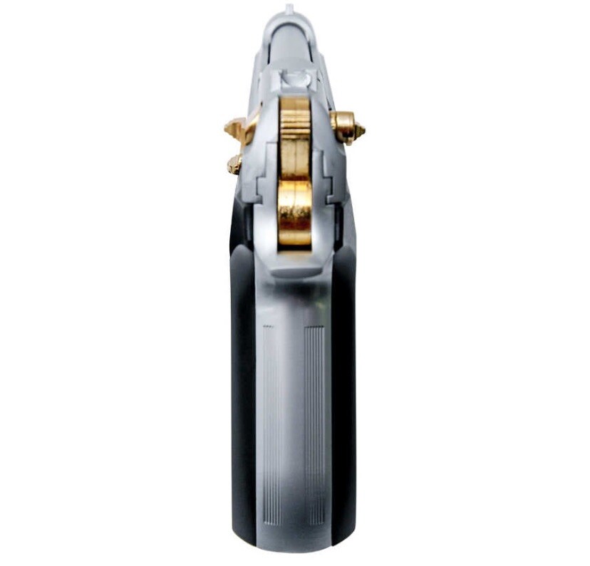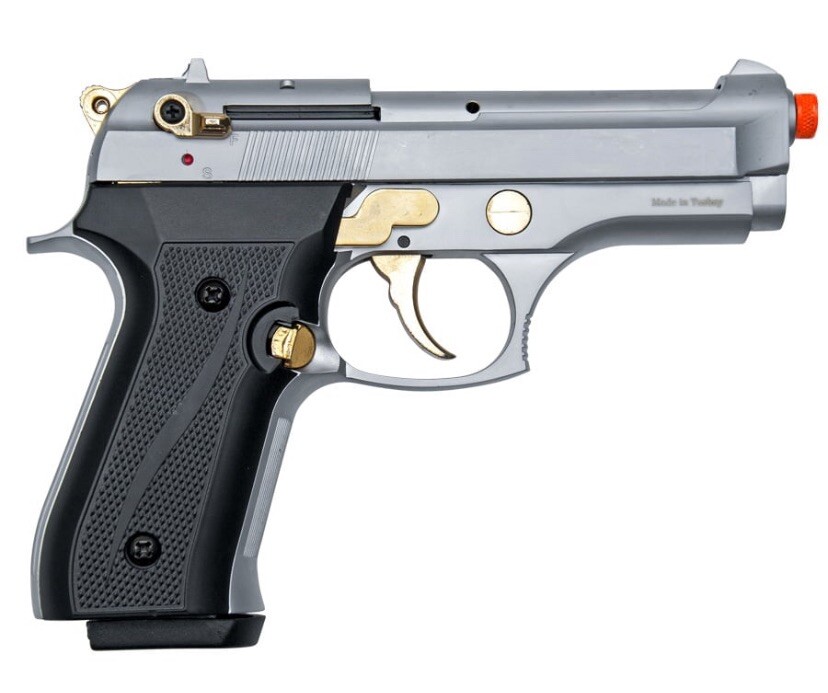This is a replica of the famous Compact 92F handgun. Our authentic, full sized, reproduction weighs like the original Features: Capacity: 10+1 Shots Weight: 2.3 lbs Length: 7.5" Finish: Nickel with Gold Fittings Caliber: 9mm Includes: 1 Magazine Hardshell case disclaimer: “This replica gun contains the colored markings required by law, including a permanently attached orange plug.”