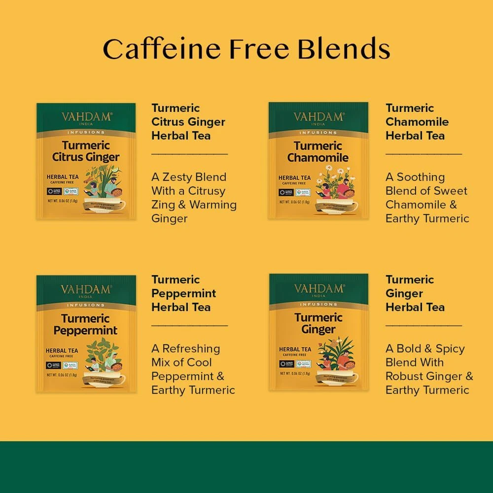 VAHDAM, Organic Turmeric Herbal Tea Sampler (20 Tea Bags, 4 Flavors) USDA Organic, Caffeine-Free, Gluten-Free | Assorted Tea Sampler - Citrus, Ginger, Chamomile and Peppermint | Tea Variety Pack Description Features: EXOTIC ASSORTED TURMERIC HERBAL TEA BLENDS: Introducing our the ultimate Herbal assortment box that packs tantalizing array of flavors - Turmeric Ginger, Turmeric Chamomile, Turmeric Citrus Ginger & Turmeric Peppermint. Each blend promises a unique and delightful journey for your taste buds, crafted with premium ingredients for an invigorating tea experience. PLASTIC-FREE TEA BAGS: Our Filter-Paper tea bags made from full wood pulp, free from micro-plastics, harmful chemicals and toxins, allowing you to enjoy your favorite Tumeric Ginger tea without concern for your health. A BRAND WITH A BILLION DREAMS - VAHDAM India is one of India's largest digitally native, global brands, shipping to over 3 million customers across 130+ countries. With an aim to bring India's finest Teas, Brew Ware, Spices & Herbs to consumers across the world under a home-grown, sustainable label with a strong commitment to people and planet. ETHICAL, DIRECT & FAIR-TRADE - Our innovative supply chain model ensures that you get the freshest cup of tea and our farmers get a better price for their produce. 1% of our revenue is redirected towards the education of our tea growers' children with our social initiative, Teach Me, simply wish to honour this aspiration. WE CARE FOR PEOPLE & PLANET - We are now a proudly carbon-neutral & a plastic-neutral brand. We measure our overall carbon & plastic footprint & offset it via our investments in environment sustainability initiatives in India. Product Details: Brand: VAHDAM Item Form: Teabags Flavor: Turmeric Tea Variety: Turmeric Unit Count: 1 Count Package Dimensions : 5.16 x 3.11 x 2.8 inches; 2.89 ounces UPC : Manufacturer : VAHDAM Country of Origin : India Handling We will ship all orders within 3 business days of payment. Delivery We do not ship outside of the Continental US. Feedback We take our reputation seriously, we buy and sell online, so we understand the value of trust. If you are unsatisfied with your order, please contact us and we will work with you to resolve it to your satisfaction.