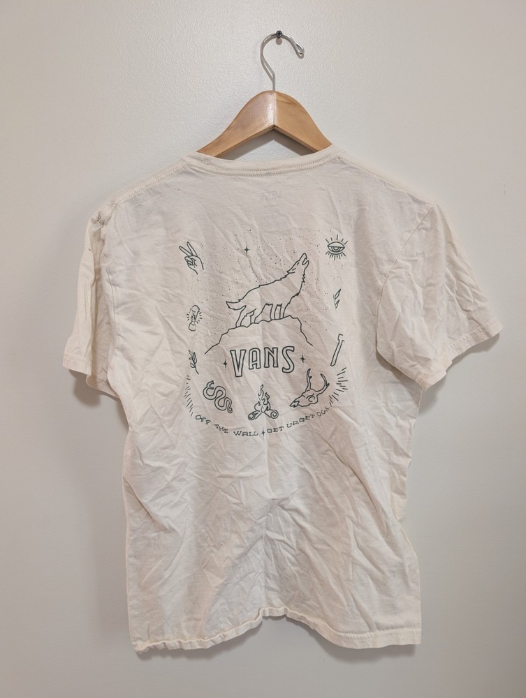 The VANS Men's T-Shirt in size medium is a stylish and versatile addition to any man's wardrobe. This short sleeve shirt features a graphic print design in off white with the iconic VANS logo as accents. Made from comfortable cotton knit fabric, it is machine washable for easy care. Perfect for all seasons, this beige t-shirt is suitable for summer, fall, and spring, making it a must-have for any man looking to add a trendy and casual option to their clothing collection.