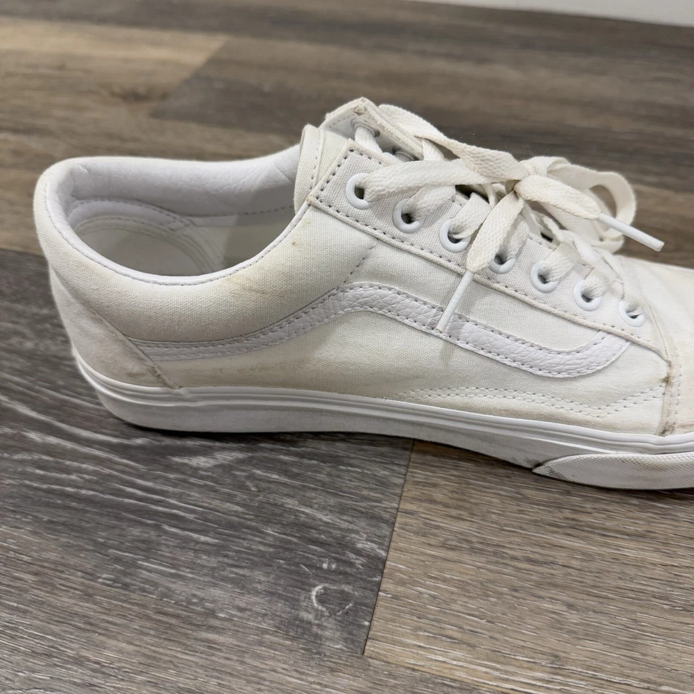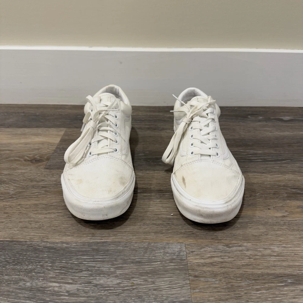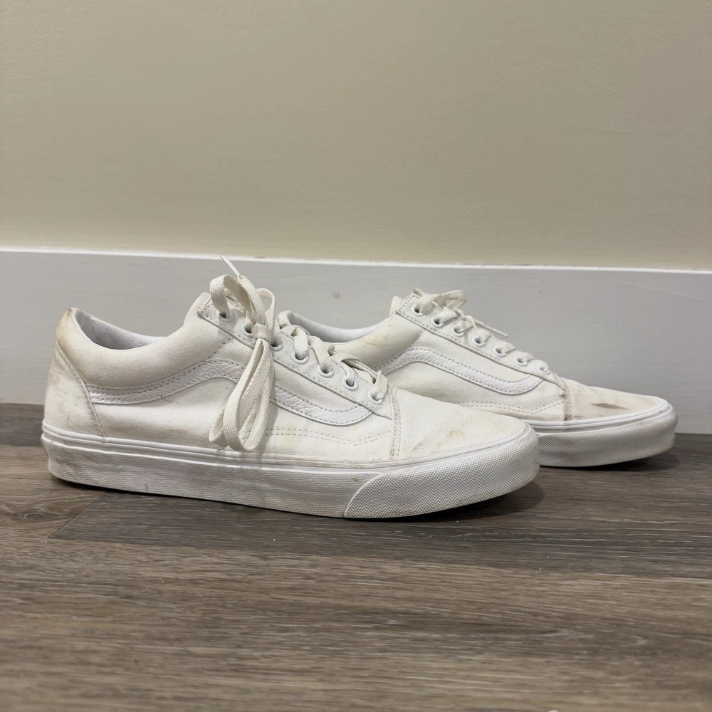 VANS * VANS Old Skool White Skate Sneaker Low Top Lace Up Size 10.5 Men’s/12 Woman’s * Used And Has A Couple Stains But In Very Good Condition * Shipped With USPS Priority Mail Please see photos for further details and let me know if you have any questions