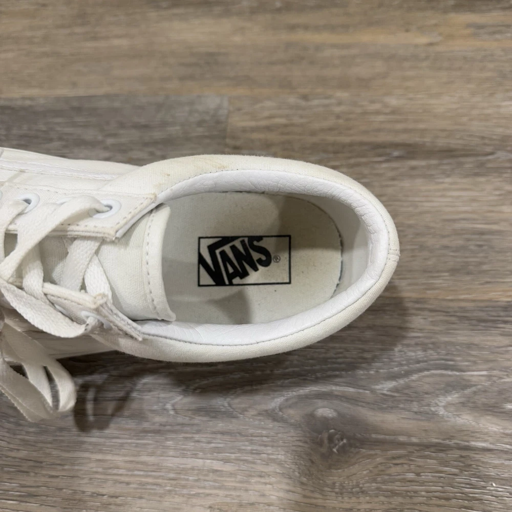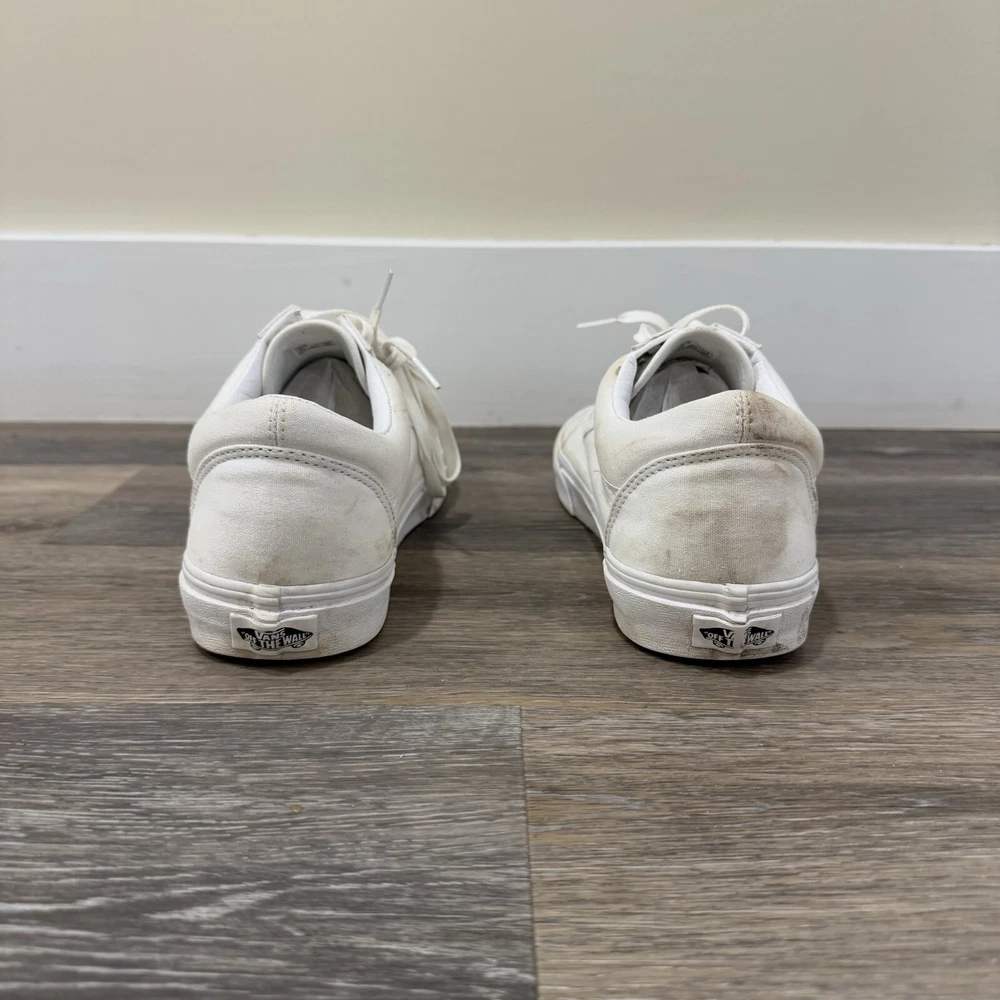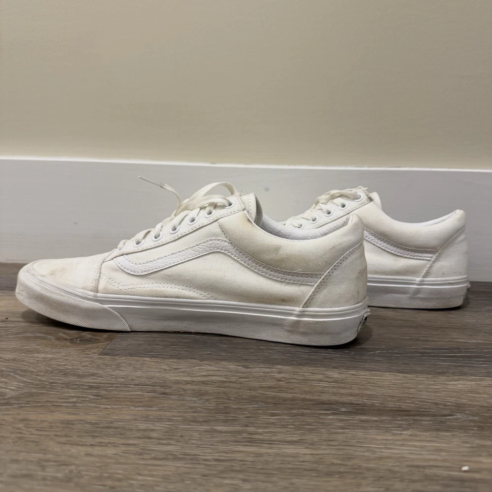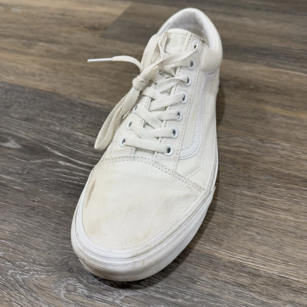 VANS * VANS Old Skool White Skate Sneaker Low Top Lace Up Size 10.5 Men’s/12 Woman’s * Used And Has A Couple Stains But In Very Good Condition * Shipped With USPS Priority Mail Please see photos for further details and let me know if you have any questions