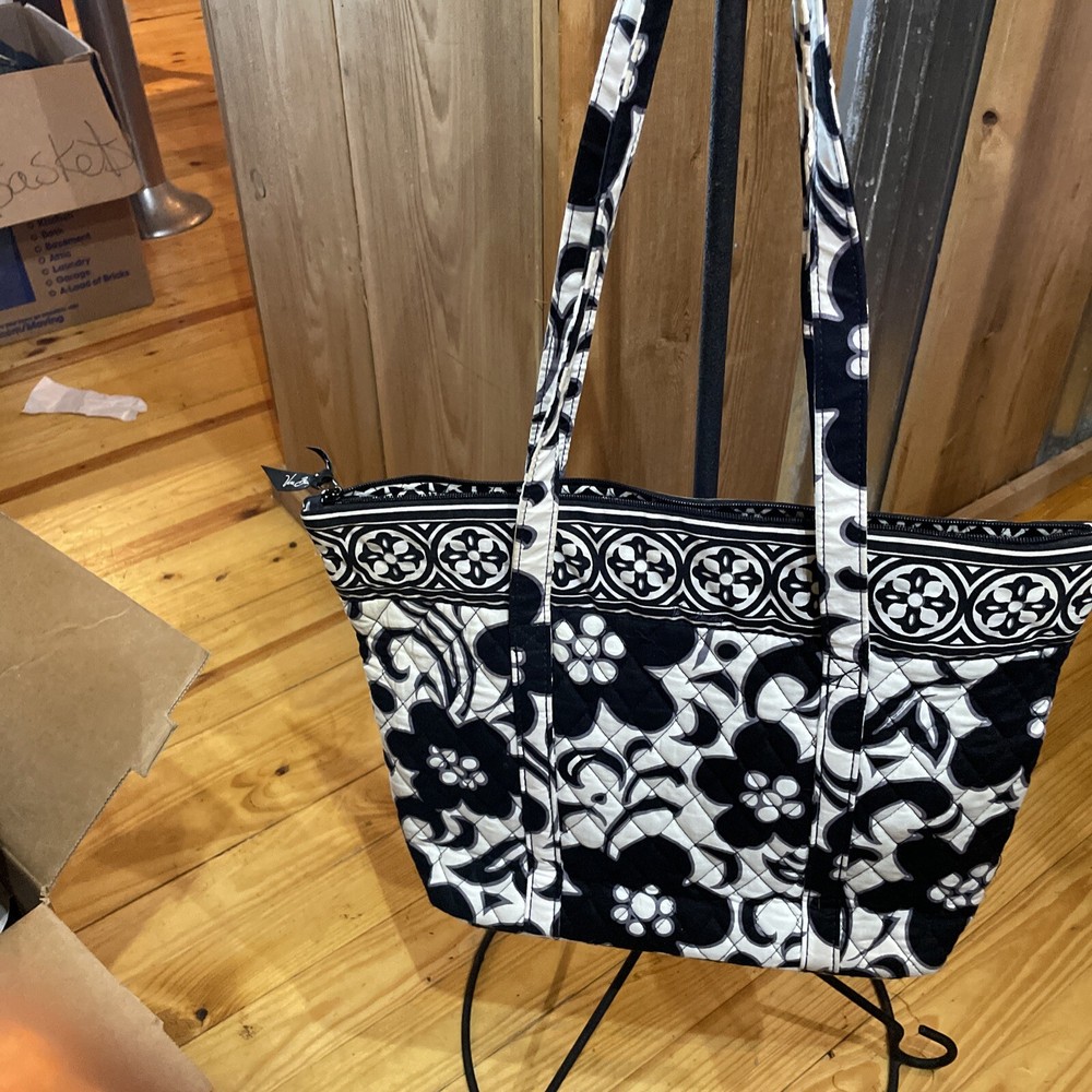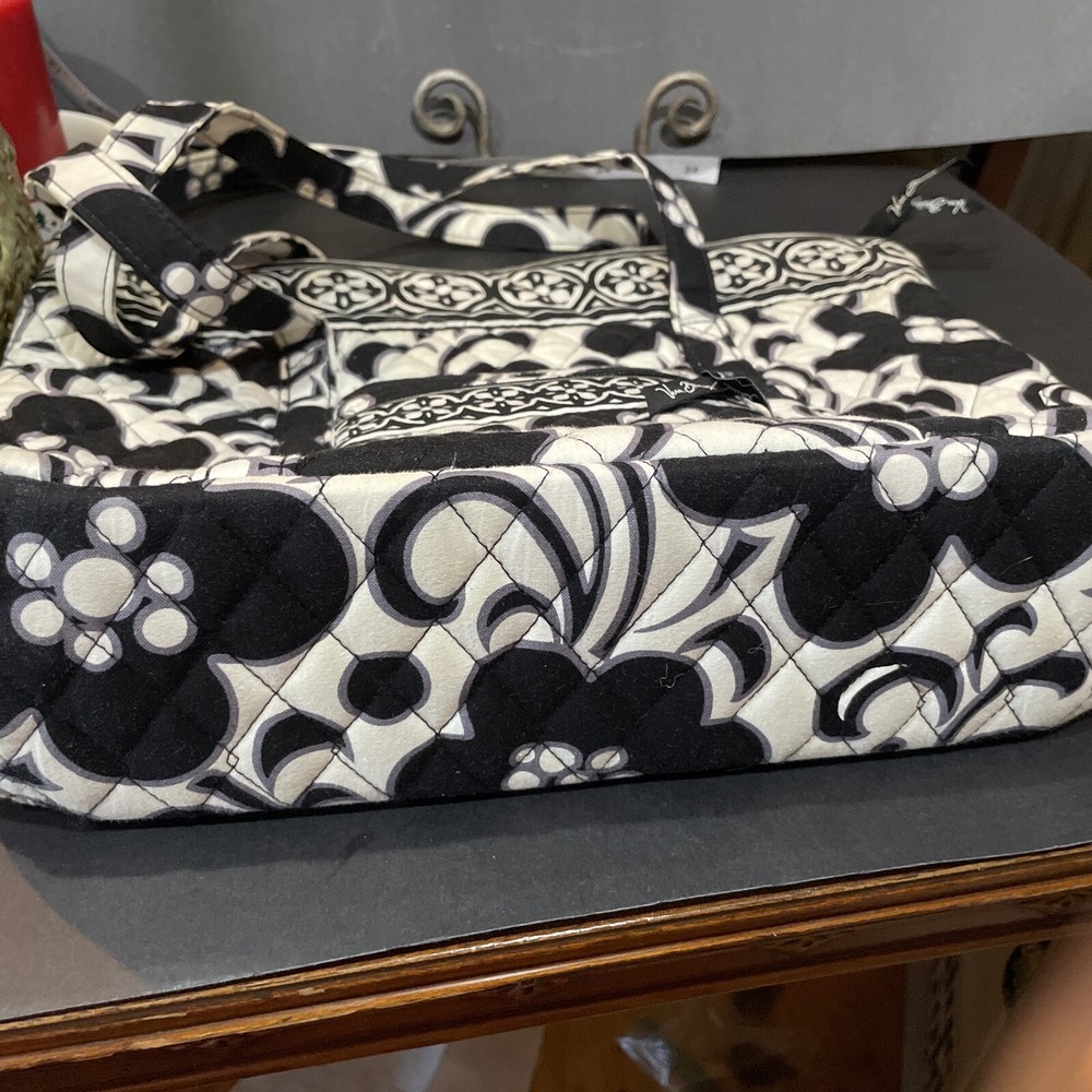 This stylish and functional Vera Bradley Night & Day Toggle Tote Bag is perfect for any woman who wants to stay organized on-the-go. The bag features a beautiful black exterior with a white floral pattern and quilted accents, including the brand's signature logo. The toggle closure ensures that your belongings are secure, while the double handles and adjustable strap provide versatile carrying options. The bag is spacious and features multiple inner pockets, including a mobile phone pocket, all lined with cotton and fabric. With a size of 14" in width, 13" in height, and 4" in depth, this large tote bag is ideal for carrying all your essentials. Whether you're heading to work, running errands, or going out with friends, this Vera Bradley Hipster bag is a stylish and practical choice.