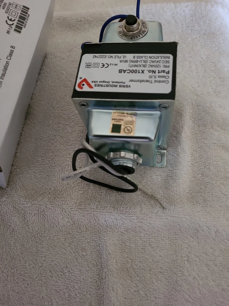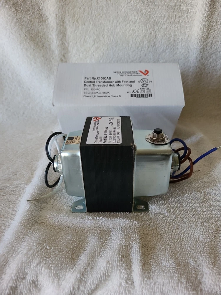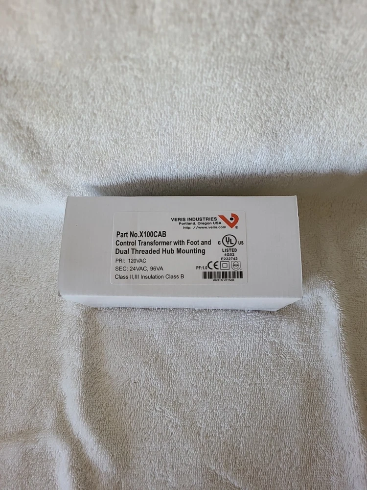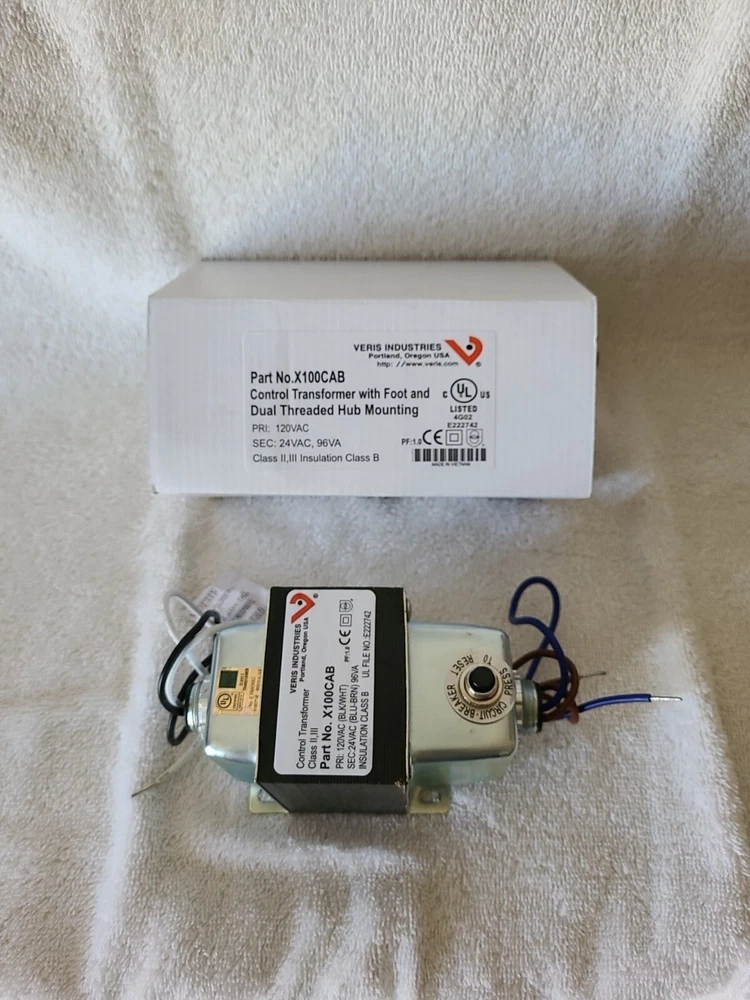 SPECIFICATIONS Power Consumption : 100 VA Supply Voltage AC Nominal : 120 VAC Secondary Voltage AC Nominal : 24 VAC Mounting : 2 Hub | 1 Foot Current Protection : Circuit Breaker Application : Building Automation Systems Insulation Class : 2 Model : X100CAB Operating Temperature : -40 - 149 °F (-40 - 65 °C) Product Type : Transformer Range : X series Product Certification : UL | CE Secondary Voltage AC Range : 24 VAC FEATURES Veris X series control transformers are a convenient source of control power for HVAC control and building automation applications. A wide variety of UL-listed transformers are available with single and dual threaded hub mounting options. Multiple current limiting options are available, including a circuit breaker in some models. Threaded hub options maximize installation flexibility UL listings for all models simplify panel building requirements Separated primary and secondary wire NEW Item comes as shown and only includes what is shown in the photos, please look the item over carefully prior to purchase Reference to Picture(s) before purchase of item(s) Sold as pictured