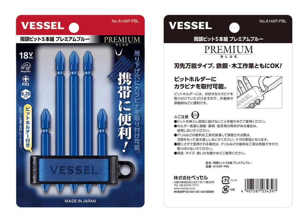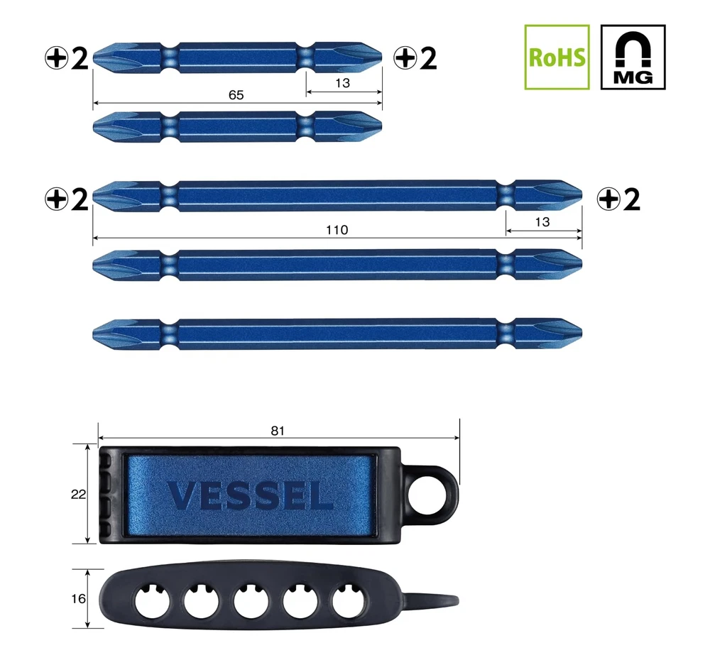 VESSEL Double-ended Bit Premium Set of 5 +2 x 65 2 pieces/+2 x 110 3 pieces (Blue) A145P-PBL Brand: VESSEL Material: Holder: PP, Bit: Special alloy steel Drive system: Cross Manufacturer: VESSEL About this product Limited color: Blue Contents: +2×65 x 2, +2×110 x 3 Shank diameter: 6.35mm Magnet included Country of origin: Japan ☆PRODUCTS☆ Please check the Photo ☆PAYMENTS☆ We accept PayPal and all major Debit / Credit Cards. We can only ship your item after your payment clears. We ship within 10 days of payment. ☆CHECKOUT☆ Please check your address before paying because we can ONLY ship to addresses that are entered before placing the order. We cannot change an address after the order has already been placed. ☆SHIPPING☆ Packages:Box and Bubblerup Packages usually leave our warehouse within 5-7 days of payment. Weekend orders will ship on Monday or Tuesday. We provide valid Tracking Numbers for all orders. ~~For Expedited shipping~~ For Expedited, the item will arrive in about 2-6 days after shipping. ~~For economy shipping~~ Economy shipping to the US (with some exceptions) will take approximately 7-12 business days to arrive after shipping. Even if you select economy shipping, it may be changed to Expedited instead of Economy depending on the size of the product or the size of the package. If it is changed to Expedited, there will be no additional charge, so please rest assured. Only for shipments to Australia, items will be shipped by Japan Post's EMS instead of FedEx (arrival schedule may change slightly) ☆International Packages:☆ We ship to all US Territories, Europe and Asia and Middle East and Australia and Canada including Guam All our international packages ship under the Fedex and Japan Post. ☆CUSTOMER SERVICE☆ If you have any questions or issues, we are at your service. You can email us anytime through eBay messages. ☆RETURN INFORMATION☆ We offer a standard FREE 30 days refund or exchange policy. Item must be returned in original condition in order to receive a full refund. ☆Customs duty☆ Import duties, taxes, and charges are not included in the item price or shipping cost. These charges are the buyer's responsibility. Please check with your country's customs office to determine what these additional costs will be prior to bidding or buying. We will reply to your question or invoice within 3 days. We can't not reply gifts or unreasonable requests such as declared amount.