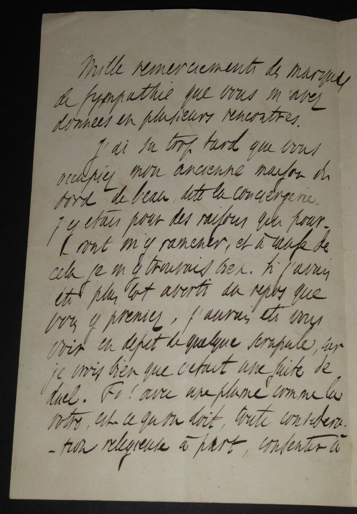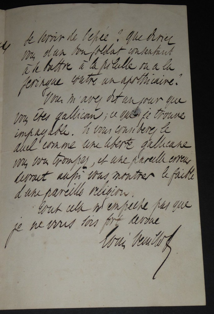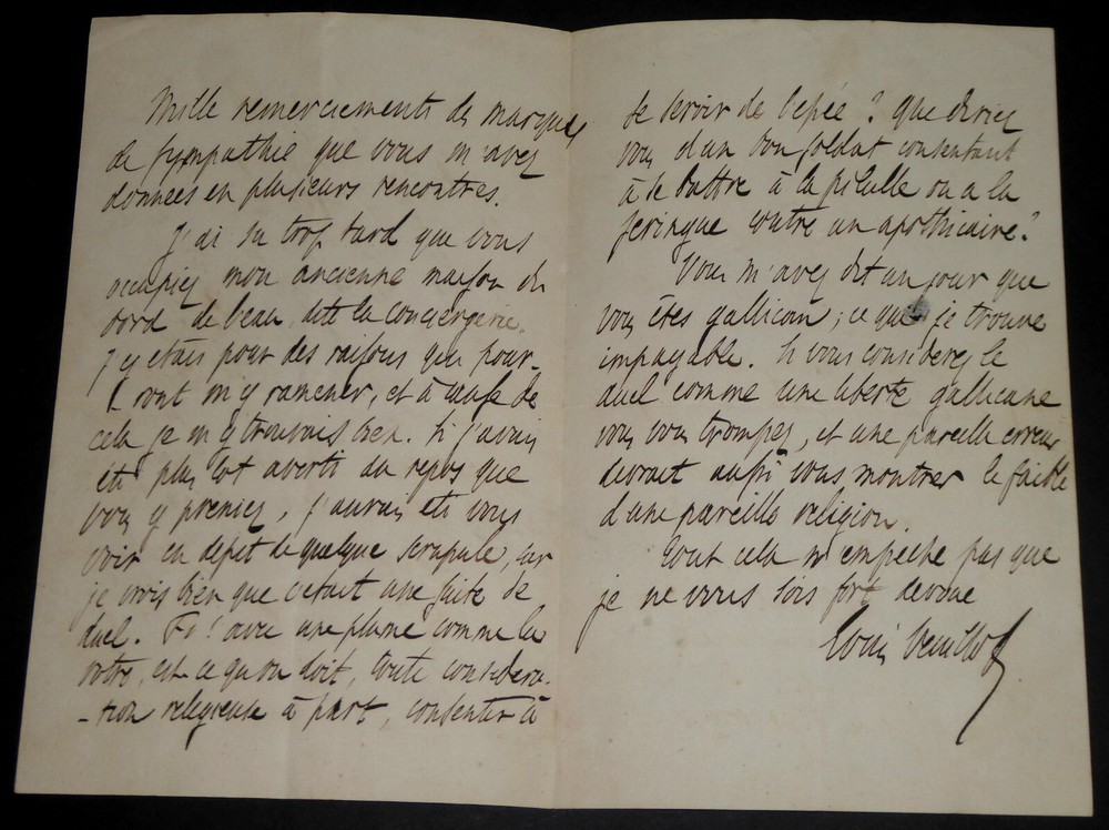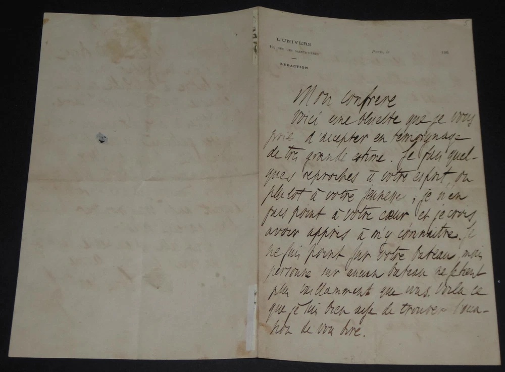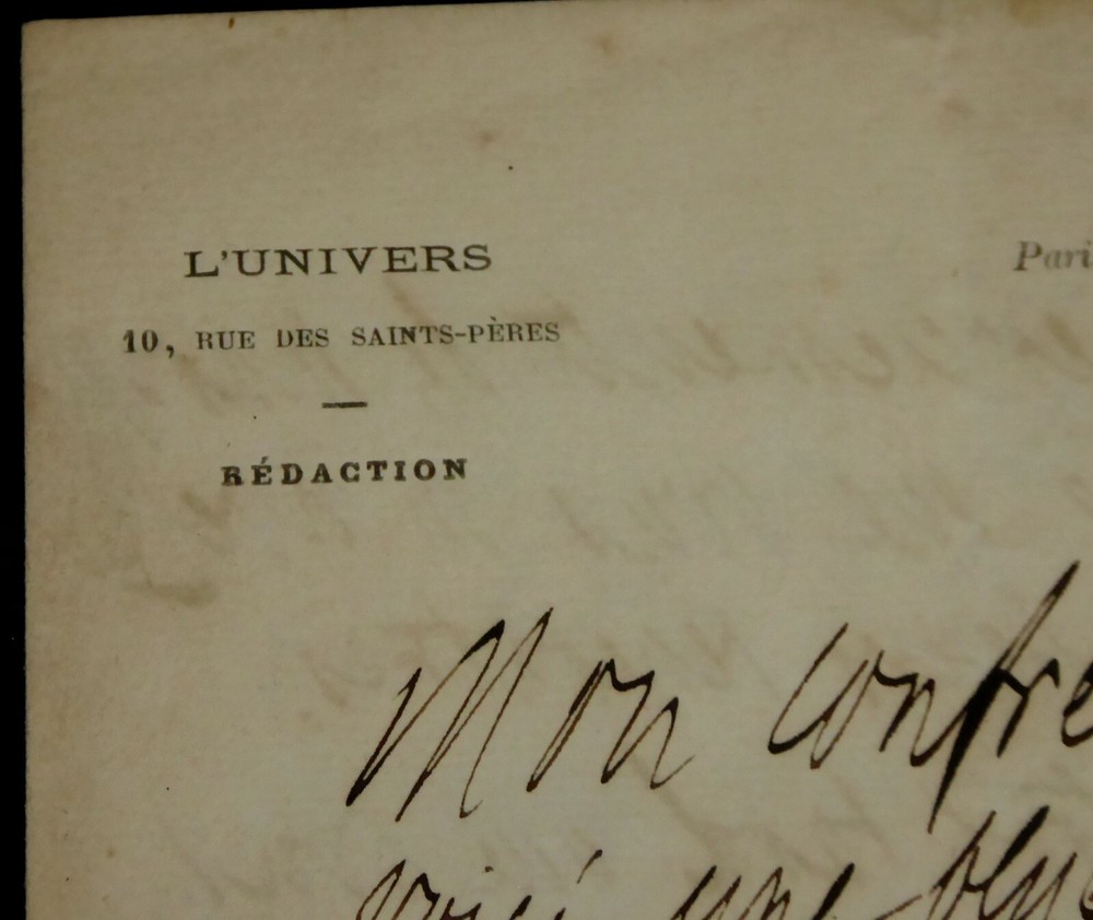Louis VEUILLOT. Lettre autographe signée. Il offre une Bluette ( Œuvre légère et sans prétention, empreinte de sentimentalisme). Il parle aussi de duel et de religion. Lettre en-tête de la rédaction du journal L'Univers. Dimensions : 12.5 x 19 cm. 3 pages. Etat : Présence de rousseurs et d'onglets. Sinon Bel état. Louis Veuillot, né à Boynes le 11 octobre 1813 et mort à Paris le 7 mars 1883, est un journaliste et homme de lettres français. Catholique passionné, il défend avec vigueur l'enseignement privé et reprend le journal L'Univers, qu'il dirige avec son frère Eugène Veuillot. Wikipédia Envoi soigné dans un emballage rigide et étanche. N’hésitez pas à visiter ma boutique et affiner vos recherches en fonction des catégories qui vous intéressent. Ma boutique L'Art Délivré. Lettres autographes, vieux papiers, livres anciens, photographies, gravures, timbres… Nous expertisons et/ou rachetons dans toute la France vos lettres, collections de lettres et livres anciens. Merci de votre visite. Jérôme KAYSER. Louis VEUILLOT. Lettre autographe signée. Il offre une Bluette (Œuvre légère et sans prétention, empreinte de sentimentalisme). Il parle aussi de duel et de religion. Etat : Présence de rousseurs et d'onglets. Sinon Bel état. Louis Veuillot, né à Boynes le 11 octobre 1813 et mort à Paris le 7 mars 1883, est un journaliste et homme de lettres français. Catholique passionné, il défend avec vigueur l'enseignement privé et reprend le journal L'Univers, qu'il dirige avec son frère Eugène Veuillot. Wikipédia N’hésitez pas à visiter ma boutique et affiner vos recherches en fonction des catégories qui vous intéressent. Ma boutique Lettres autographes, vieux papiers, livres anciens, photographies, gravures, timbres… Nous expertisons et/ou rachetons dans toute la France vos lettres, collections de l