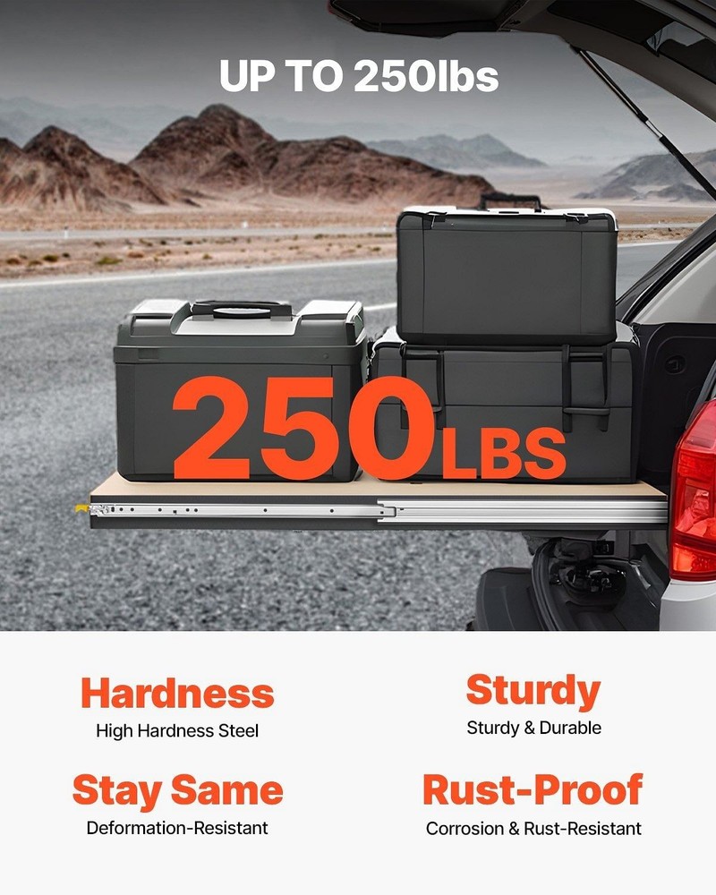 VEVOR Heavy Duty Drawer Slides 16inch, 1 Pair Locking Drawer Slides250lbs Load Capacity, Side Mount Ball Bearing, 3-Fold FullExtension 250 lbs Load Capacity Security Assured Sturdy and Durable Versatile Easy & Quick Assembly User-Friendly Design Suitable Drawer Length: 16.5" / 419 mm,Extension Length: 16" / 400mm,Load Capacity: 250 lbs / 113.4 kg,Item Model Number:5301/5301Z-16",Product Dimensions: 16 x 2.09 x 0.77" / 400 x 53 x19.5 mm (Without Lock), 17 x 2.09 x 0.77" / 432 x 53 x 19.5 mm(With Lock),Load Capacity (Fully Extended): 234 lbs / 106.14 kg,NetWeight: 4.63 lbs / 2.1 kg