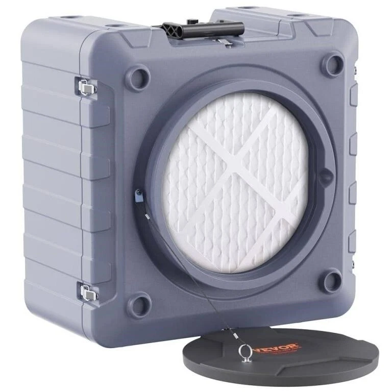 VEVOR's Air Scrubber is a robust addition to any space needing purification. With a 550 CFM airflow, it efficiently cleans the air of dust, pollen, and other particles. The unit features a 3-stage filtration system, including a MERV10 filter, activated carbon, and an H13 HEPA filter, ensuring that the air exiting the machine is clean and fresh. Designed for versatility, this portable air purifier is easy to move around as needed. It operates through an electrical power source and comes with a generous 23-foot power cord. The unit's dimensions, with a 15.5-inch air inlet and an 8.5-inch outlet, make it a practical size for a variety of settings. The gray color provides a sleek, contemporary look.