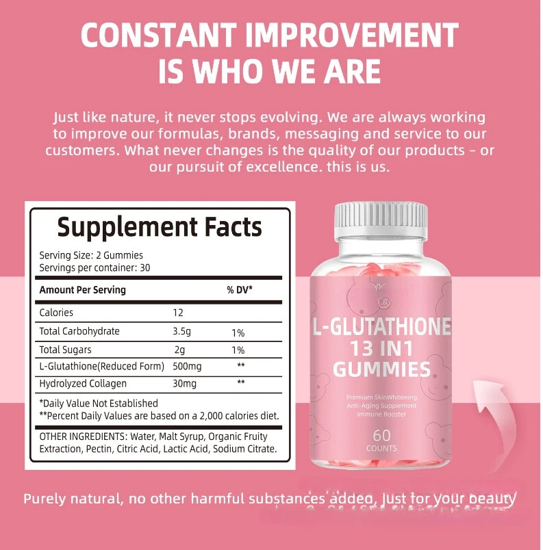 Features: 【Glutathione Collagen Gummies for Skin】: Here are new glutathione gummies with a unique formula, which can help reduce fine lines and wrinkles, and build your skin confidence! 【Boost Detoxification & Immune System】: Due to its rich detoxification properties, glutathione can detox your liver, and eliminate toxins from your body. Also, these gummies boost your immune system, you will feel better overall. 【Powerful Antioxidant】: Glutathione is one of the most antioxidants, it acts as a protector of cells. These glutathione supplements gummies help to combat free radicals and protect cells from damage. 【Delicious Glutathione Gummies】: No aftertaste, more easily absorbed, the glutathione gummies for skin are perfect for women and men. If you have difficulty swallowing pills, or capsules, you can try these gummies. It is surely an easy way to get the benefits of glutathione. 【Vegan & Non-GMO】: All the ingredients are natural, non-GMO, gluten-free, gelatin-free, vegan, no artificial flavors, no artificial preservatives and tested by 3rd party.
