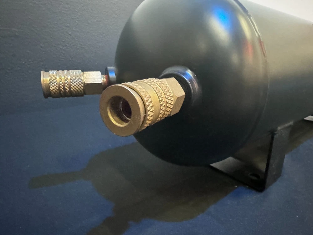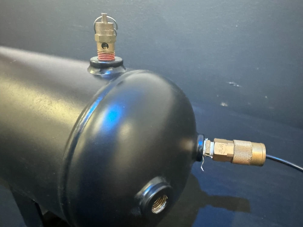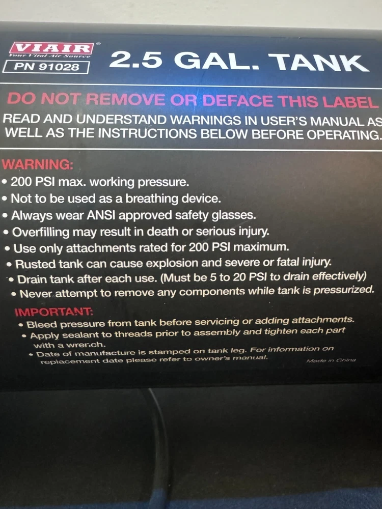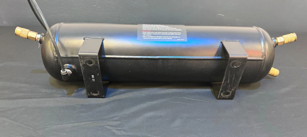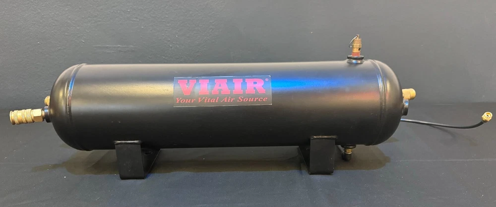2.5 gallon steel air tank. With 6 1/4" NPT Ports located on various sides of the tank and 200 PSI rated working pressure. Gently used in excellent condition. Comes with three attached quick release fittings. Allows you to Keep a Supply of Compressed Air Available. They're ideal for servicing air shocks and tires, operating air tools, or performing simple tasks around the garage and house. All VIAIR tanks are rated to either 150 or 200 psi maximum working pressure.
