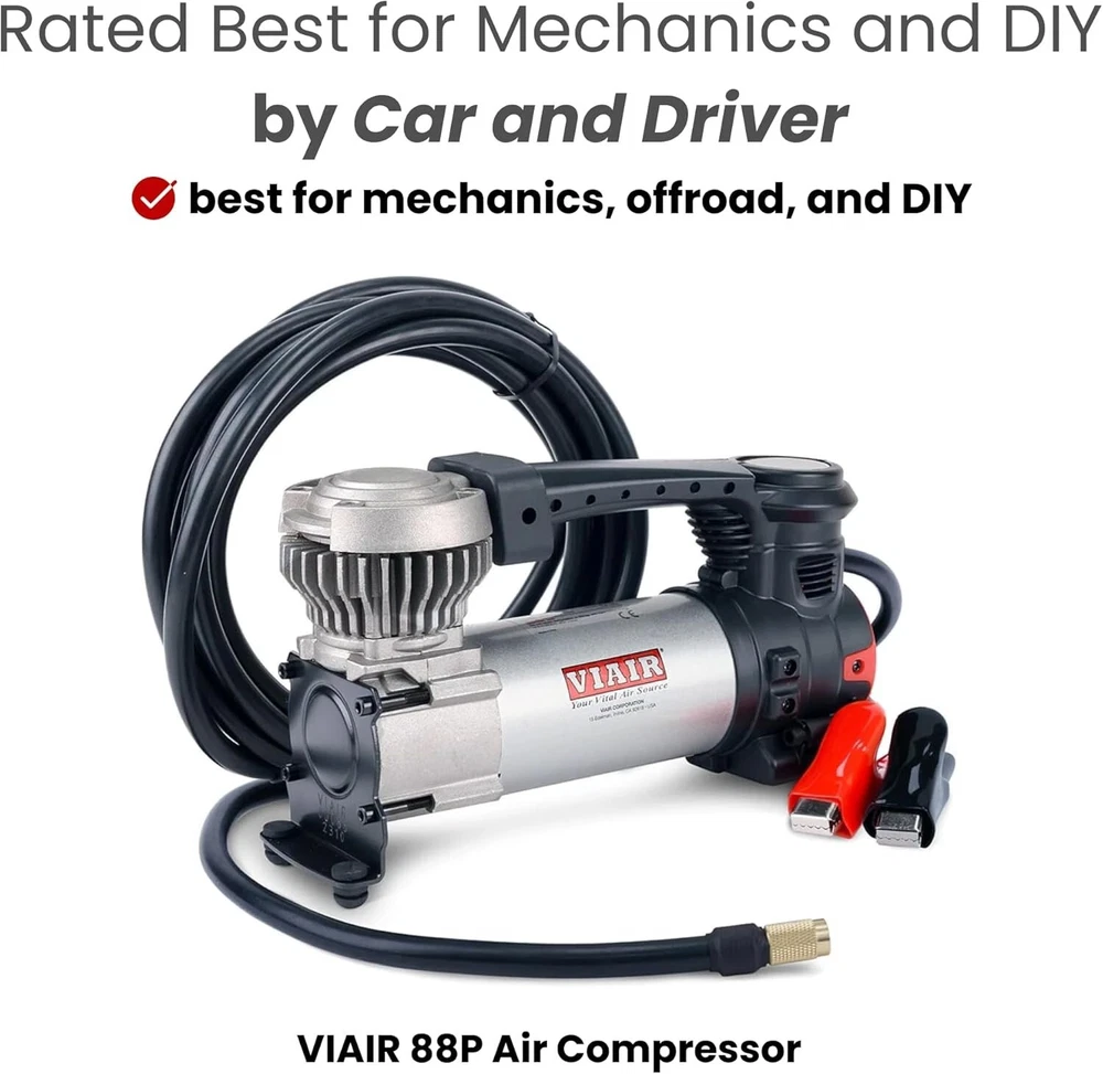 VIAIR 88P - 00088 Tire Inflator Portable On/Offroad Air Compressor For Car, Truck, SUV & RV | 12V Heavy Duty Pump 120 PSI, Alligator Clip, Twist Chuck The VIAIR 88P - 12 Volt Portable Air Compressor for Car Tires & More Enjoy peace of mind everywhere you go. The 88P tire pump for cars, trucks, SUVs, RVs and more is portable and lightweight, with a maximum dimension of 9.8 inches and weight of 4.75 pounds. Store it in your trunk, top box, or mount it to your vehicle for easy access and never be without air. Electric Car & Truck Tire Pump with Carrying Case Conveniently stored in a durable canvas carrying case with top handle, the 88P tire inflator air compressor is ready to use at any moment, whether you're at home, stopped on a busy roadway or out in the middle of nowhere. Compatible with All Vehicles From cars and trucks, to motorcycles and side-by-sides, this small air compressor is portable and powerful. Filling a 225/60/18 tire in 50 seconds or less, the 88P gets you back on the road in minutes, no matter what rig you drive. Fast & Easy to Use – No Programming Required Attach the alligator clips to your vehicle's battery terminals, start your engine, and power on the unit. Connect the air hose to your vehicle's tire. The 88P relies on a simple On/Off switch. Simply monitor the pressure gauge and fill to your desired pressure. From Road to Trail VIAIR's battery powered air compressor pumps are loved by daily commuters, families, and extreme off-road enthusiasts alike for their powerful, reliable performance in a small package. Choosing Between 12V Battery Clamps and Cigarette Lighter Plug: The Pros & Cons The choice between the 88P (with alligator clips) and 85P and 84P models (with cigarette plug) comes down to preference. The 88P's motor draws more current, so it had to be equipped with alligator clips that connect directly to your vehicle's battery. The cigarette lighter plug models draw less current and can be accessed from your car's interior. PORTABLE OFFROAD COMPRESSOR (Model: 88P, 120 PSI, 33" Tires): The 88P Portable Truck Air Compressor: Gear up for rugged trails with this robust 12V air compressor, designed with offroad enthusiasts in mind. Its heavy-duty, gearless motor and maintenance-free operation are perfect for tackling tough terrain. Ultra-compact and storable in its own carrying case, it's an essential tool for any off-road adventure, combining reliability with convenience. ON-THE-GO PERFORMANCE for VEHICLES, BIKES & SPORTS EQUIPMENT: Cars, Trucks, SUVs, Jeeps, Offroad Vehicles, 4x4s, Side-by-Sides, RVs, Motorcycles, Road Bikes, Mountain Bikes, Balls and Rafts. *Instructions: Attach the battery clamps to your vehicle’s battery and start the engine. Connect to a valve stem and turn the unit on. When required, use the included bicycle Presta valve adapter. INCLUDED COMPONENTS: 12V mini air compressor tire inflator has a 16 ft air hose, 10 ft power cord, built-in pressure gauge, deluxe carry bag, 3 inflation tips (3/16" nozzle, 5/16" nozzle, and needle adapter) stored on compressor, and Presta valve adapter. Unique Features: LED work light, solid brass twist-on tire chuck. HIGH CAPACITY SPECS for LARGE TIRES: Small electric air compressor operates on 12 volts, delivers a maximum working pressure of 120 PSI with a duty cycle of 25 minutes at 30 PSI; Free flow capacity: 1.47 CFM. Maximum Recommended Tire Size: 33". Fills a 225/60/18 tire from 20 to 30 PSI in 50 seconds or less and is 85% faster than leading competitors. Dimensions: 9.8″L x 3.2″W x 5.6″H; 4.75 lbs. DEPENDABLE QUALITY WITH VIAIR: For over 25 years, our American owned and operated company has provided top-quality portable air compressors & inflators. Our commitment to continuous testing and refinement results in long-lasting performance. I do not accept addresses of logistics companies and P.O. Box.