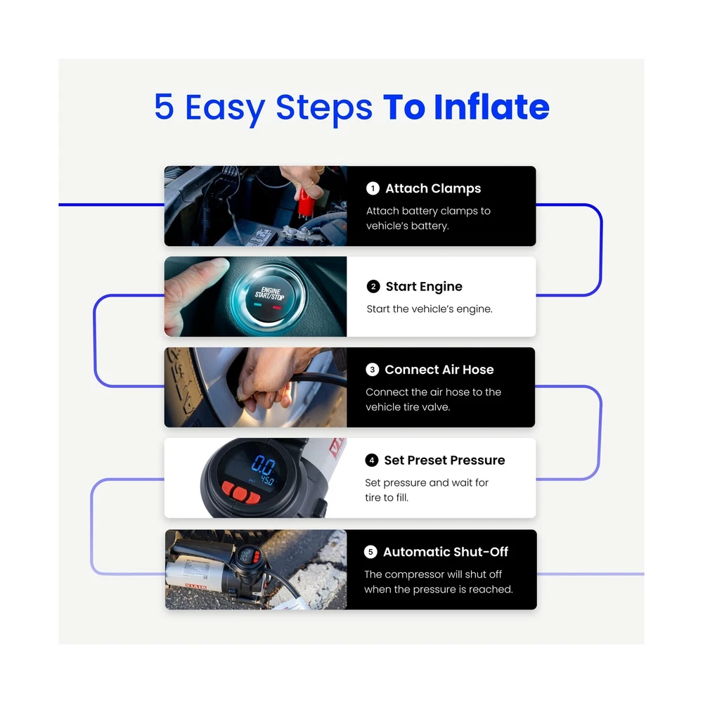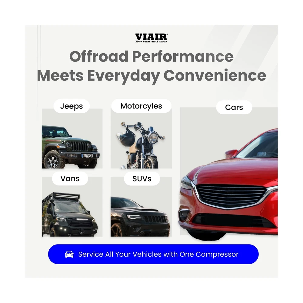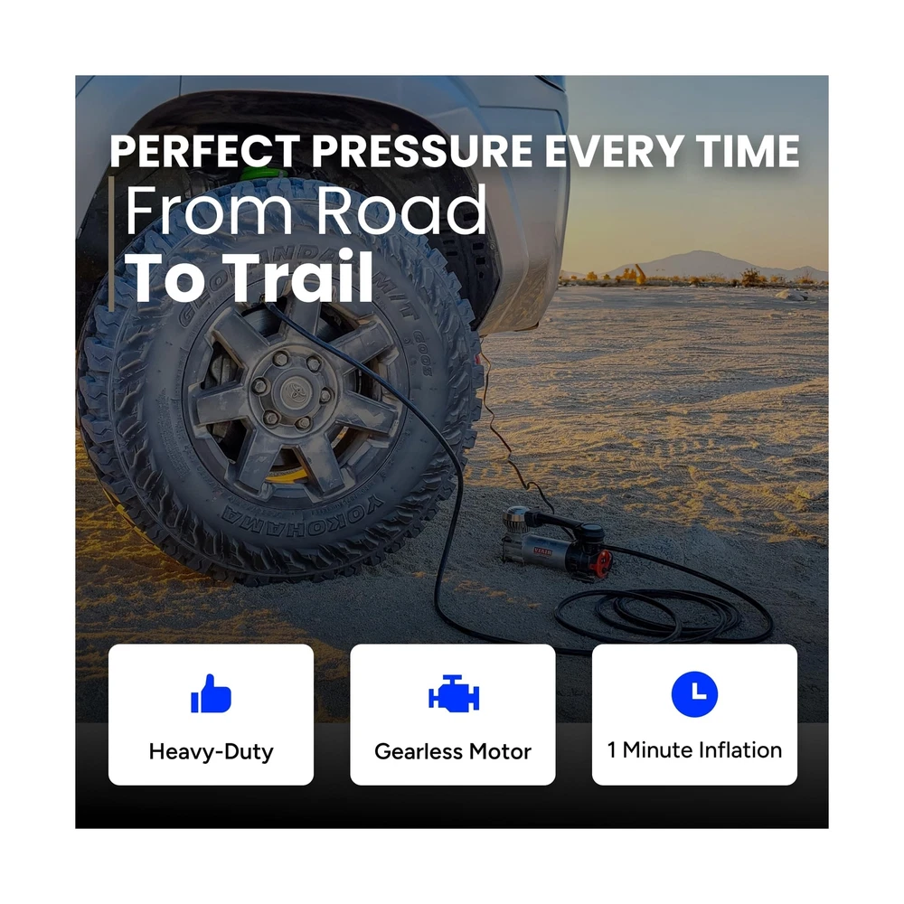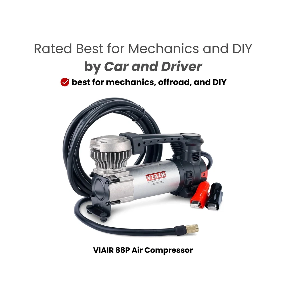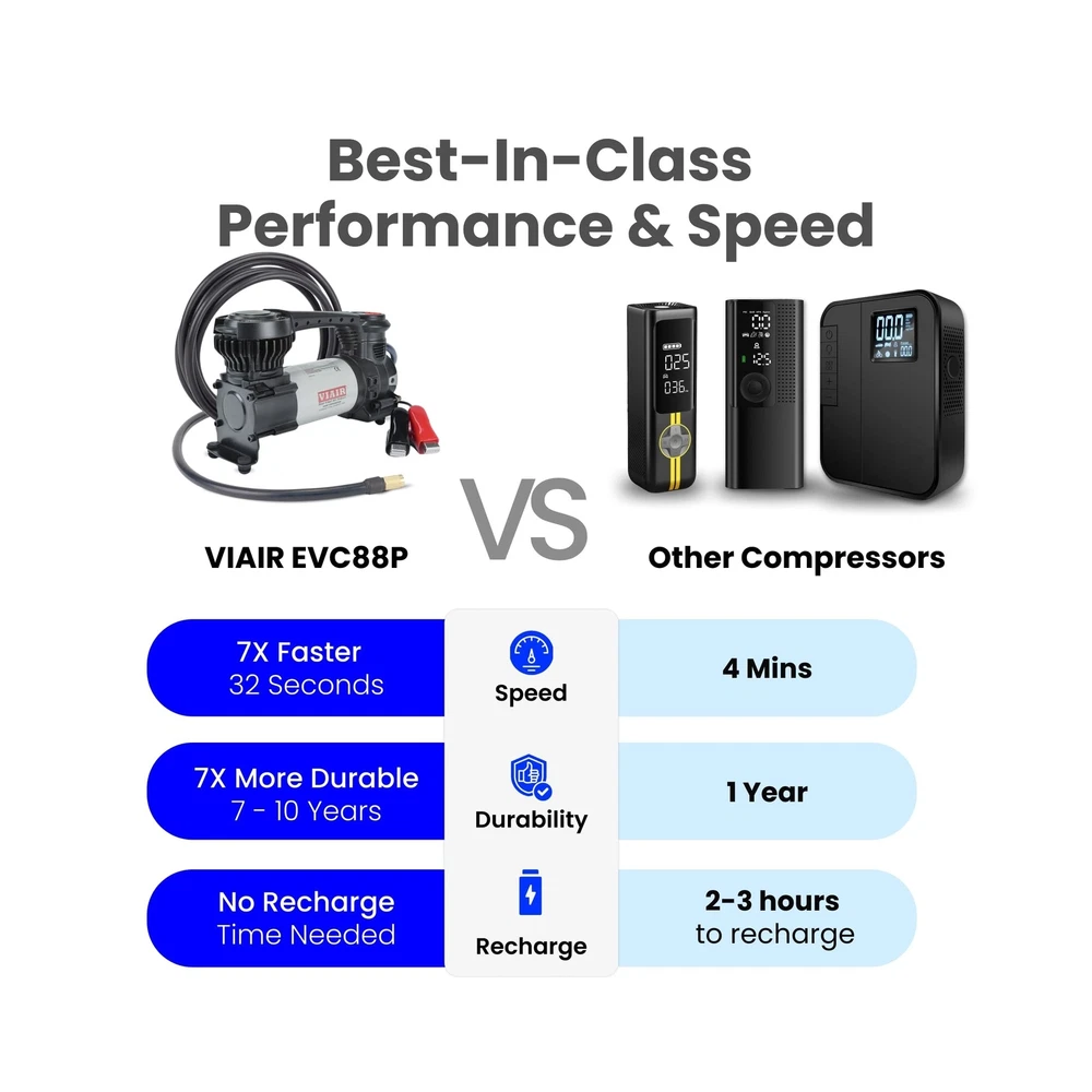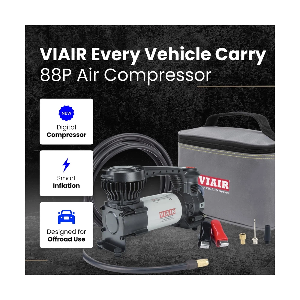"The Every Vehicle Carry 88P - Digital 12 Volt Portable Air Compressor for All Vehicles The new and improved version of the customer favorite 88P delivers a digital gauge and preset pressure for easier than ever functionality. Portable and lightweight, with a maximum dimension of 9.8 inches and weight of 4.75 pounds, it can be stored in the trunk, top box, or mount it to your vehicle. 5-Step to Air Up with Preset Pressure Feature (1) Connect the alligator clips to the battery under your vehicle's hood. (2) Start your engine. (3) Attach the chuck to the tire valve. (4) Set the desired pressure and wait for the tire to inflate. (5) The portable tire air pump will automatically shut off when the desired pressure is reached. Designed for Offroad Use - Compatible with All Vehicles From cars and trucks, to motorcycles and side-by-sides, this small air compressor is portable and powerful. Filling a 225/60/18 tire in 50 seconds or less, the EVC88P gets you back on the road in minutes, no matter what rig you drive. Electric Car & Truck Tire Pump with Carrying Case Conveniently stored in a durable canvas carrying case with top handle, the EVC88P tire inflator air compressor is ready to use at any moment, whether you're at home, stopped on a busy roadway or out in the middle of nowhere. Ultra Portable with Canvas Carrying Case The EVC88P small, electric car & truck tire pump has a maximum dimension of 9.8 inches and weight of 4.75 pounds. Store it in your trunk or mount to your vehicle for easy access and never be without air. Conveniently stored in a durable canvas carrying case with top handle, the EVC88P tire inflator air compressor is ready to use at any moment, whether you're at home, stopped on a busy roadway or out in the middle of nowhere. " DIGITAL COMPRESSOR for OFFROAD VEHICLES - The new and improved version of the customer favorite 88P is designed for offroad enthusiasts. With the same 12V heavy-duty, gearless motor, the Every Vehicle Carry 88P now features a digital gauge and preset pressure with automatic shut-off feature for ultra-fast fill-ups. HOW TO USE PRESET PRESSURE: (1) Connect the alligator clips to the battery under your vehicle's hood. (2) Start your engine. (3) Attach the chuck to the tire valve. (4) Set the desired pressure and wait for the tire to inflate. (5) The portable tire air pump will automatically shut off when the desired pressure is reached. INCLUDED COMPONENTS: 12V mini air compressor tire inflator has a 16 ft air hose, 10 ft power cord, built-in pressure gauge, deluxe carry bag, 3 inflation tips (3/16" nozzle, 5/16" nozzle, and needle adapter) stored on compressor, and Presta valve adapter. HIGH CAPACITY SPECS for LARGE TIRES: Small electric air compressor operates on 12 volts, delivers a maximum working pressure of 120 PSI with a duty cycle of 25 minutes at 30 PSI; Free flow capacity: 1.47 CFM. Maximum Recommended Tire Size: 33". Fills a 225/60/18 tire from 20 to 30 PSI in 50 seconds or less. Dimensions: 9.8″L x 3.2″W x 5.6″H; 4.75 lbs. DEPENDABLE QUALITY WITH - For over 40 years, our American owned and operated company has provided top-quality portable air compressors & inflators. Our commitment to continuous testing and refinement results in long-lasting performance.