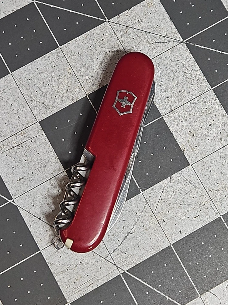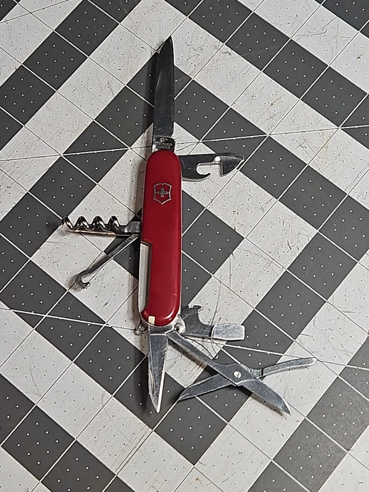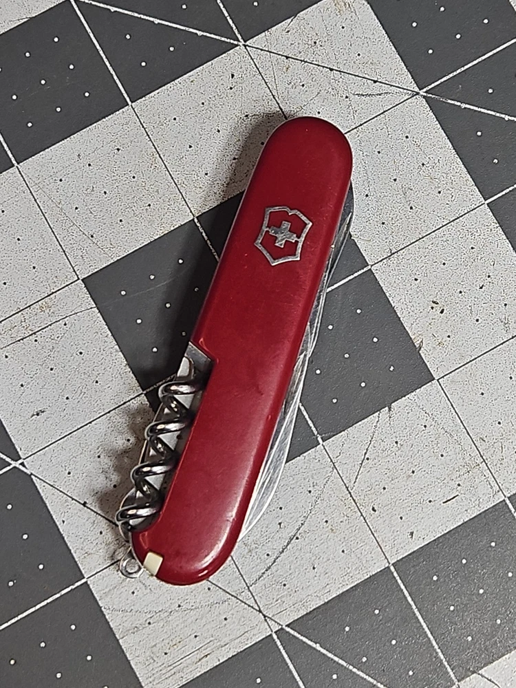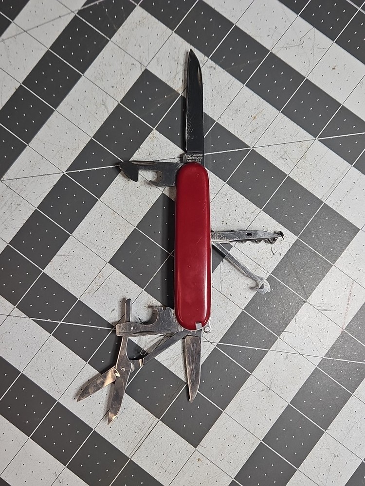 VICTORINOX "Huntsman" Swiss Army Knife 15 Functions Officier Suisse GUC Worn Good used condition. Light wear from age and use. Markings from age and use. See pictures Product will be shipped timely and packaged with care. Offers are encouraged. Please feel free to reach out with questions. Please see pictures. Thank you. The VICTORINOX Huntsman Swiss Army Knife is a 15-function tool that is perfect for any outdoor enthusiast. It features a manual opening mechanism and three blades made of high-quality plastic. The red handle adds a pop of color to the knife, making it easy to find in a crowded toolbox. This knife is a great addition to any collection and is sure to impress. HLB2 hunts